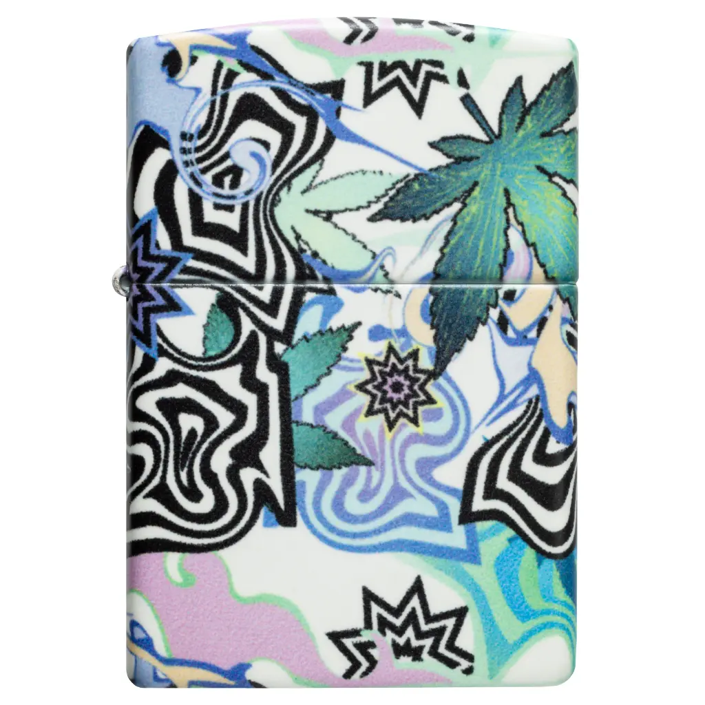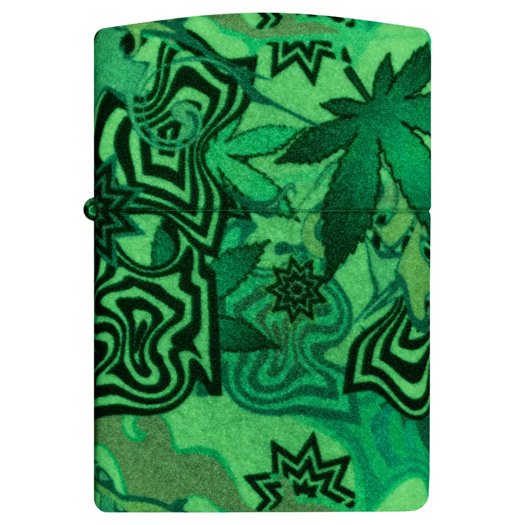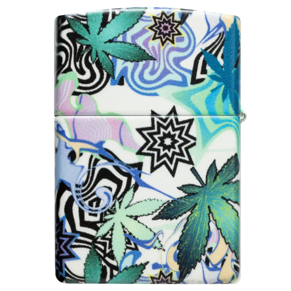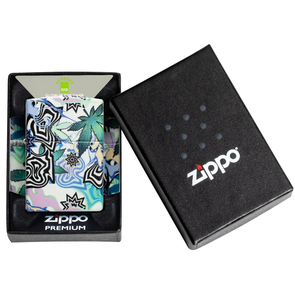 Cast in soothing, muted tones, mesmerizing spirals and bold cannabis leaves surround this 540 Color lighter, which glows in the dark thanks to our specialty finish. Comes packaged in a gift box. For optimal performance fill with Zippo lighter fuel.