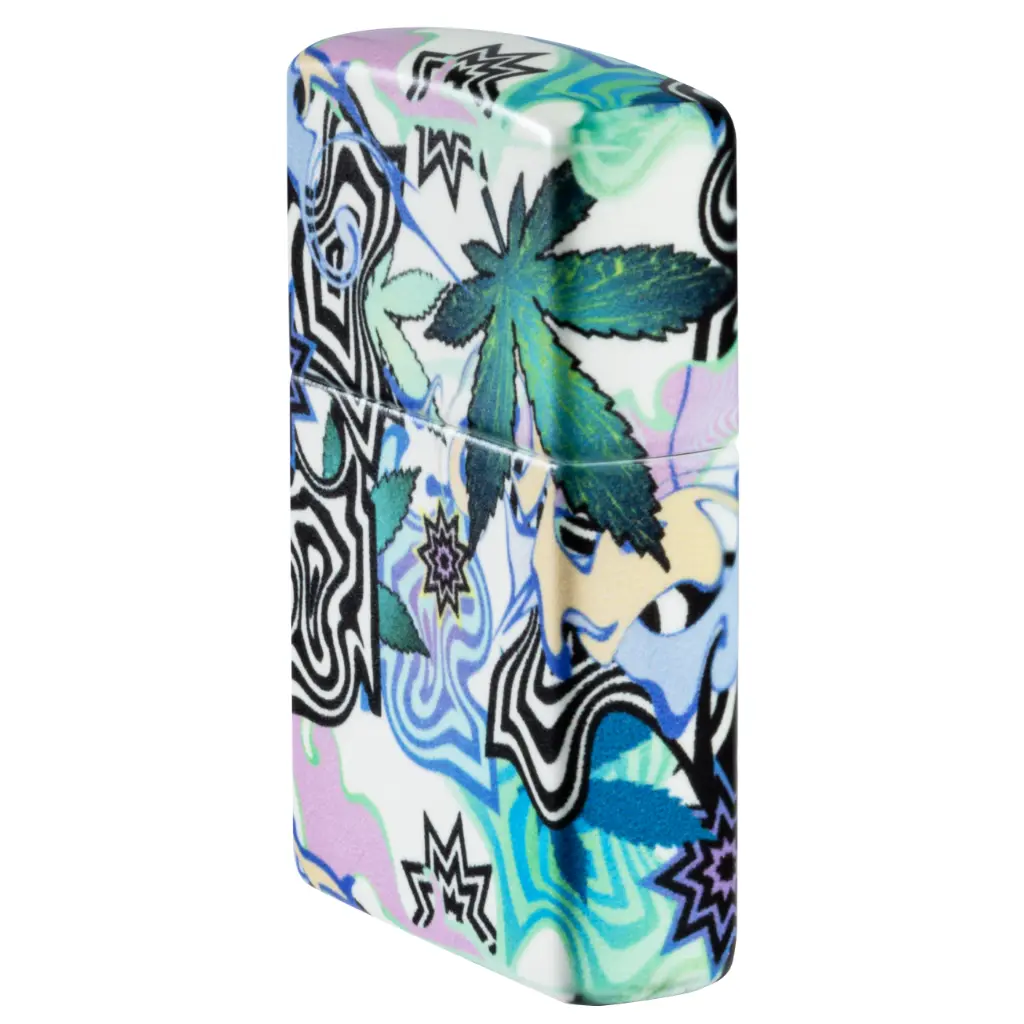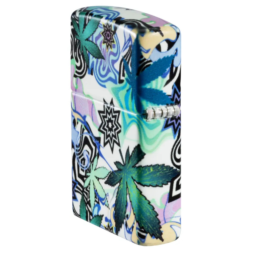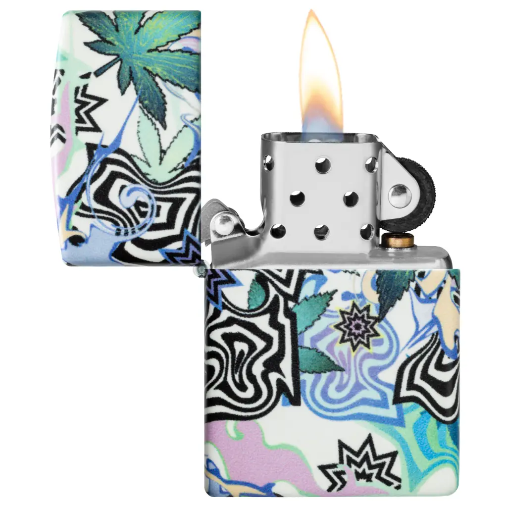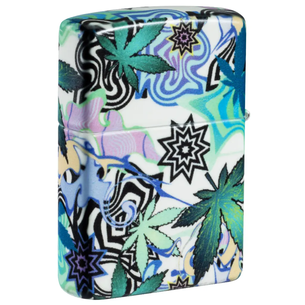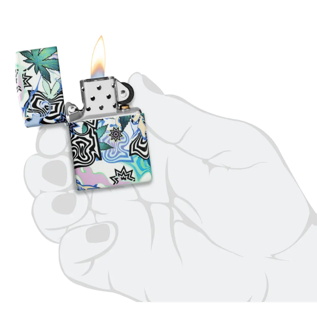 Cast in soothing, muted tones, mesmerizing spirals and bold cannabis leaves surround this 540 Color lighter, which glows in the dark thanks to our specialty finish. Comes packaged in a gift box. For optimal performance fill with Zippo lighter fuel.
