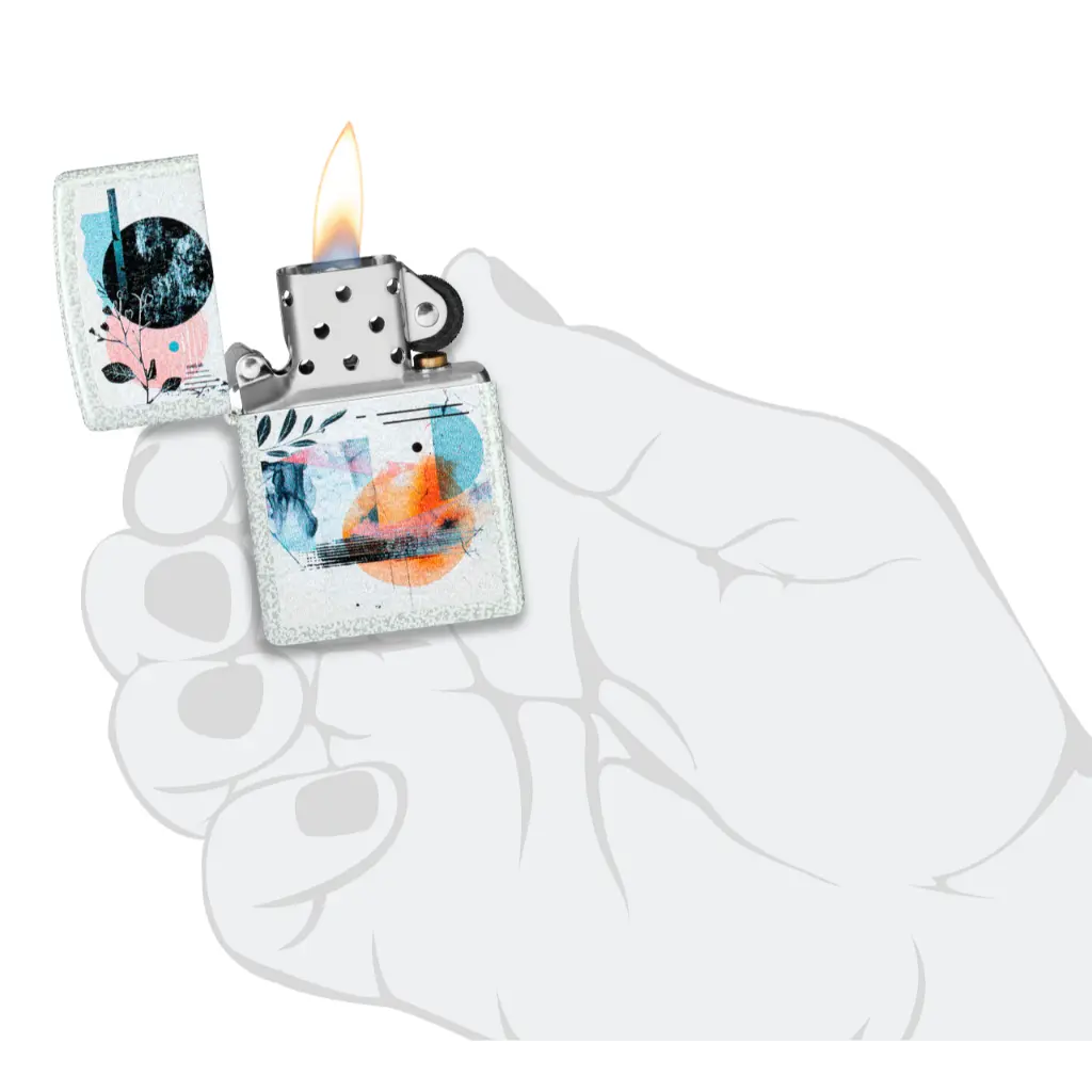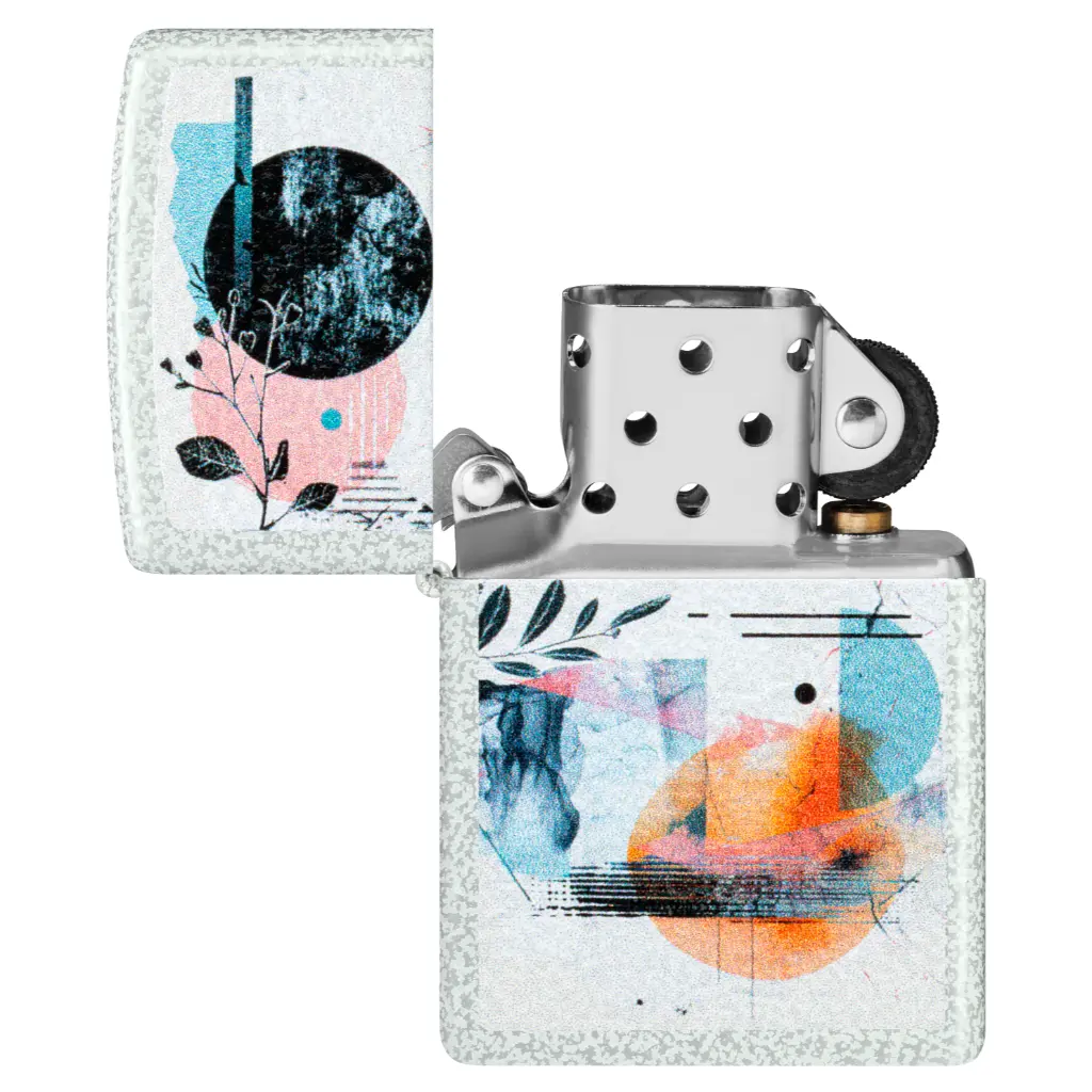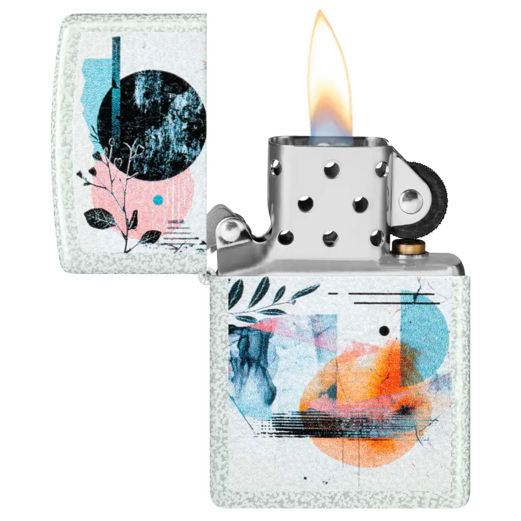 An abstract, mixed-media collage is replicated on this classic Glacier lighter in a mesmerizing Color Image design. Comes packaged in a gift box. For optimal performance fill with Zippo lighter fuel.