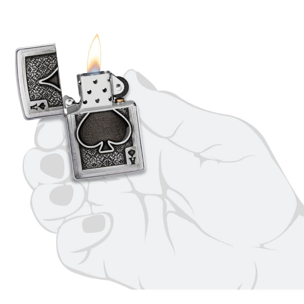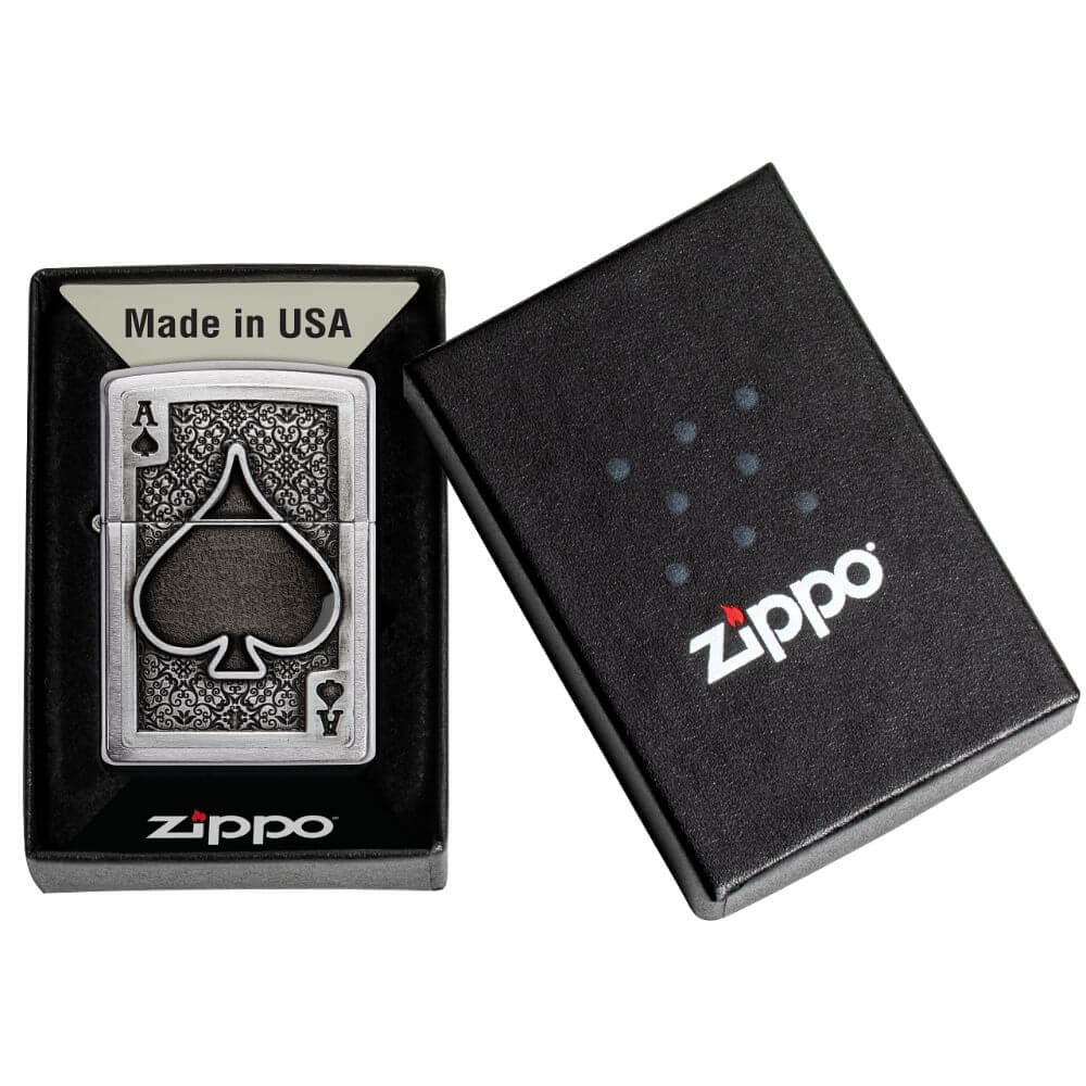 Another design is being added into the wildly popular Ace lighter collection! This Ace of Spades design is constructed on a sturdy emblem and attached to a Brushed Chrome windproof lighter. Comes packaged in a gift box. For optimal performance fill with Zippo lighter fuel.