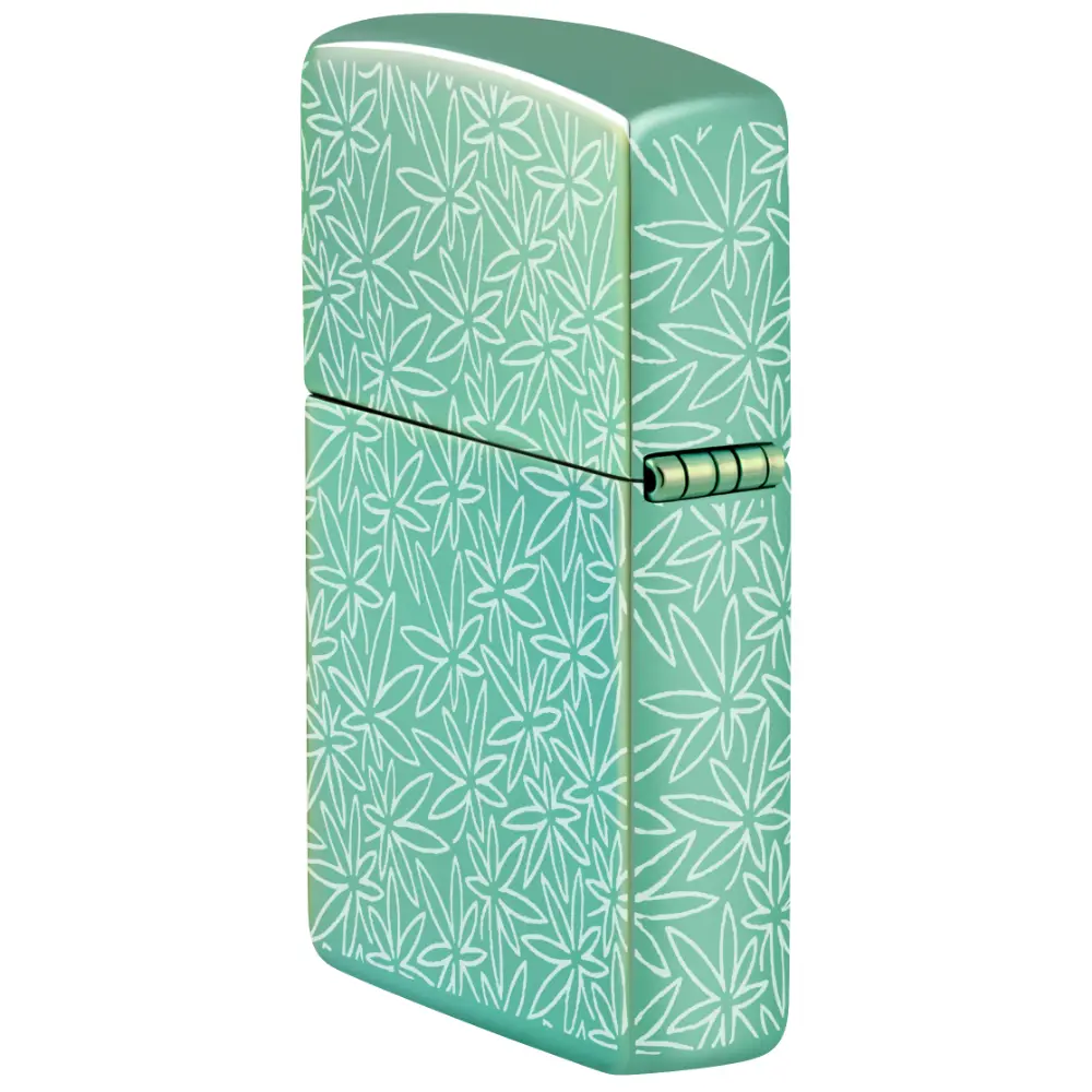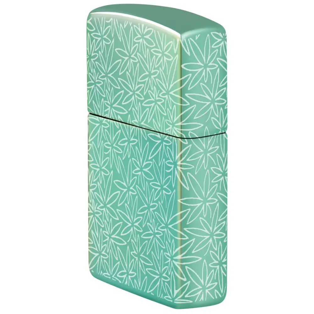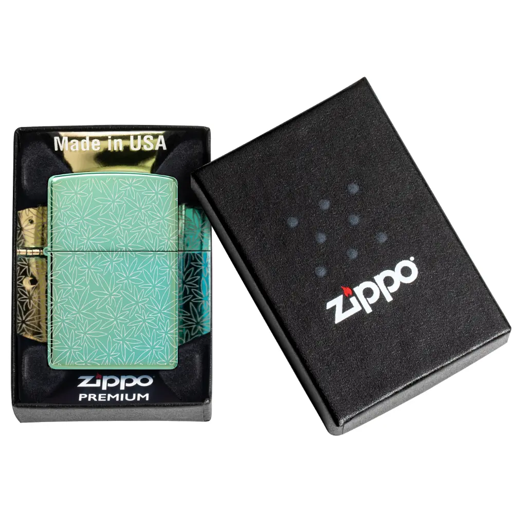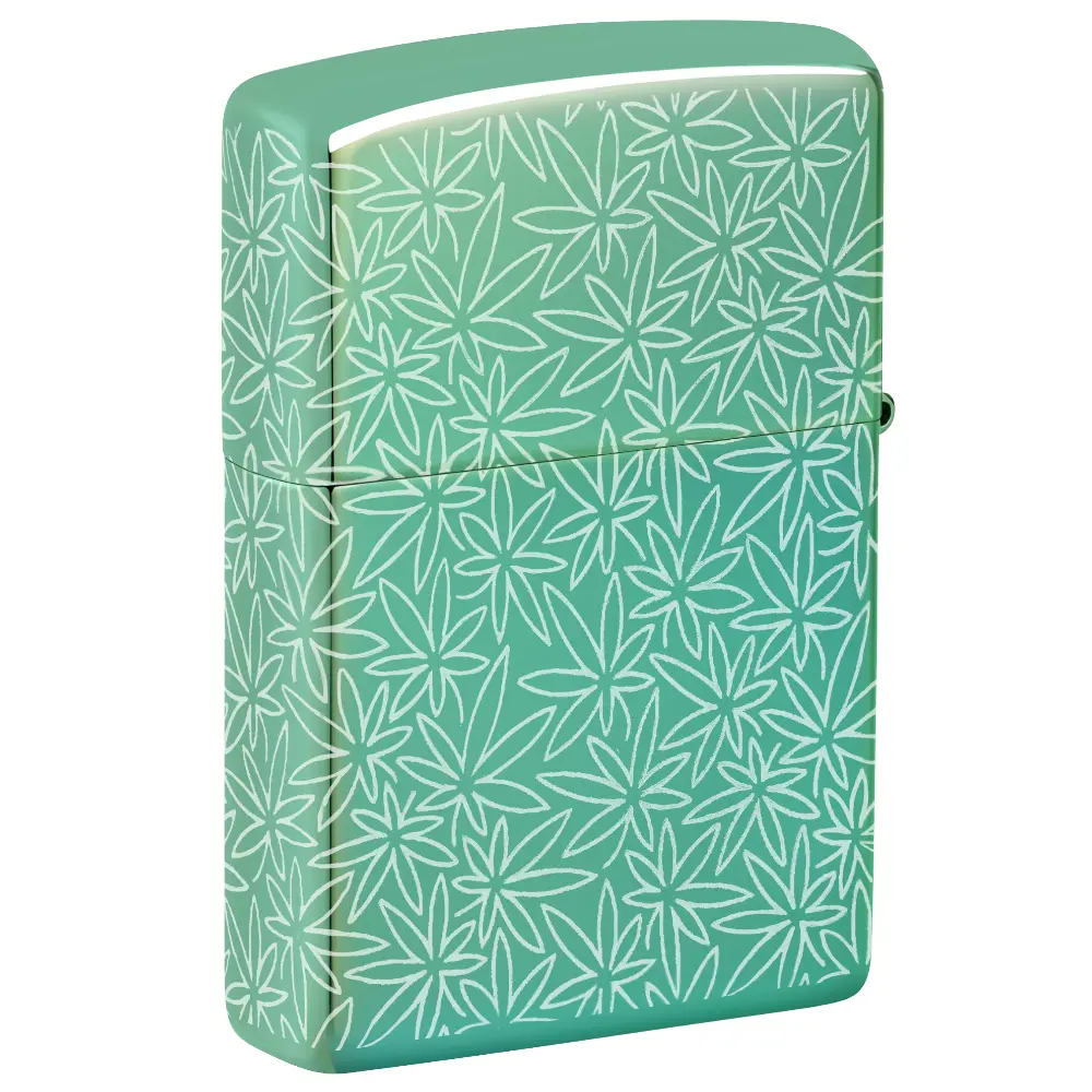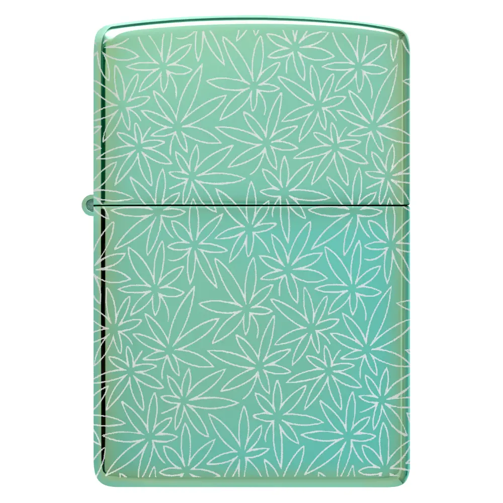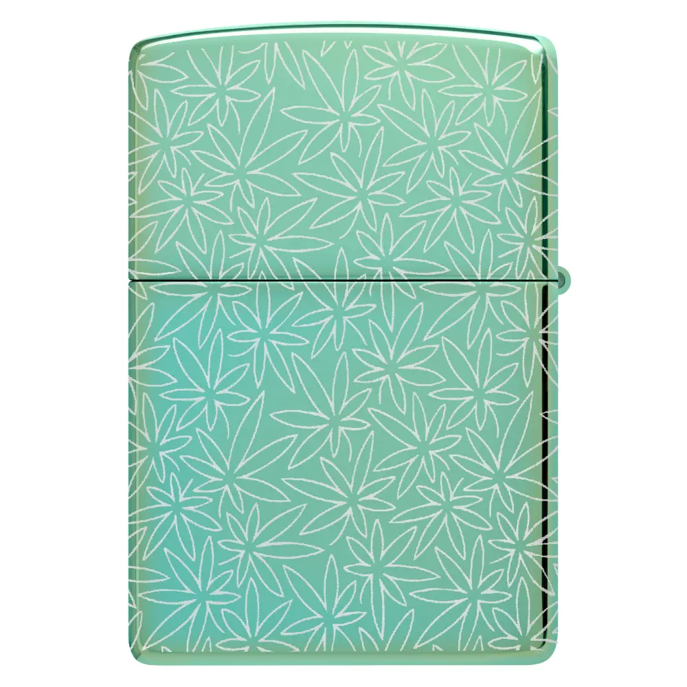 In intricate motif of cannabis leaves covers every surface of this classic High Polish Green lighter in a midcentury-inspired Photo Image 360° design. Comes packaged in a gift box. For optimal performance fill with Zippo lighter fuel.
