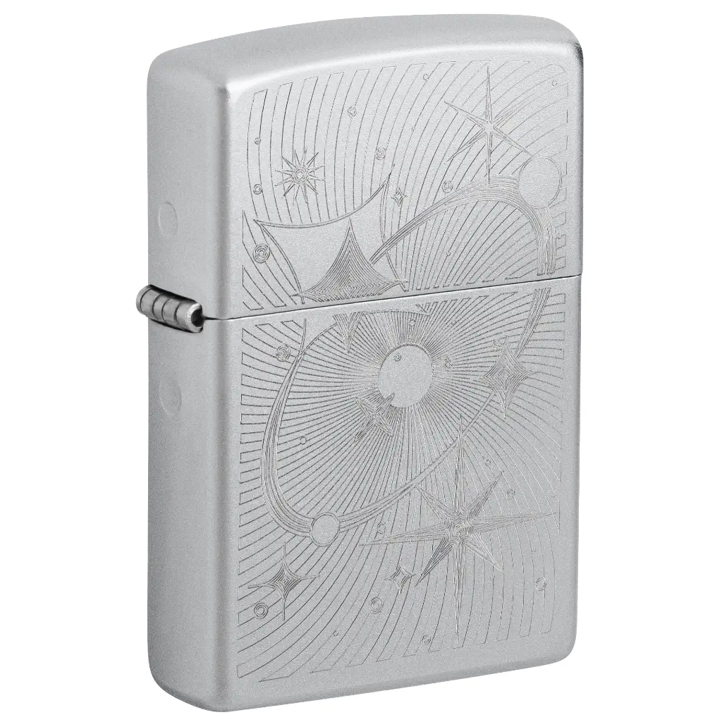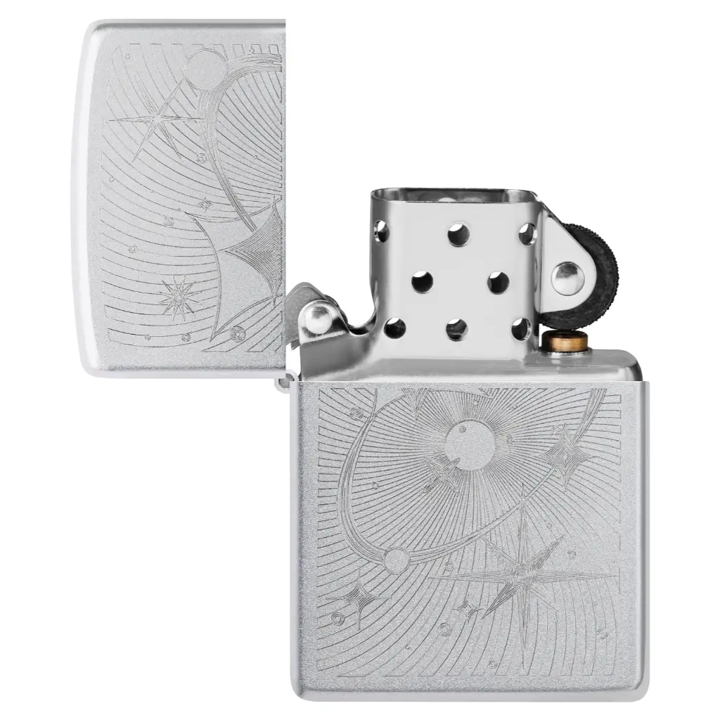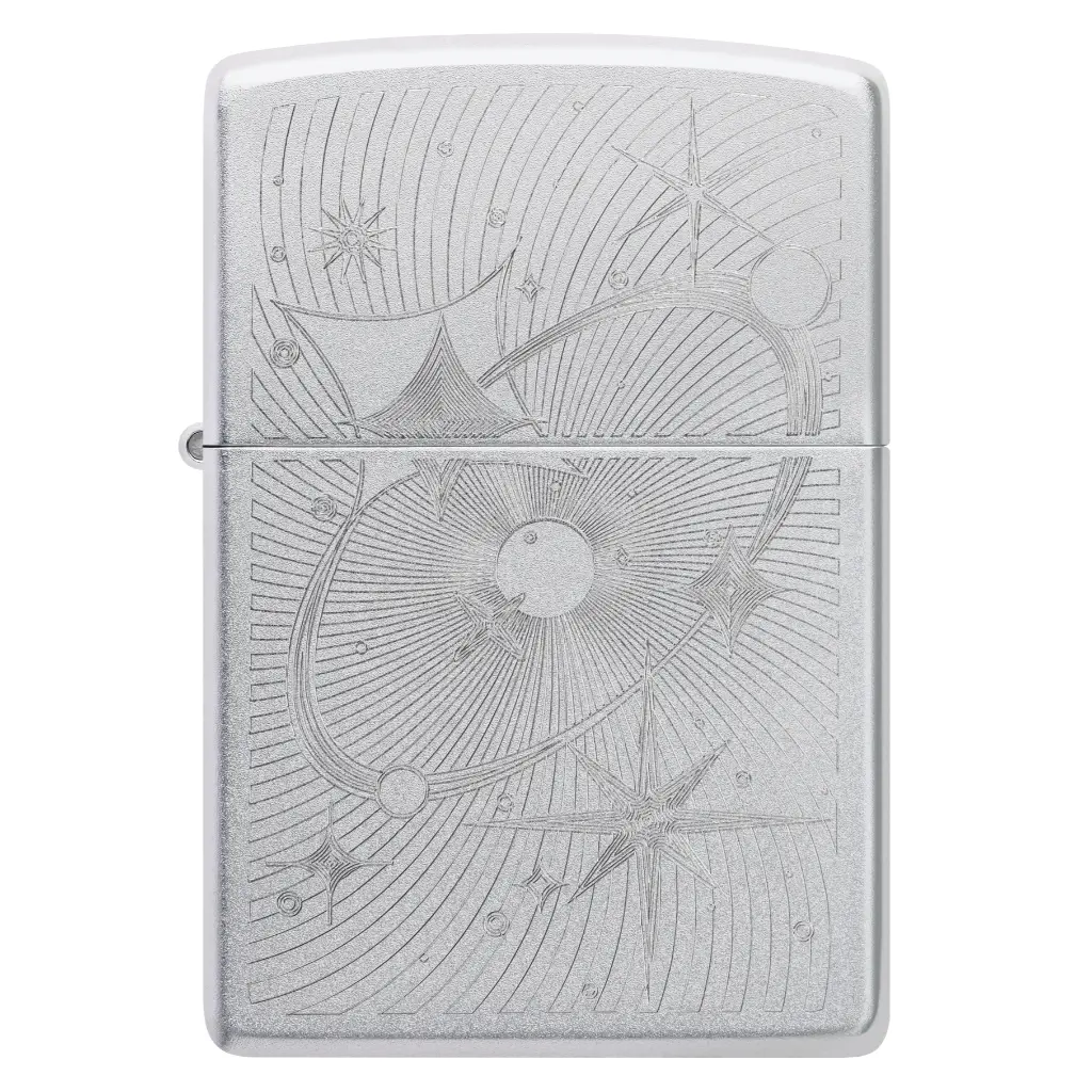 Inspired by midcentury artwork, an intricate network of stars and planets swirls across the surface of this classic Satin Chrome lighter in a subtle Auto Engrave design. Comes packaged in a gift box. For optimal performance fill with Zippo lighter fuel.