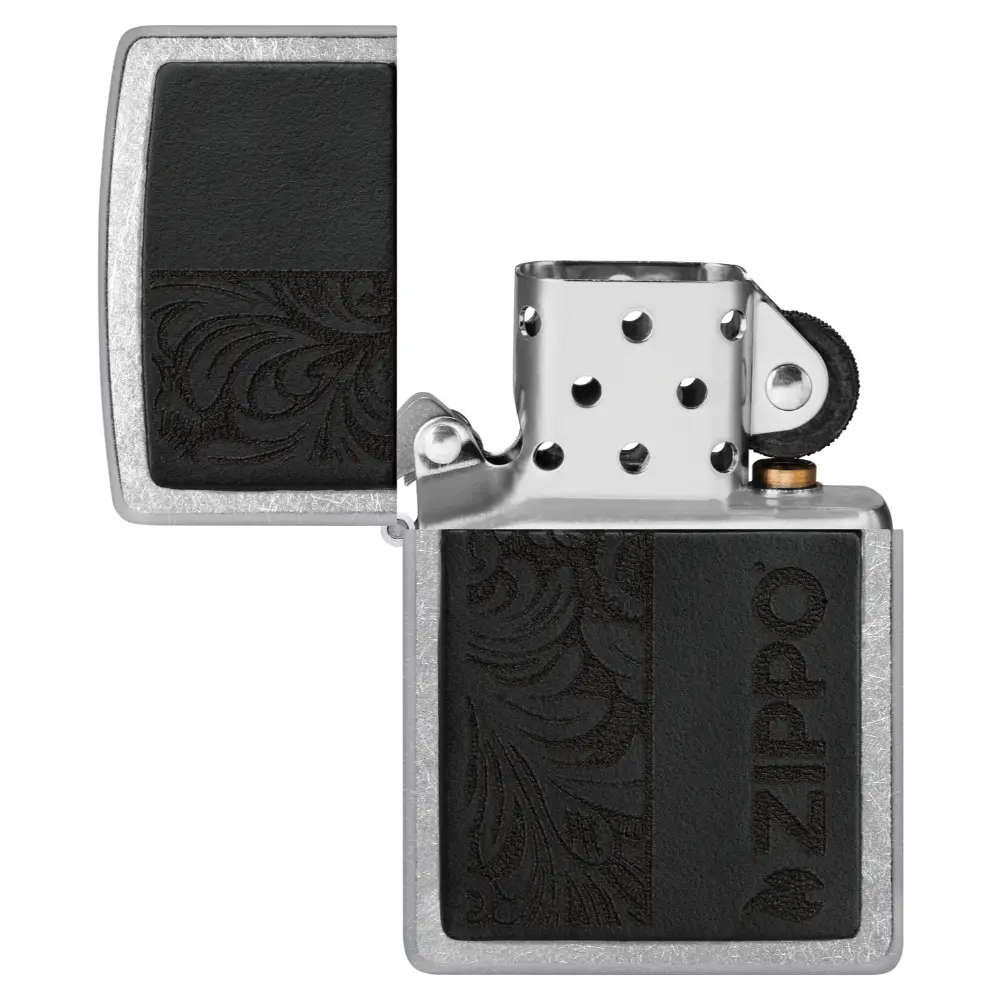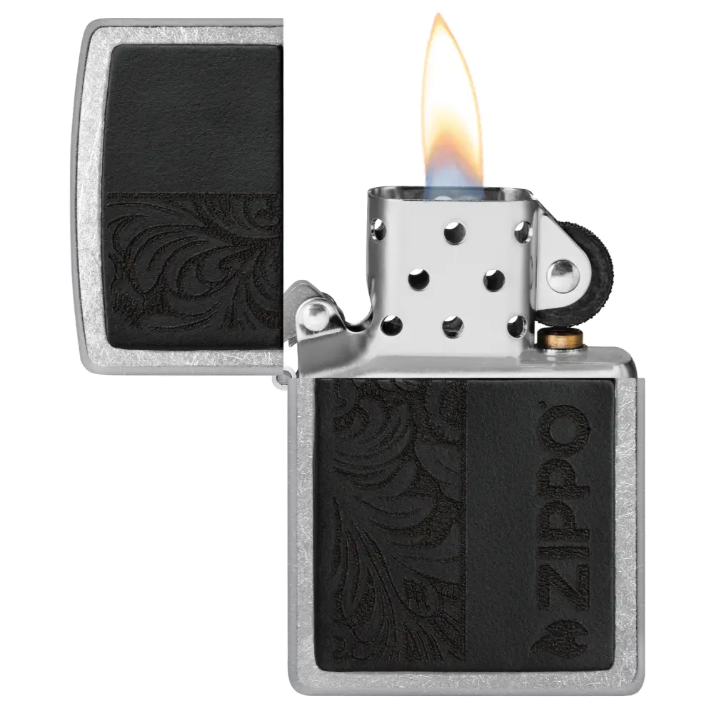 Add a touch of timeless sophistication to your collection with this classic Street Chrome lighter featuring a supple, genuine-leather emblem engraved with delicate filigree alongside the Zippo logo. Comes packaged in a gift box. For optimal performance fill with Zippo lighter fuel.