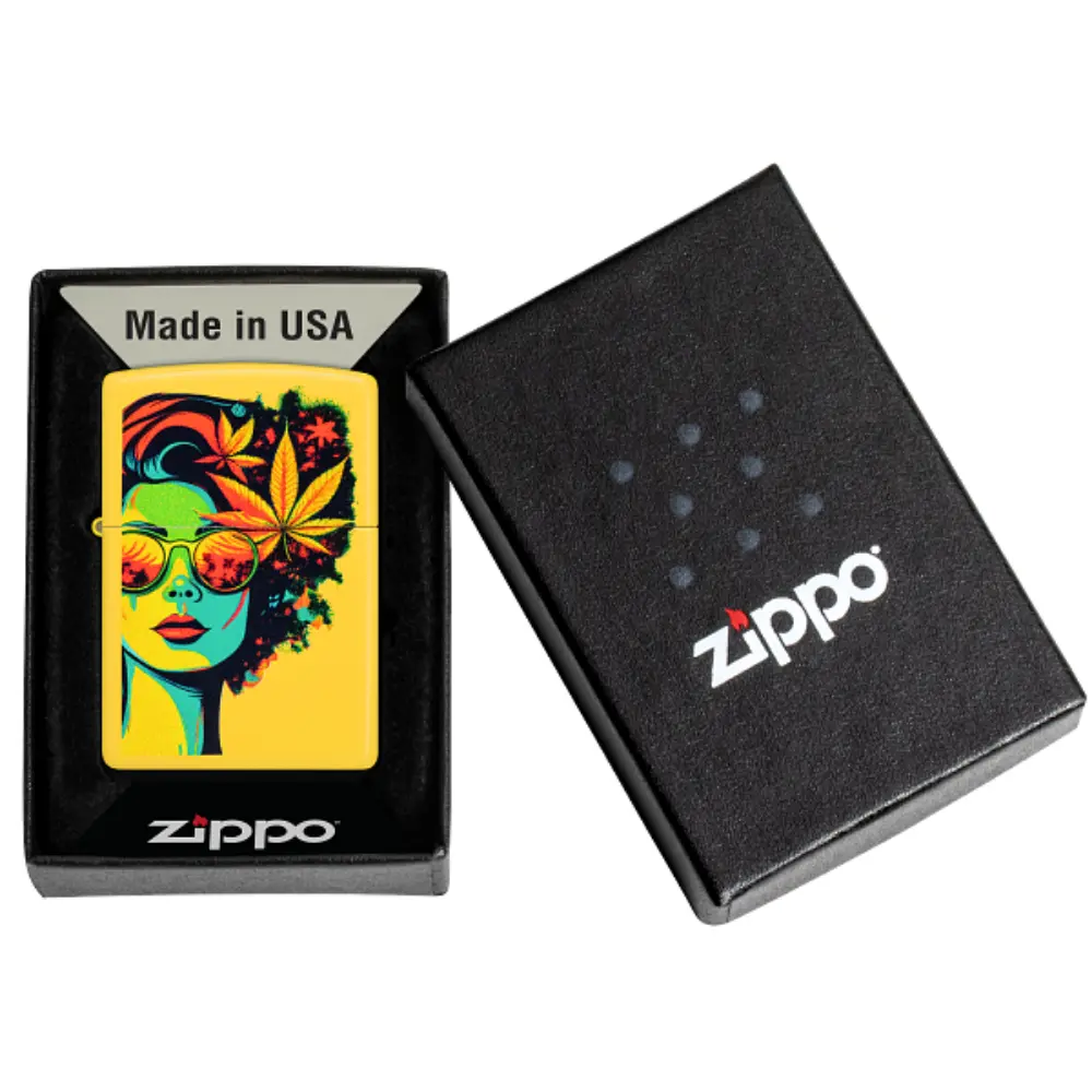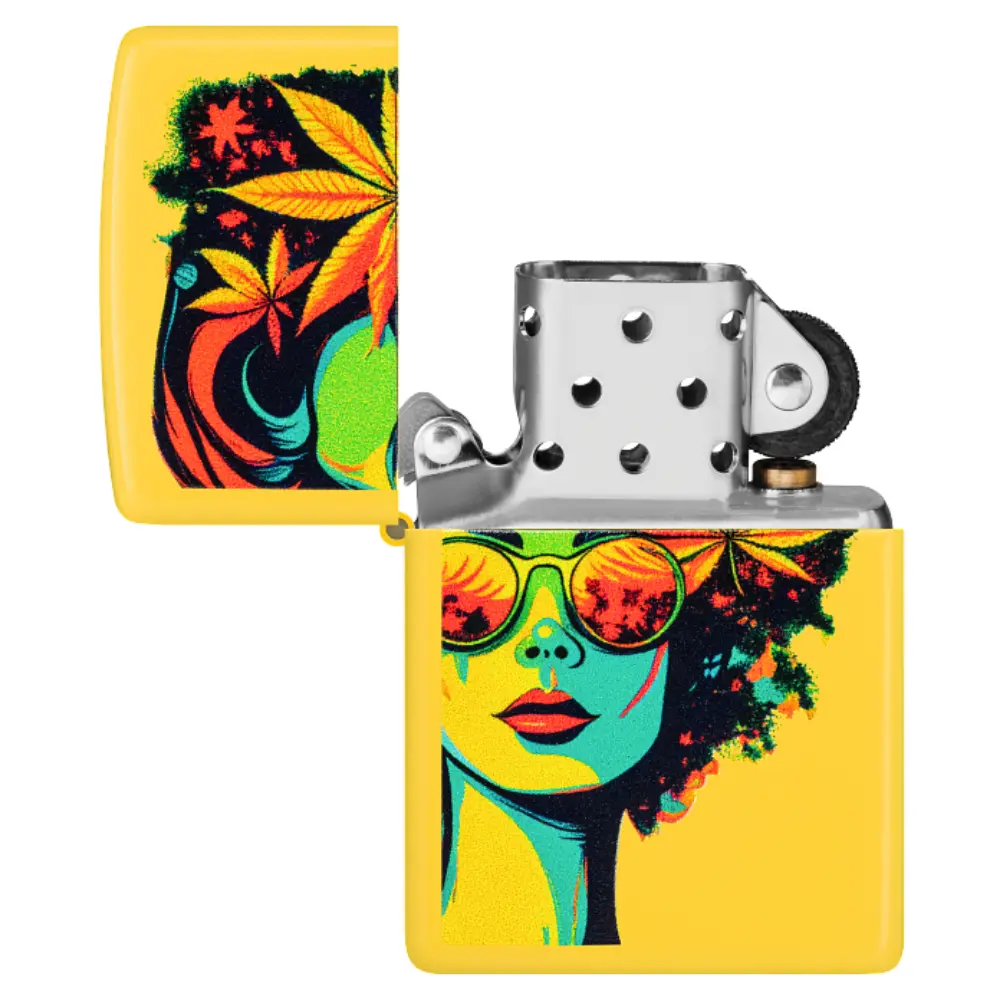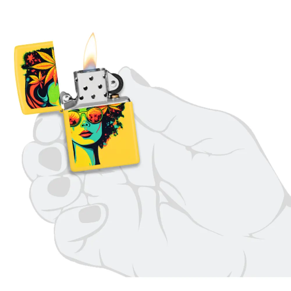 Our bright and cheery Sunflower base model serves as the perfect canvas for this Color Image design depicting a hip cannabis connoisseur in eye-catching vibrancy and detail. Comes packaged in a gift box. For optimal performance fill with Zippo lighter fuel.