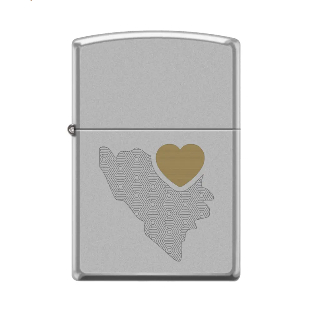 On the front of this Classic Satin Chrome lighter there stylized map of Bosnia and Herzegovina with gold hearth. This original Zippo lighter is completely made in the Zippo factory in Bradford, USA and comes in a limited edition. Comes packaged in a gift box. For optimal performance, fill with Zippo lighter fuel.