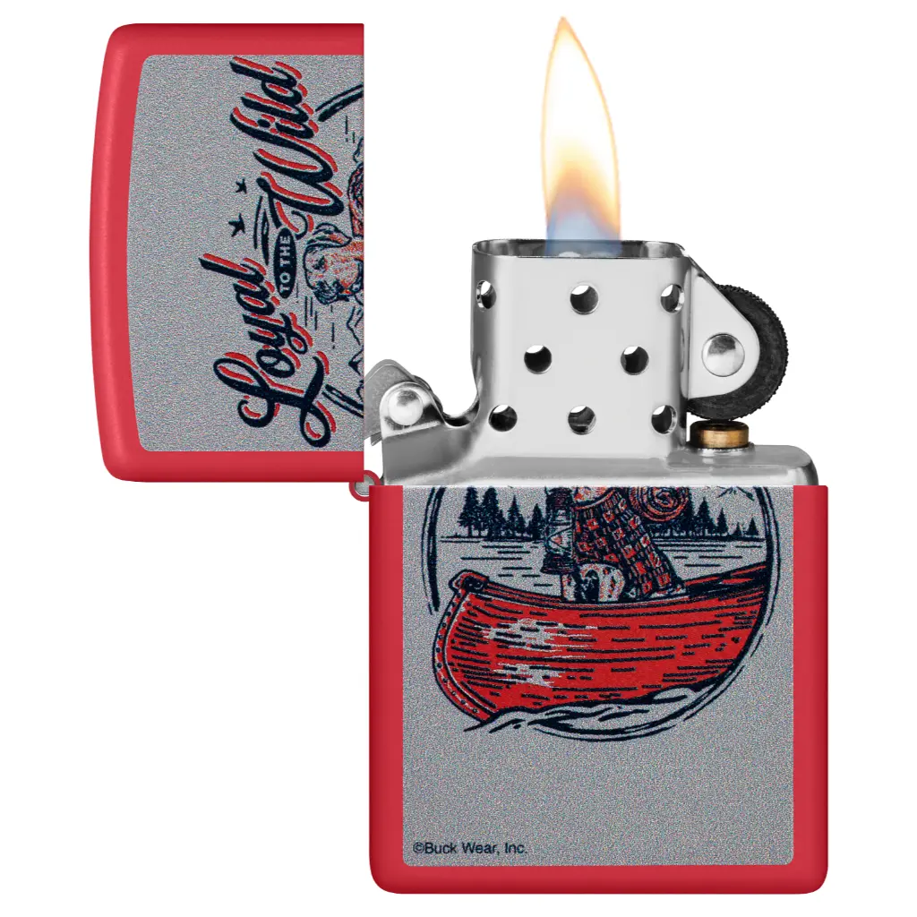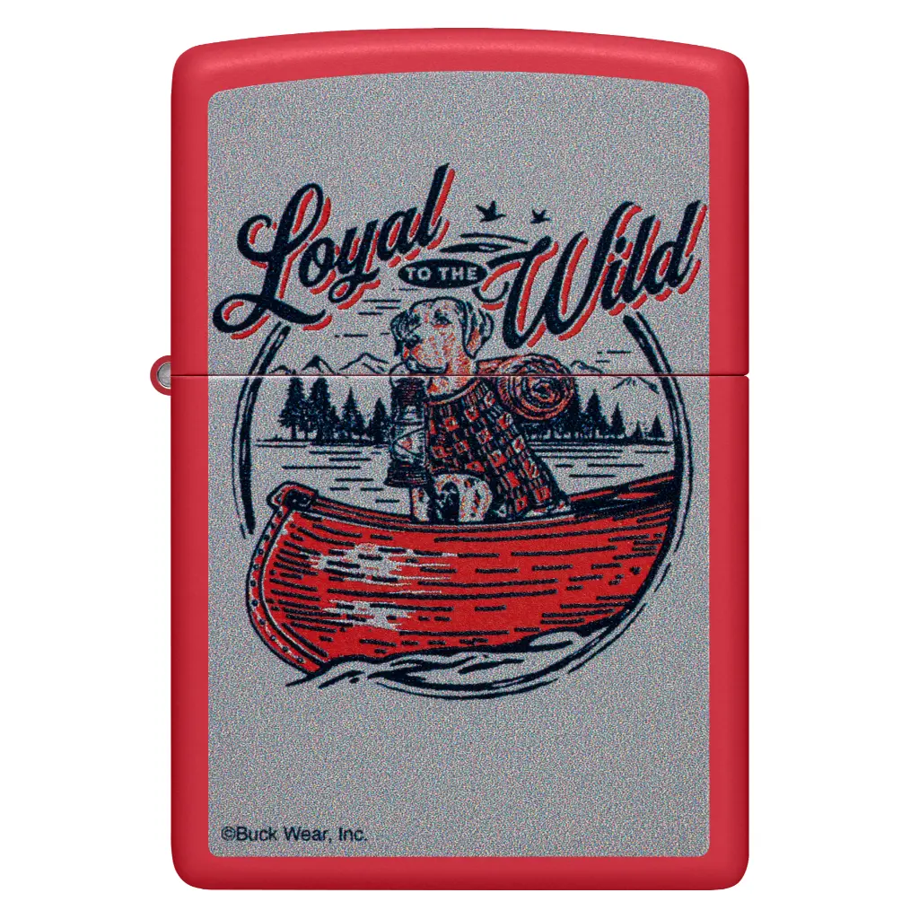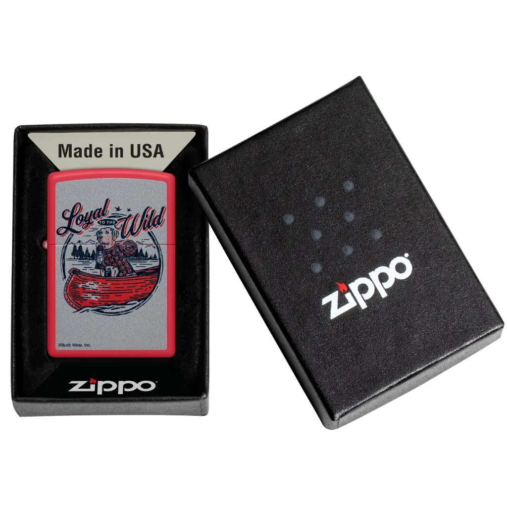 Escape to nature with this Red Matte lighter featuring Buck Wear™, an apparel brand that combines pride, patriotism and a love of the outdoors in each of their products. The Color Image design depicts a loyal hound at the bow of a canoe along with the inscription, “Loyal to the Wild.” Comes packaged in a gift box. For optimal performance fill with Zippo lighter fuel.