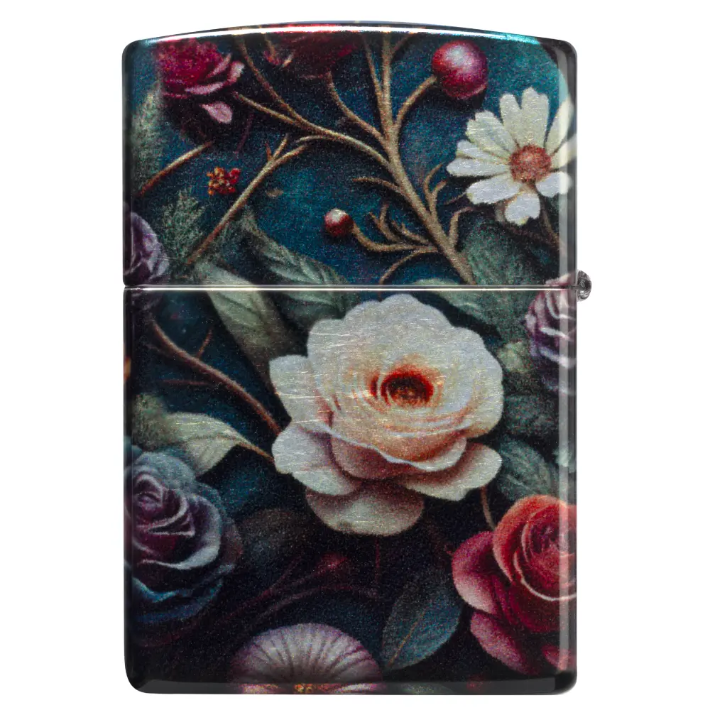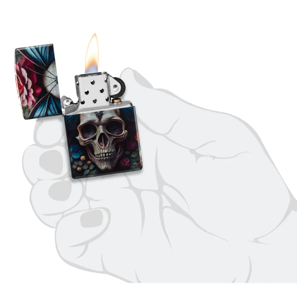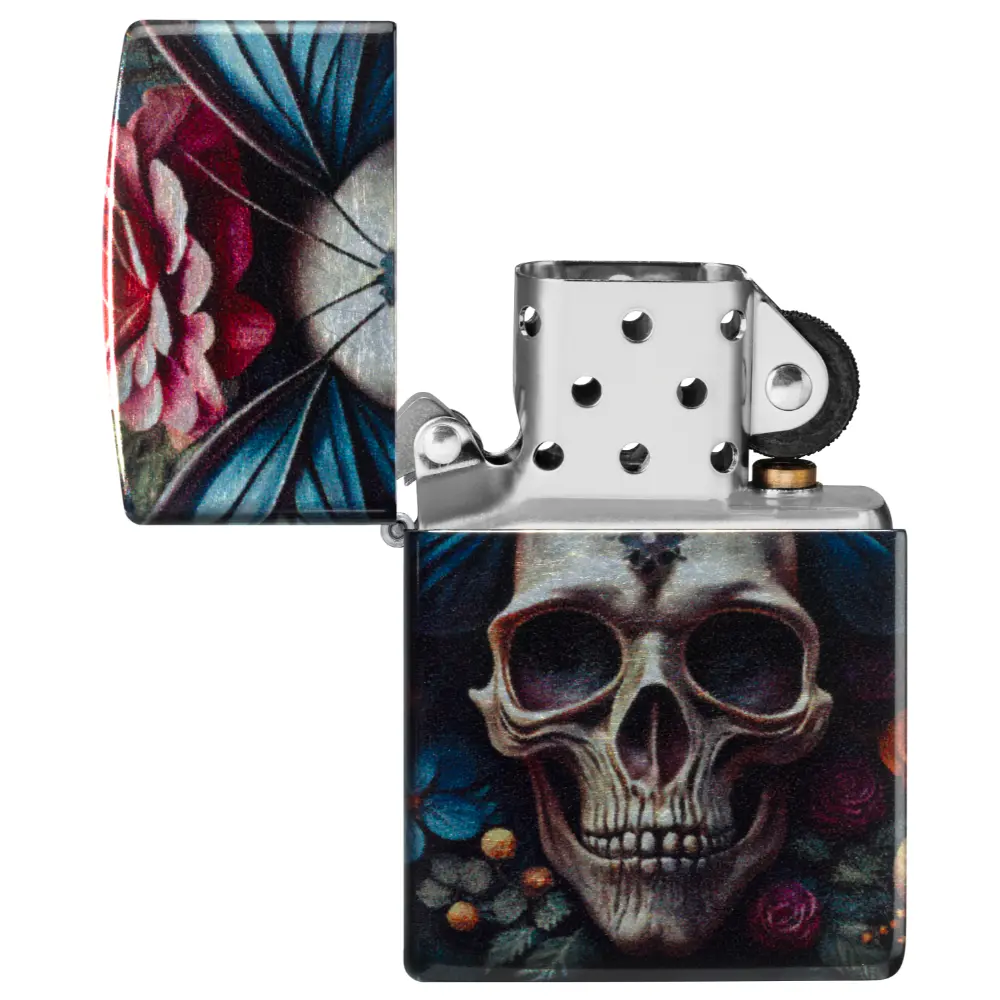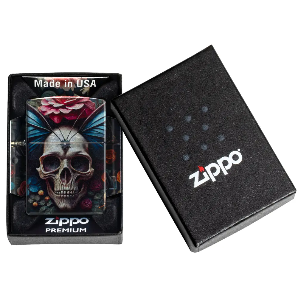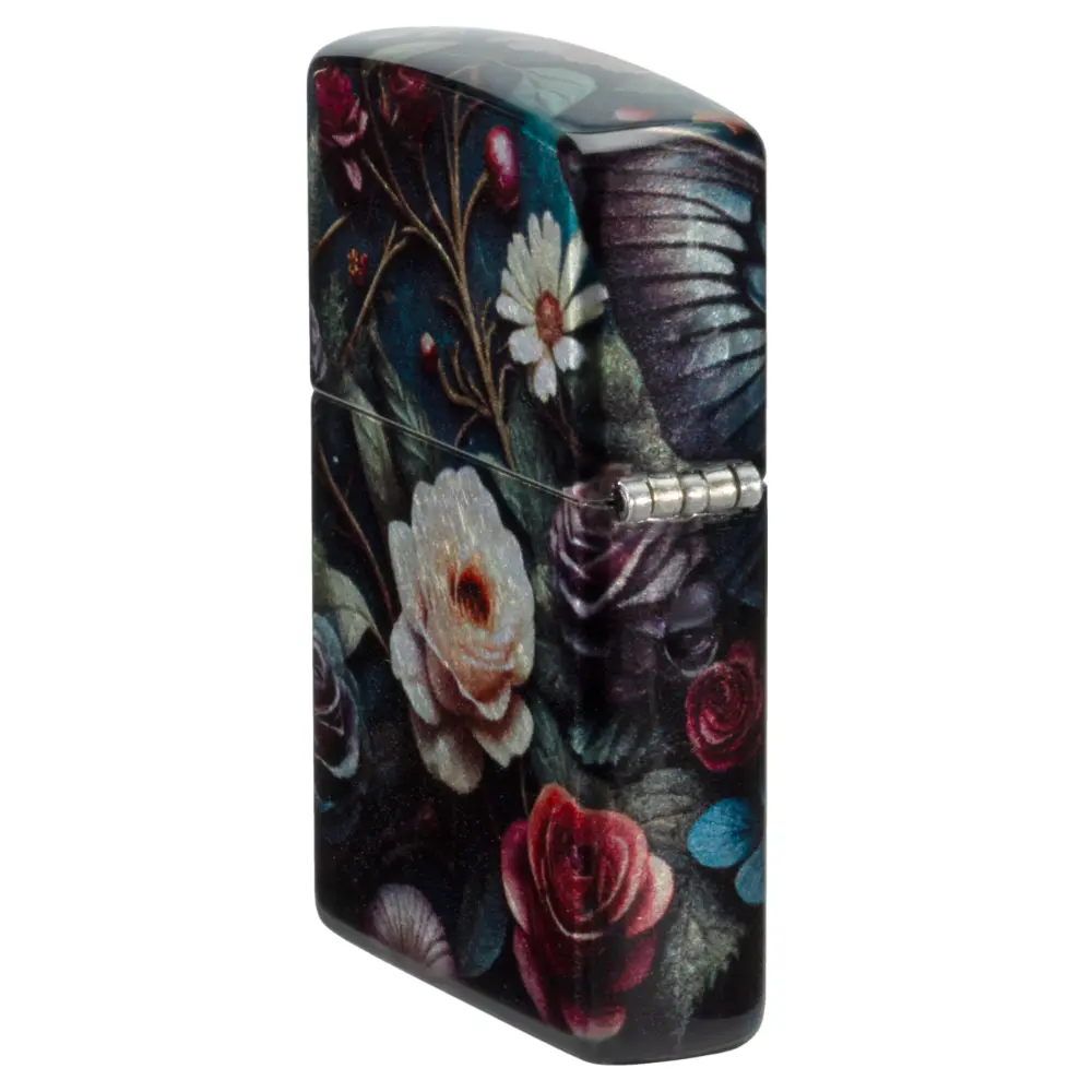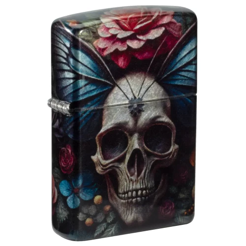 Surrounded by delicate florals, an intricate skull forms the body of a vibrant butterfly on this classic Tumbled Chrome lighter in a captivating 540 Fusion design. Comes packaged in a gift box. For optimal performance fill with Zippo lighter fuel.