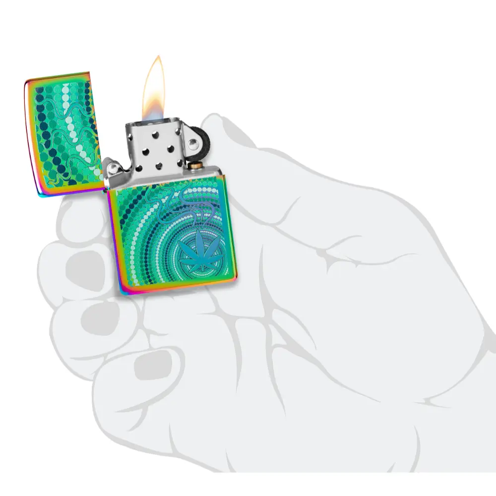 Go ahead and get lost in the flowing lines and concentric circles in this psychedelic Color Image cannabis design, which is right at home on a Multi Color lighter. Comes packaged in a gift box. For optimal performance fill with Zippo lighter fuel.