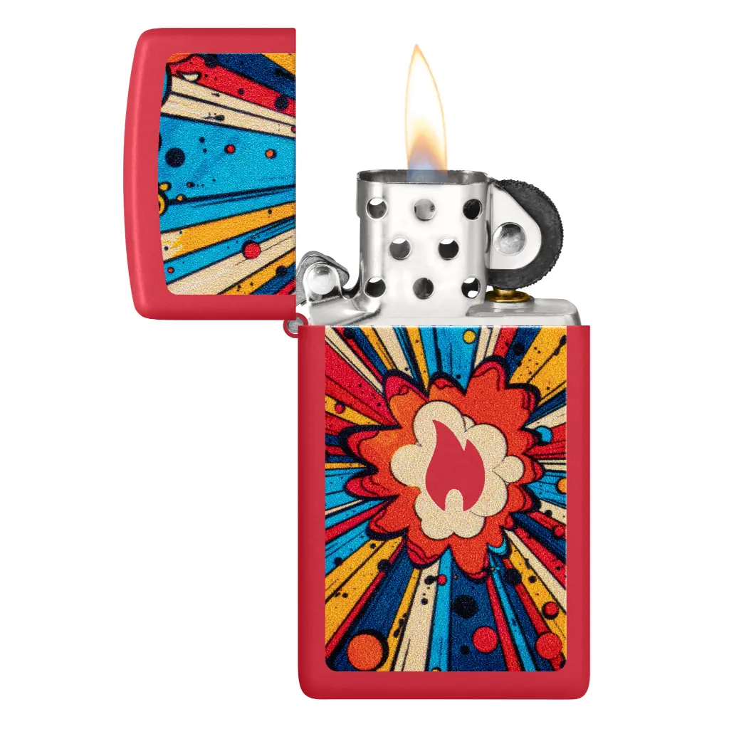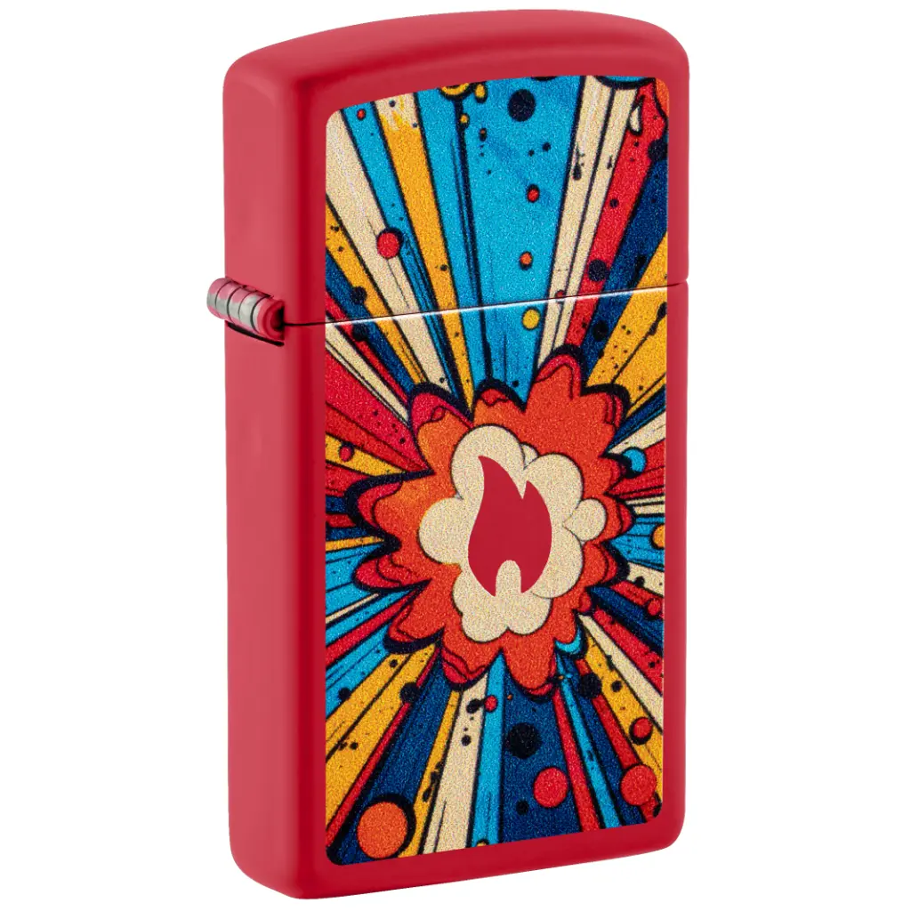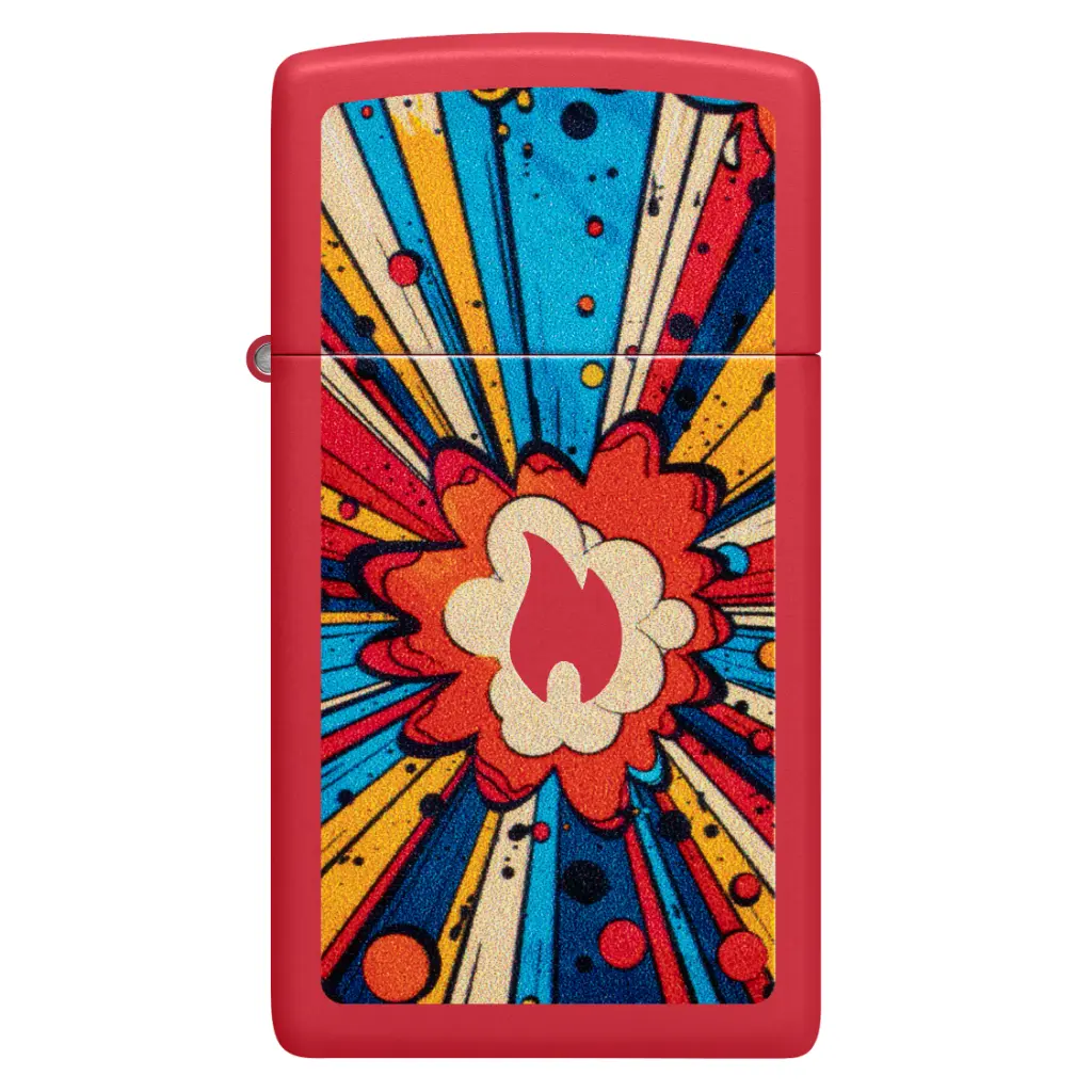 Ka-POW! Centering on the Zippo flame icon, a pop-art explosion is colorfully captured on this Slim® Red Matte lighter in a comic-inspired Color Image design. Comes packaged in a gift box. For optimal performance fill with Zippo lighter fuel.