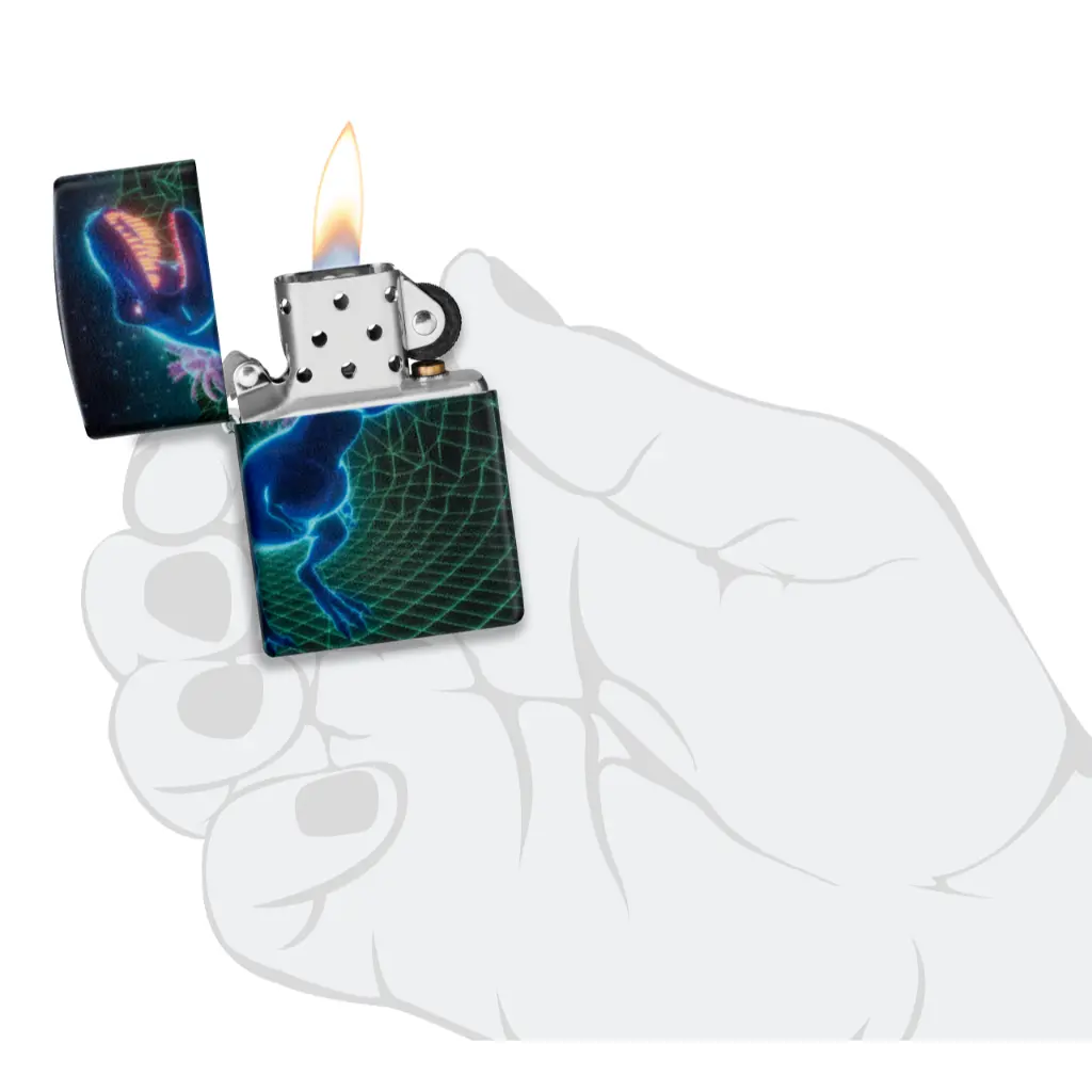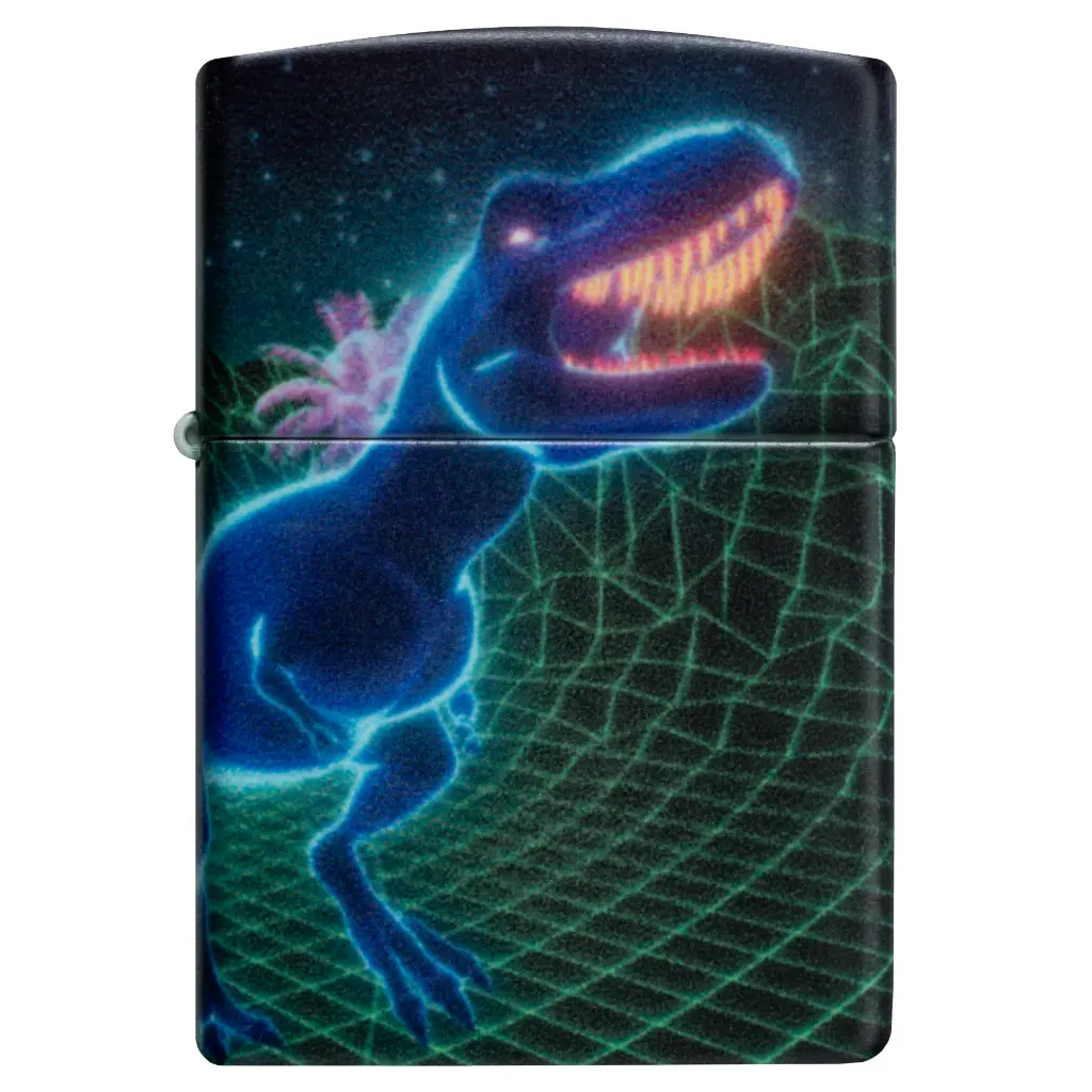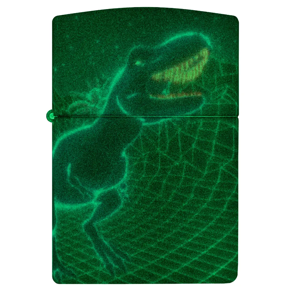 A ferocious dinosaur tears across the surface of this futuristic 540 Color lighter. The entire scene is treated with our Glow-in-the-Dark finish for added interest. Comes packaged in a gift box. For optimal performance fill with Zippo lighter fuel.