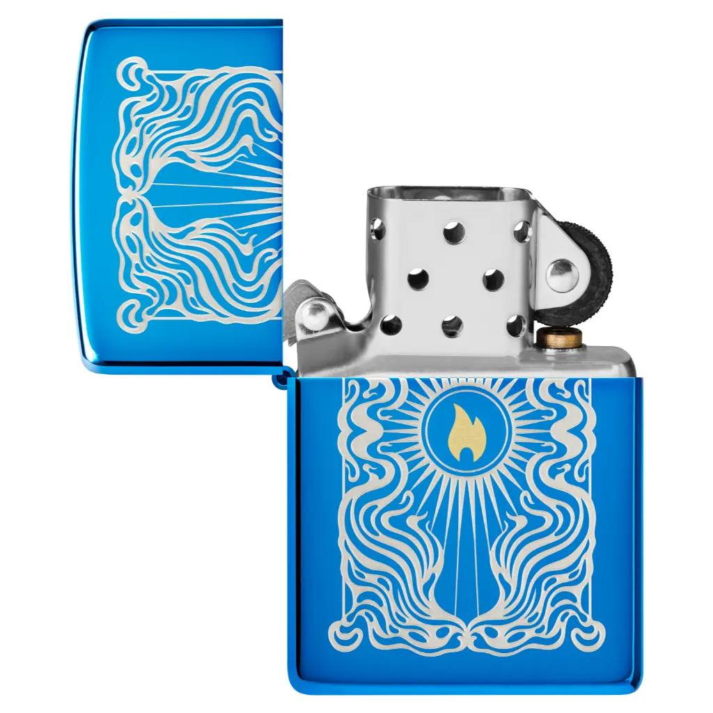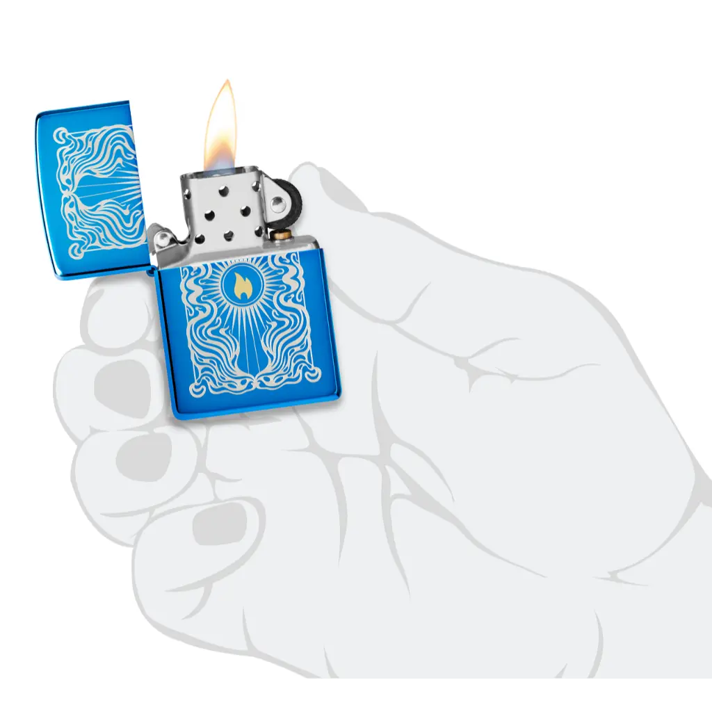 Surrounded by wafting vapor, a brass-toned Zippo flame icon appears in the center of this classic High Polish Blue lighter in a mesmerizing Laser Two-Tone design. Comes packaged in a gift box. For optimal performance fill with Zippo lighter fuel.