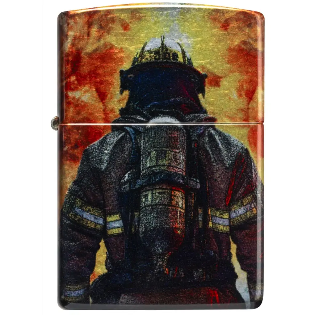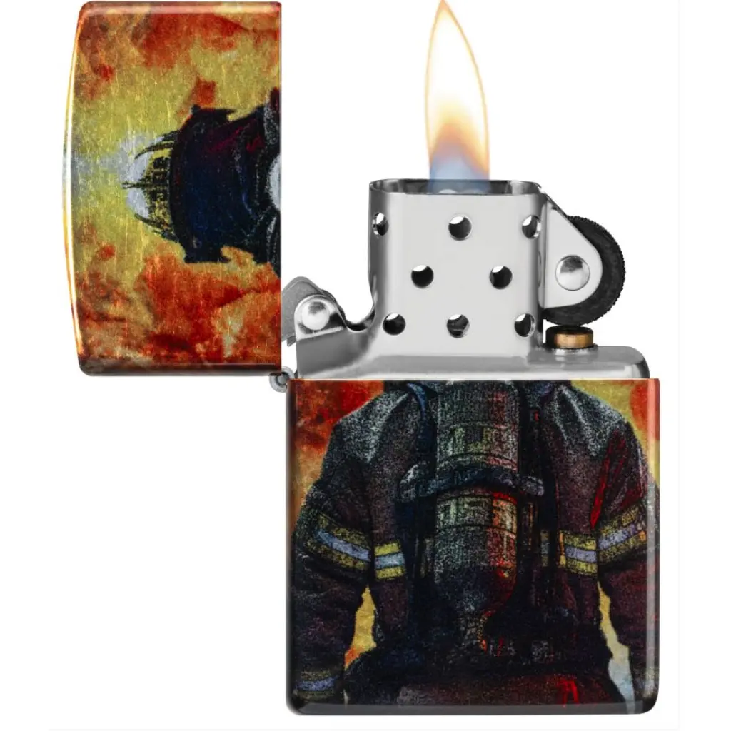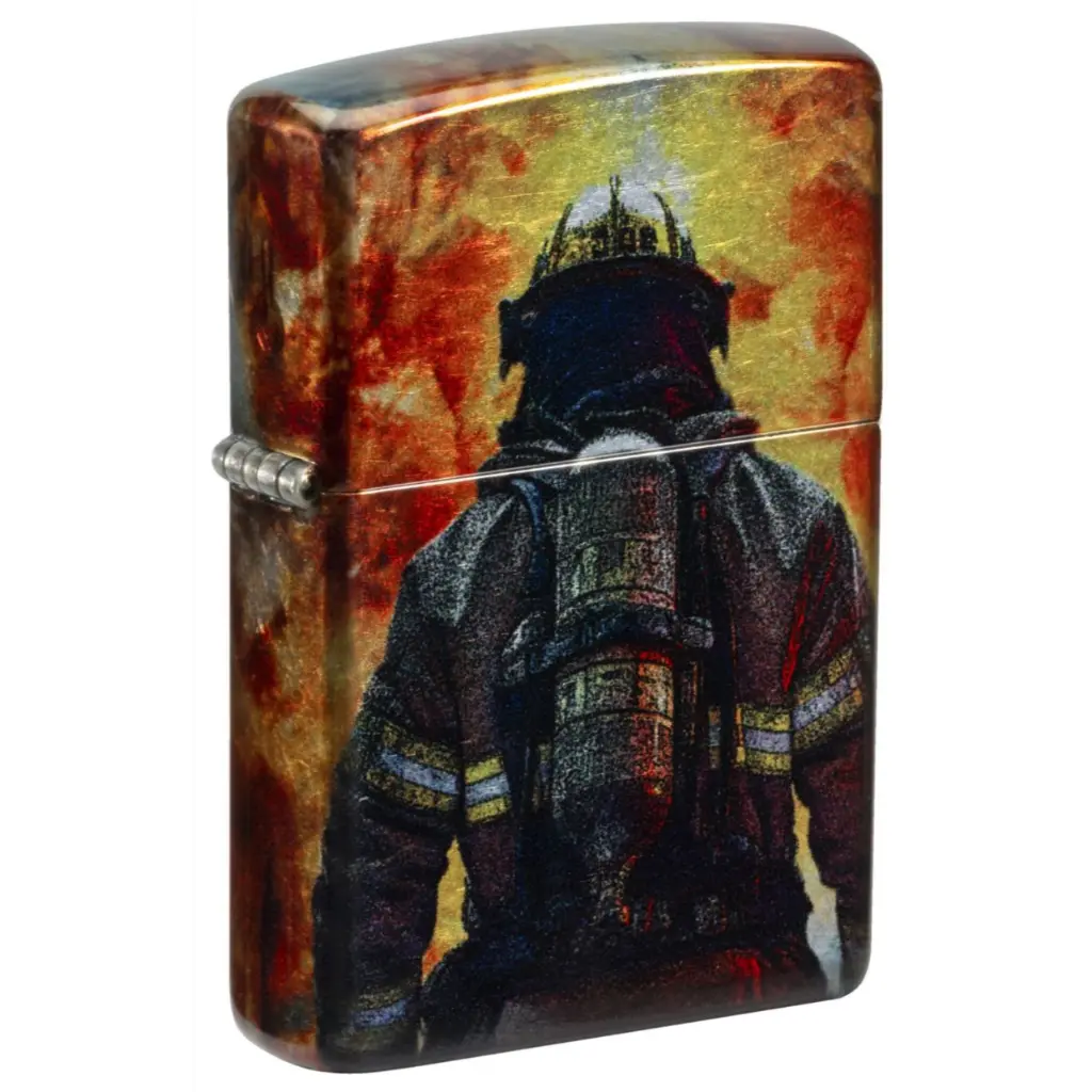 A brave firefighter stares down a raging inferno on this classic Tumbled Chrome lighter in a shimmering, seamless 540 Fusion design. Comes packaged in a gift box. For optimal performance fill with Zippo lighter fuel.