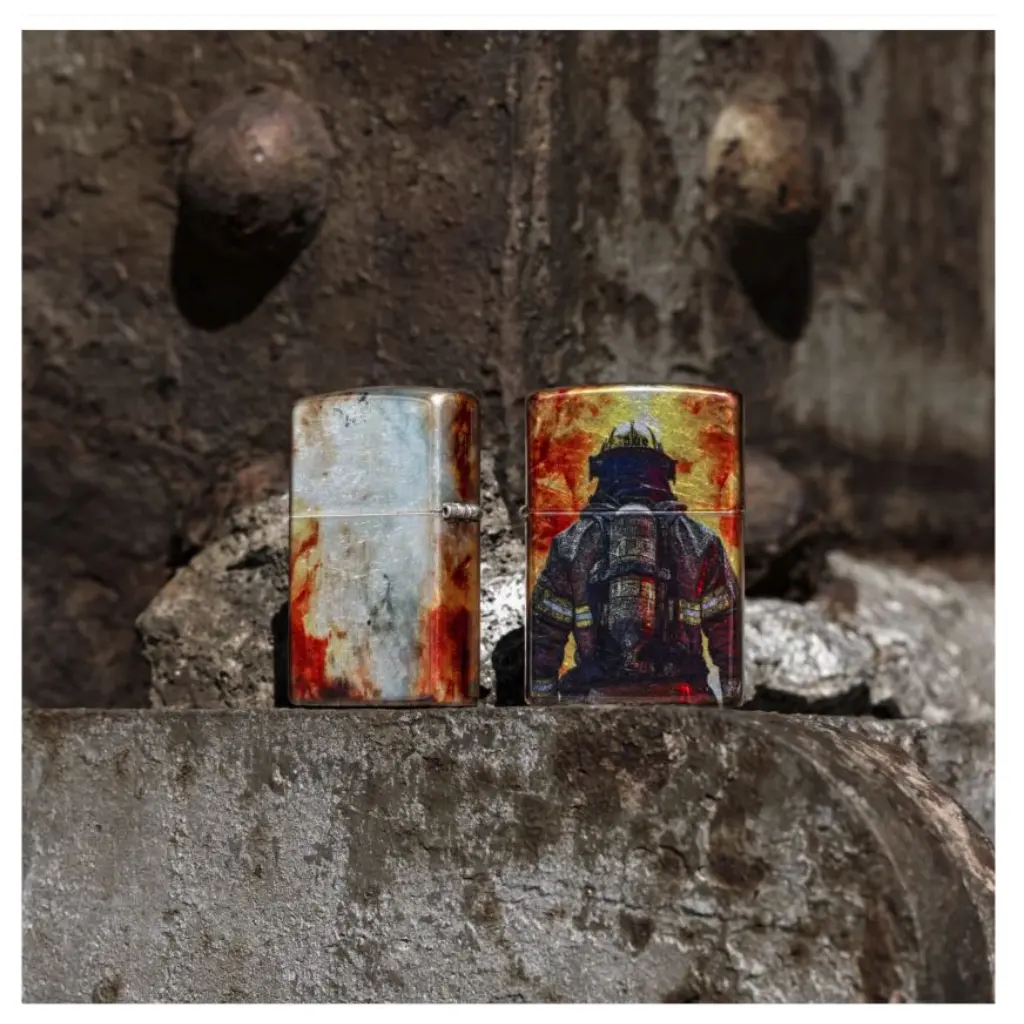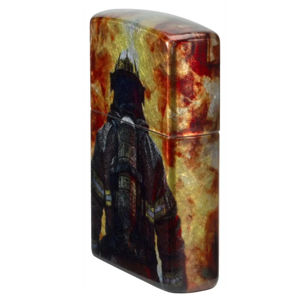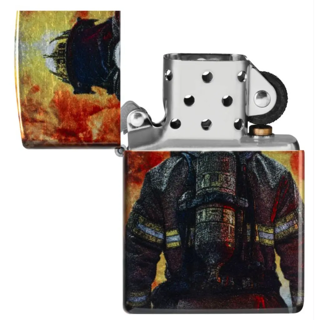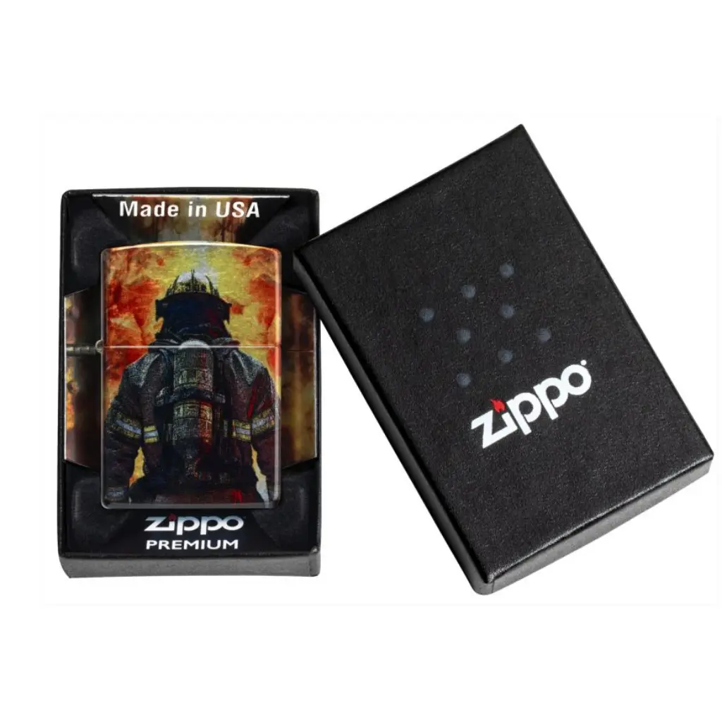 A brave firefighter stares down a raging inferno on this classic Tumbled Chrome lighter in a shimmering, seamless 540 Fusion design. Comes packaged in a gift box. For optimal performance fill with Zippo lighter fuel.