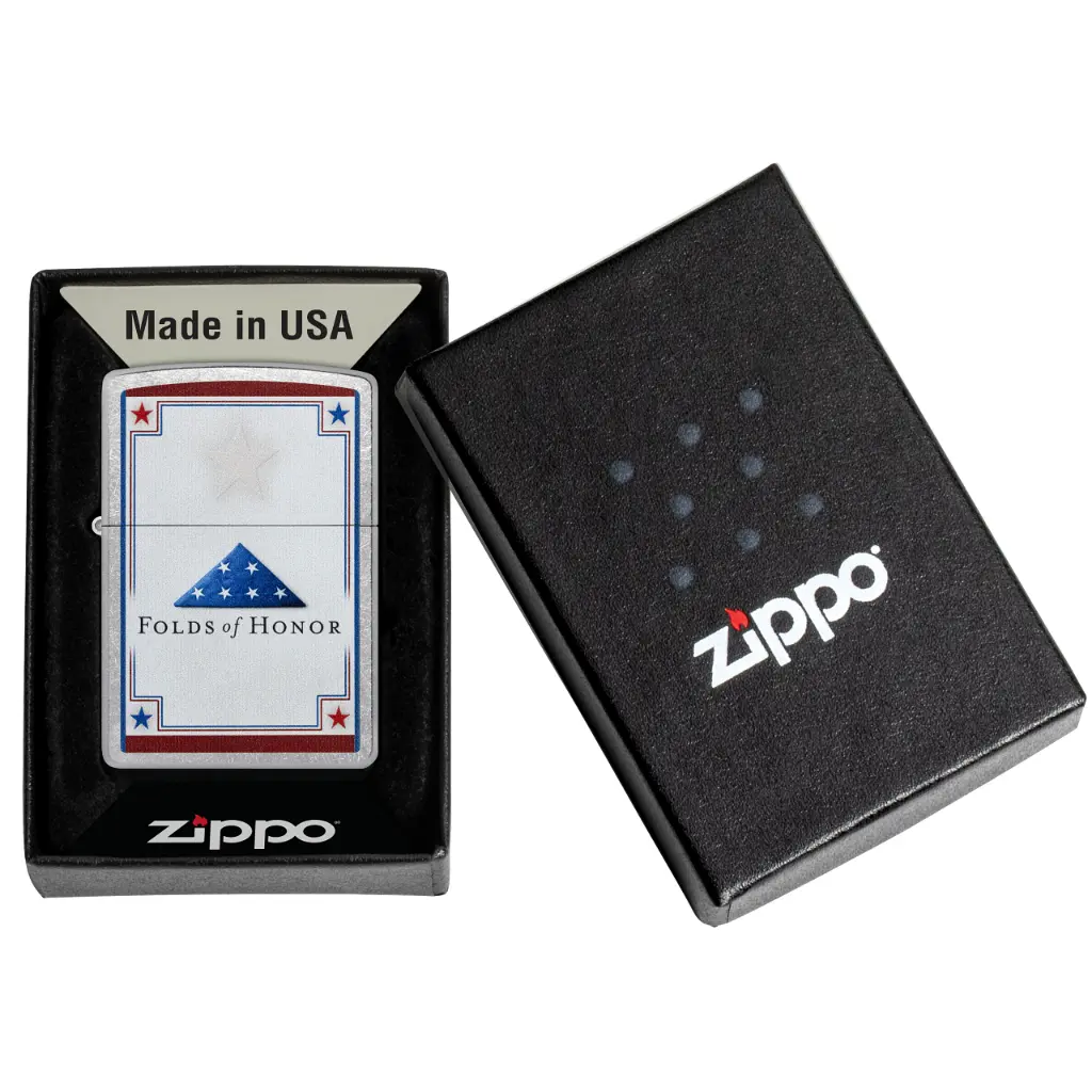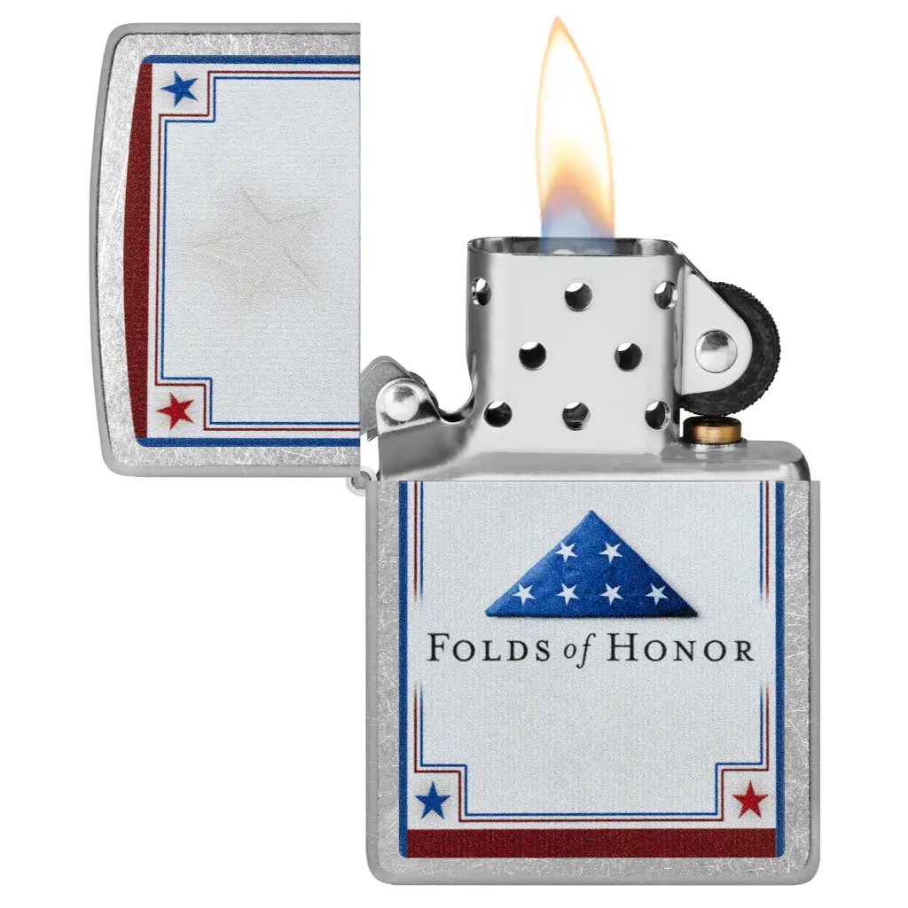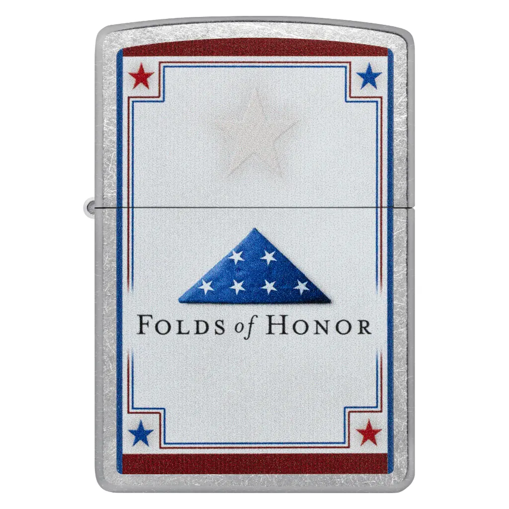 Founded in 2007, Folds of Honor provides life-changing scholarships to the families of fallen or disabled military members and first responders. This classic Street Chrome lighter features the Folds of Honor logo in a stoic Color Image design. In honor of America’s veterans, 11% of every purchase supports Folds of Honor and their ongoing mission. Comes packaged in a gift box. For optimal performance fill with Zippo lighter fuel.