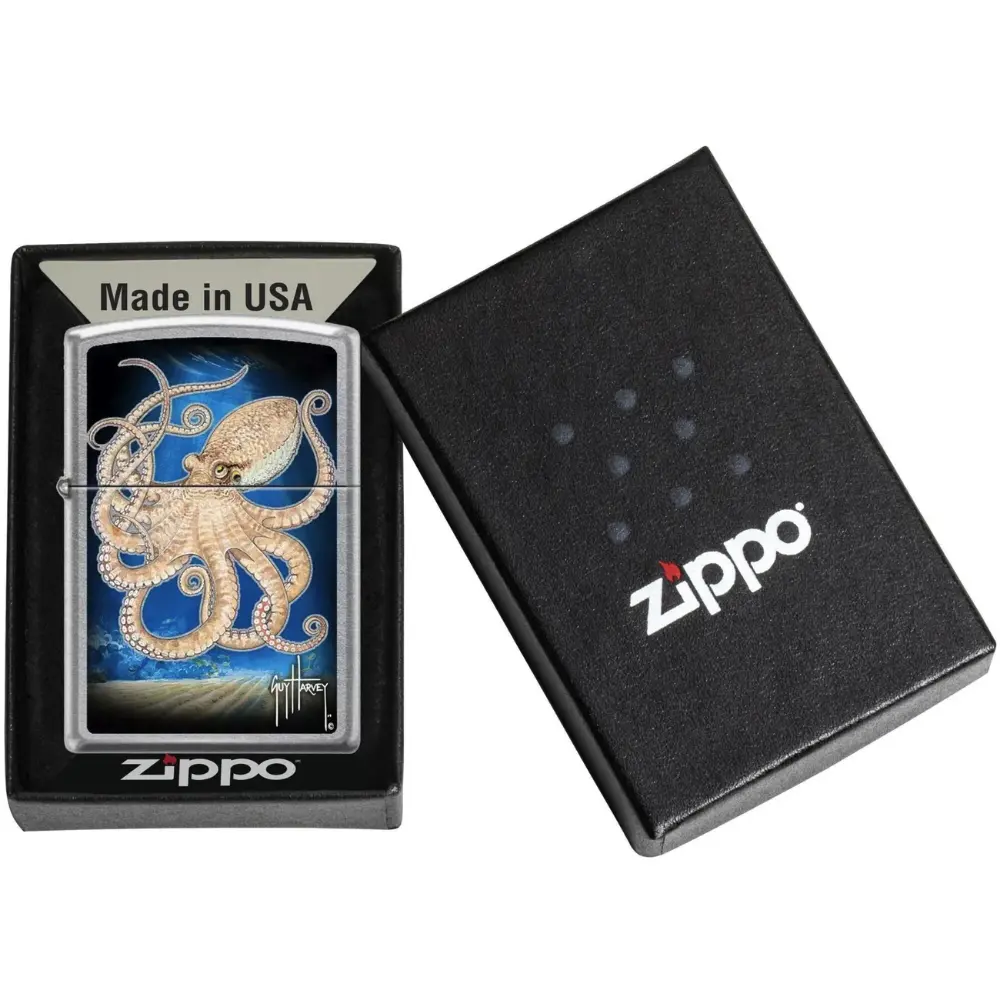 As the world’s premier marine wildlife artist, Dr. Guy Harvey has dedicated his life and career to studying, protecting and capturing the beauty of the ocean and its inhabitants. This is Zippo Windproof Lighter Guy Harvey Octopus Design Street Chrome Finish . Comes packaged in a gift box. For optimal performance fill with Zippo lighter fuel.