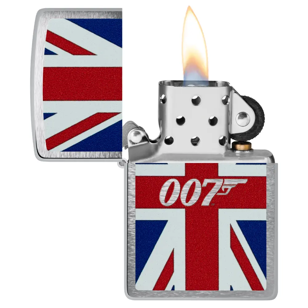The iconic 007™ logo commands the surface of this classic Brushed Chrome lighter over a Color Image design of the Union Jack flag. The logo is chromed out to reveal the lighter’s finish beneath the design for added depth. Comes packaged in a gift box. For optimal performance fill with Zippo lighter fuel.