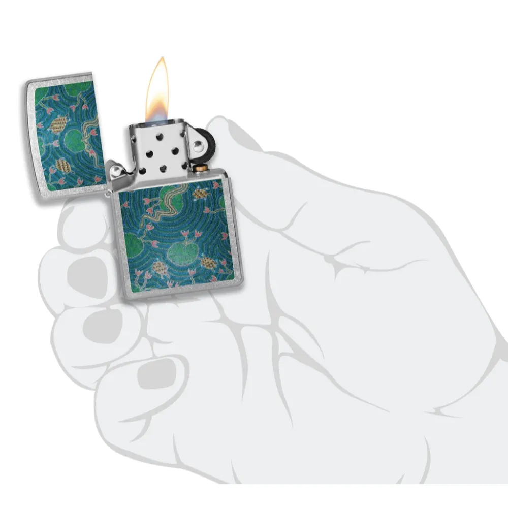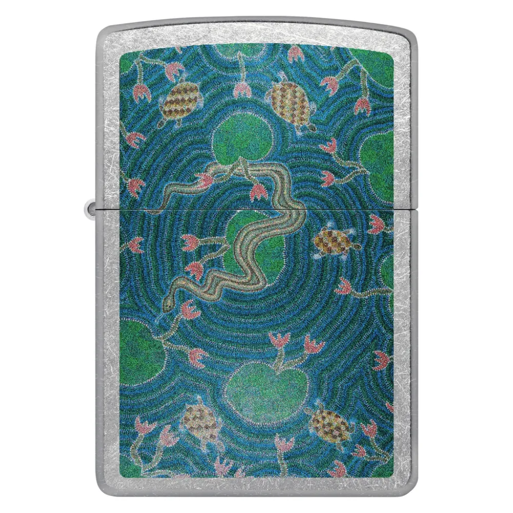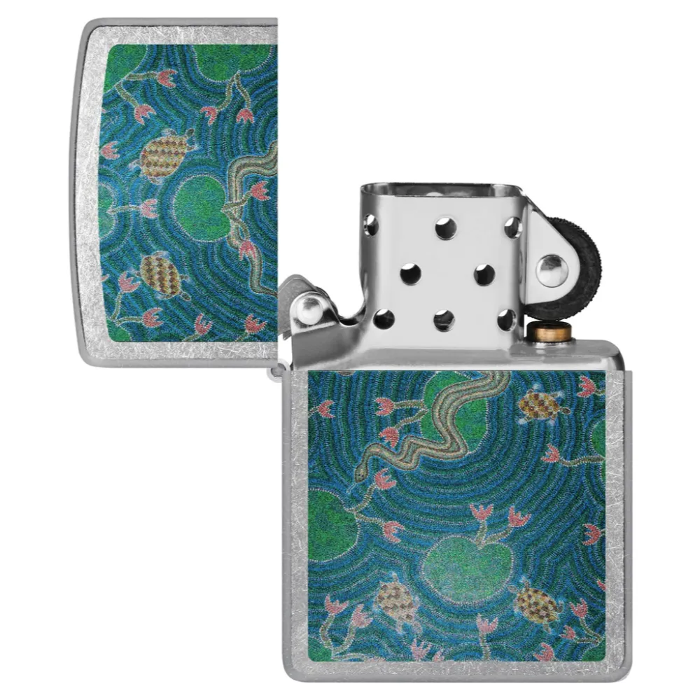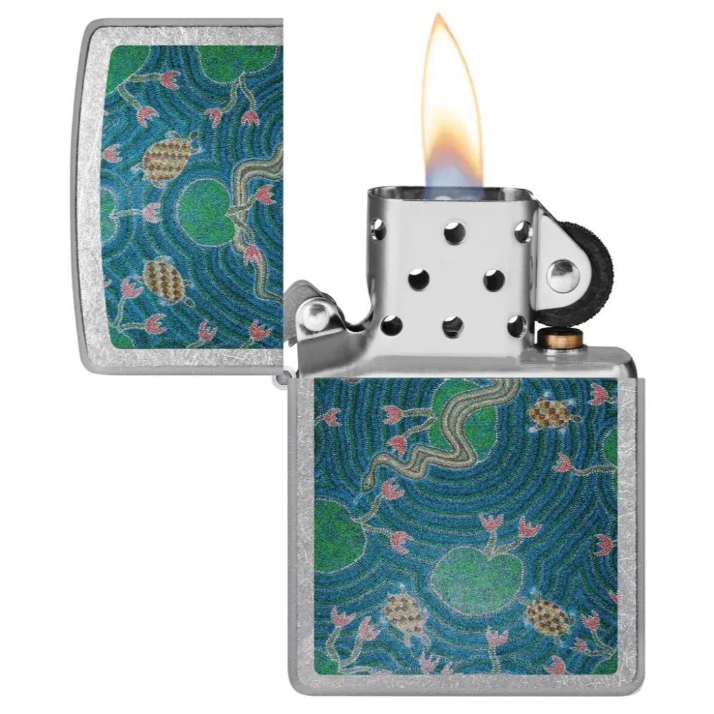 Inspired by the rich tones and vibrant colors of his culture and country, Australian Aboriginal artist and ambassador John Smith Gumbula has been passionate in the arts, cultural affairs and innovation for over 30 years. This classic Street Chrome lighter replicates his iconic Billabong Dreaming in a serene Color Image design. Comes packaged in a gift box. For optimal performance, fill with Zippo lighter fuel.