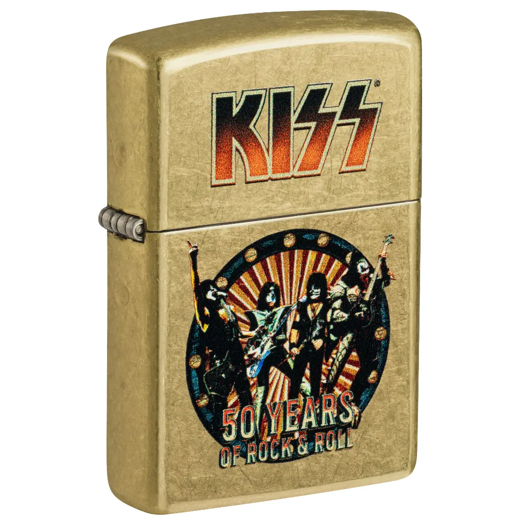 Celebrate more than 50 years of rock and roll with this classic Street Brass lighter. The KISS® logo appears over the iconic bandmates and “50 Years” inscription in a bold Color Image design. Comes packaged in a gift box. For optimal performance fill with Zippo lighter fuel.