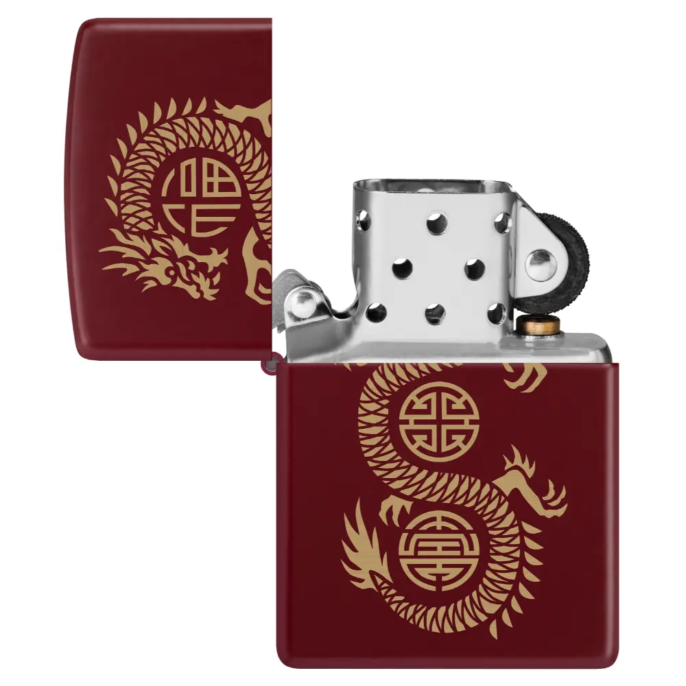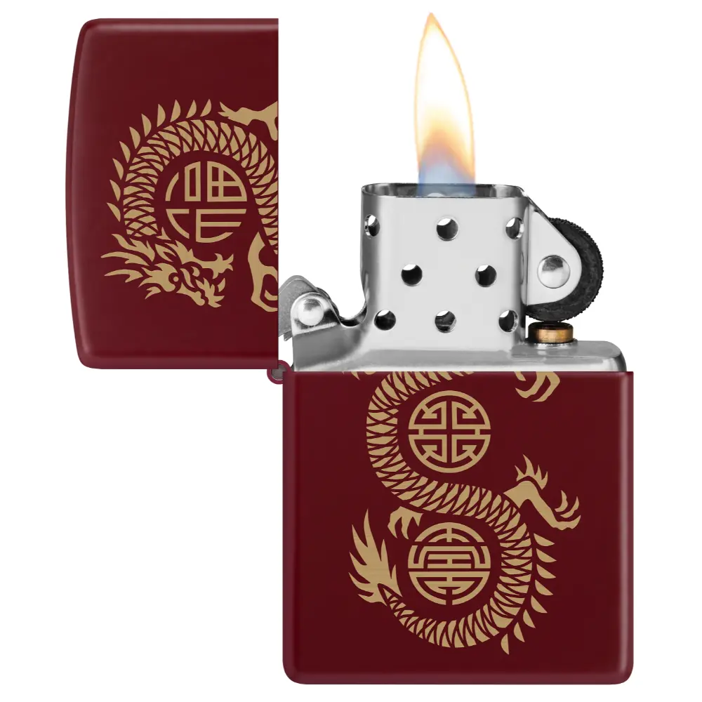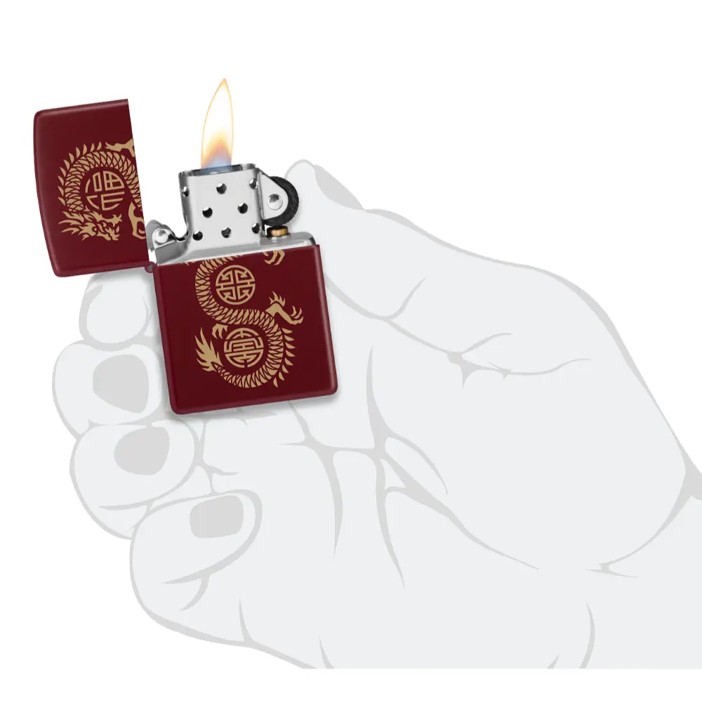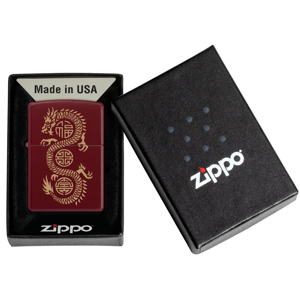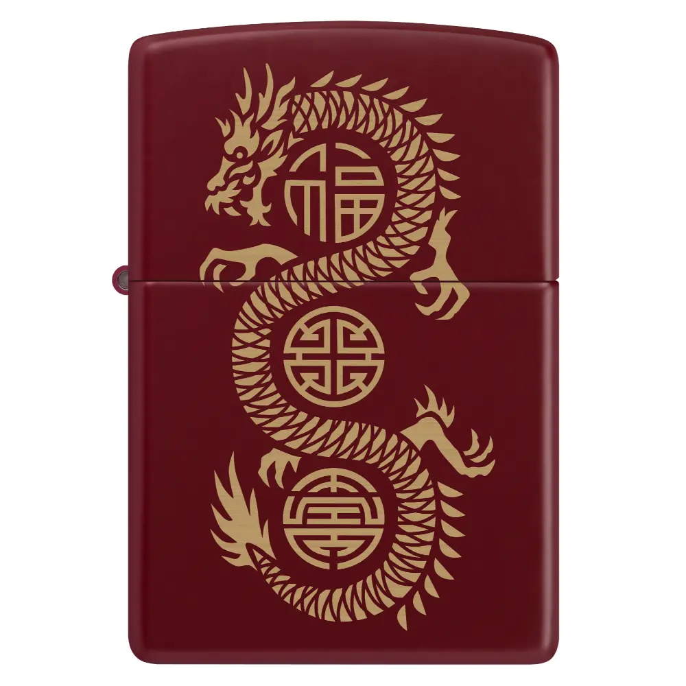 Symbolizing power, fortune and transformation, a traditional dragon is laser-engraved onto this classic Merlot lighter. Comes packaged in a gift box. For optimal performance fill with Zippo lighter fuel.