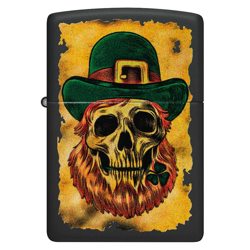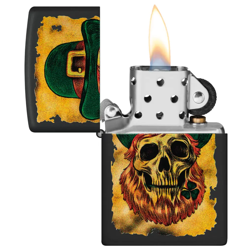 A charred treasure map unfurls on the surface of this classic Black Matte lighter in a cheerful Color Image design, featuring a weary leprechaun sporting a traditional bowler hat. Comes packaged in a gift box. For optimal performance fill with Zippo lighter fuel.
