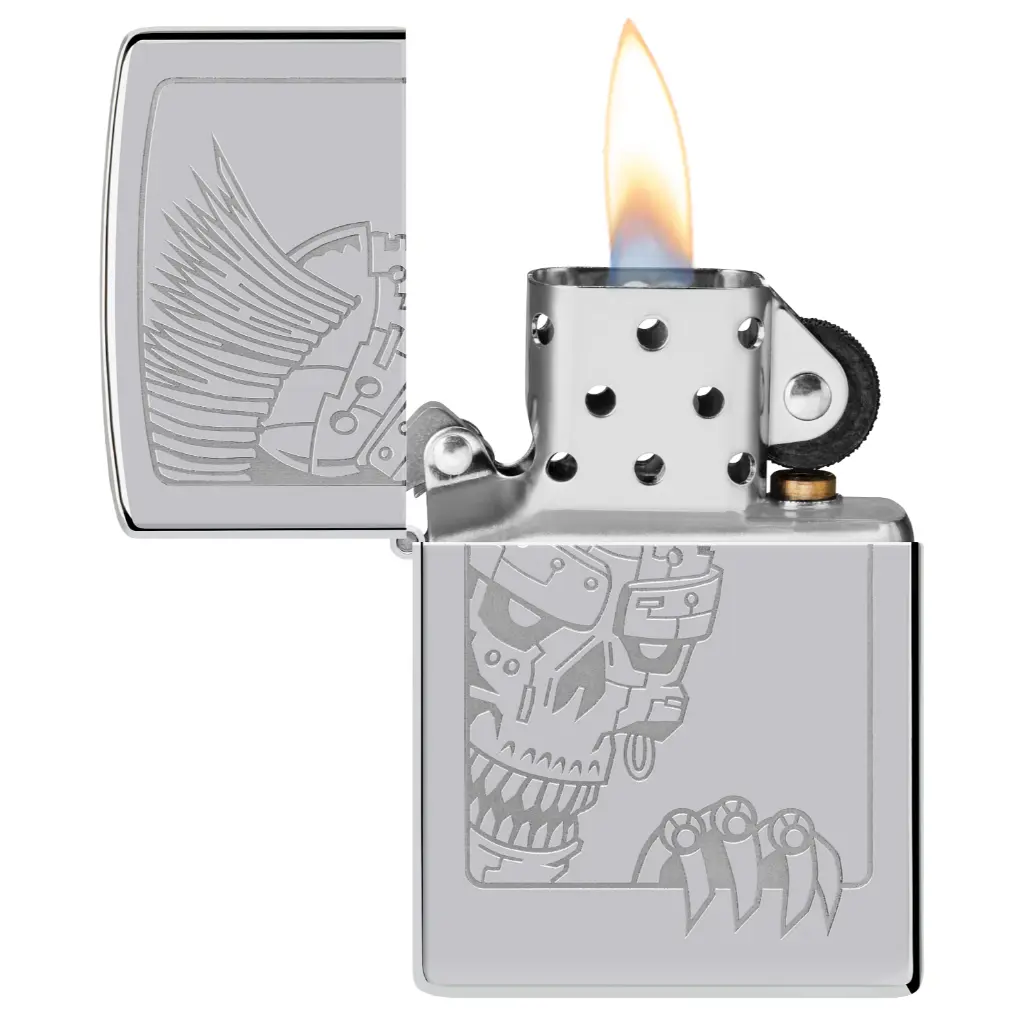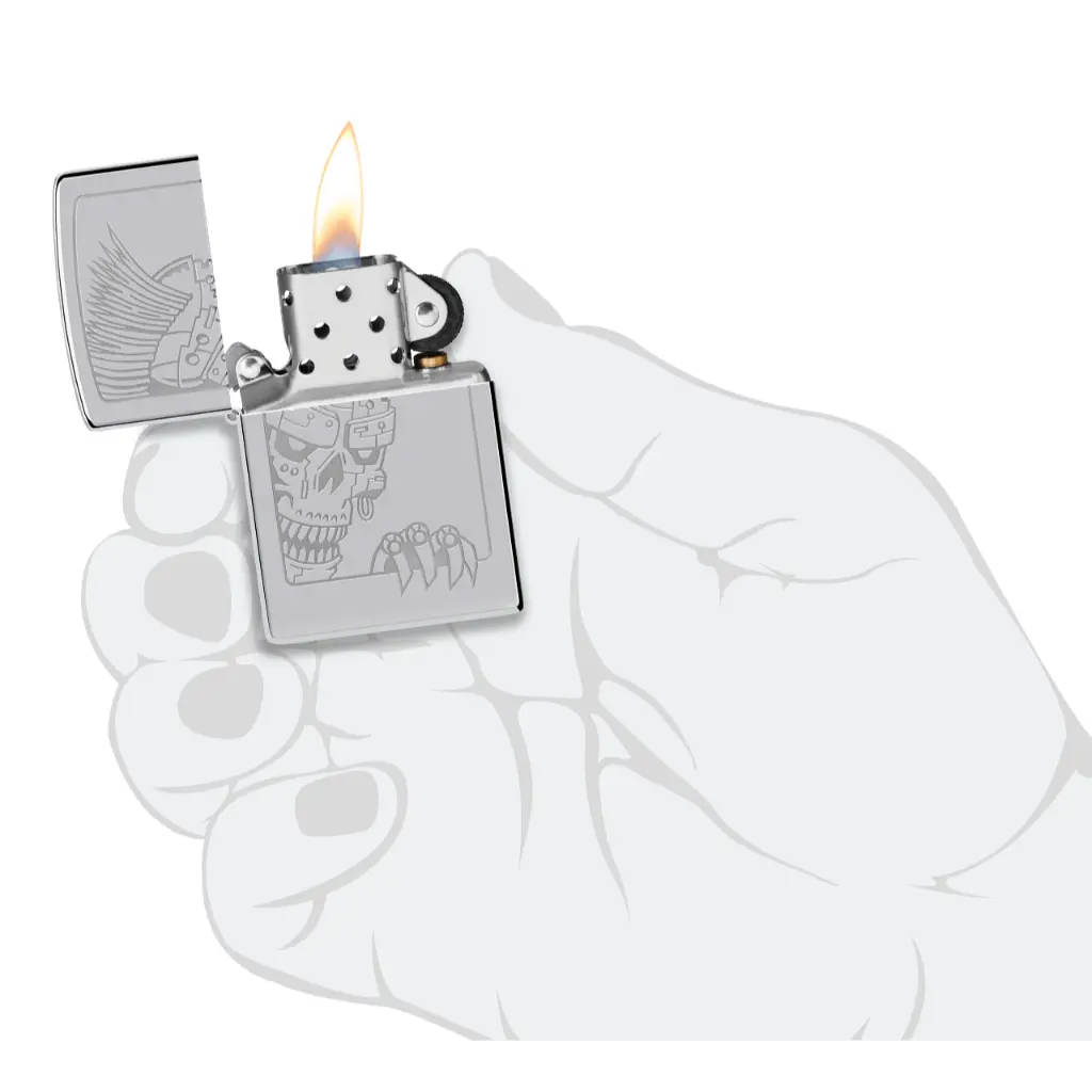 Sporting a fierce mohawk hairstyle, a grinning skeleton climbs into focus on this classic High Polish Chrome lighter in an intricate Lustre design. Comes packaged in a gift box. For optimal performance fill with Zippo lighter fuel.