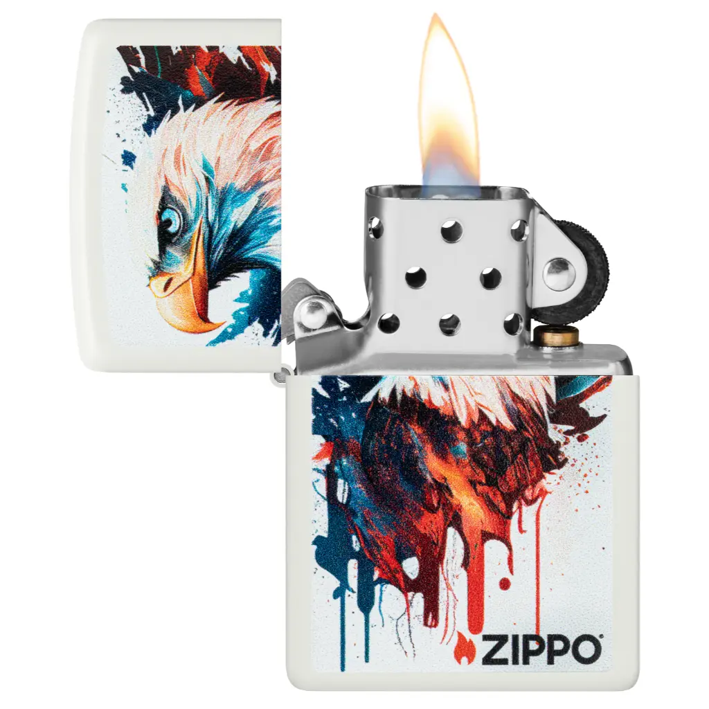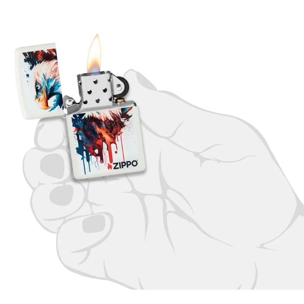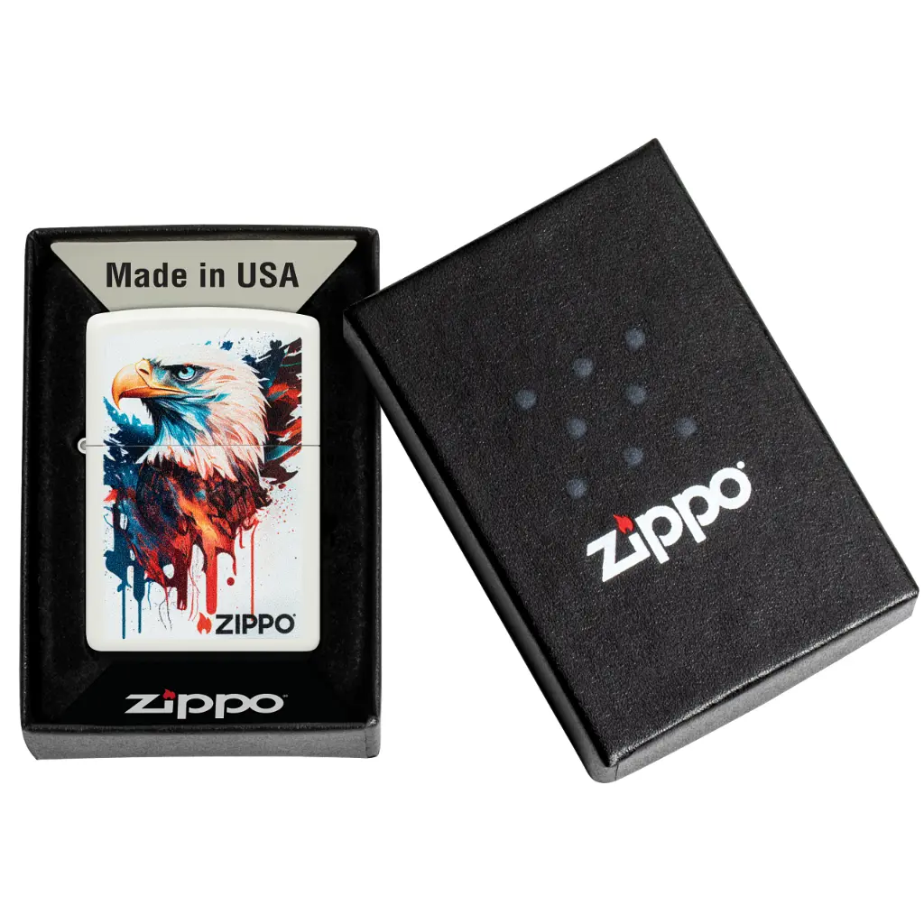 Show off your patriotic side with this classic White Matte lighter. A stoic bald eagle is captured in the vibrant Color Image design, which mimics a hand-painted portrait. Comes packaged in a gift box. For optimal performance fill with Zippo lighter fuel.