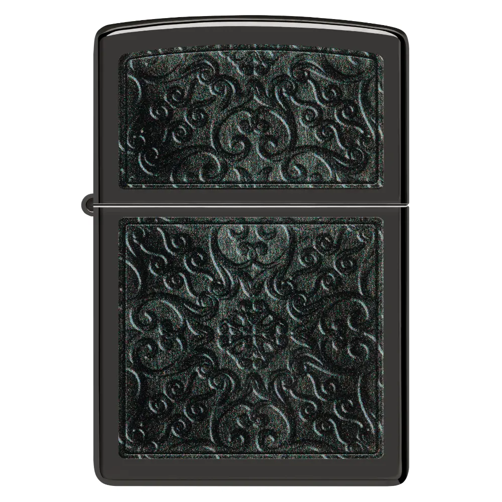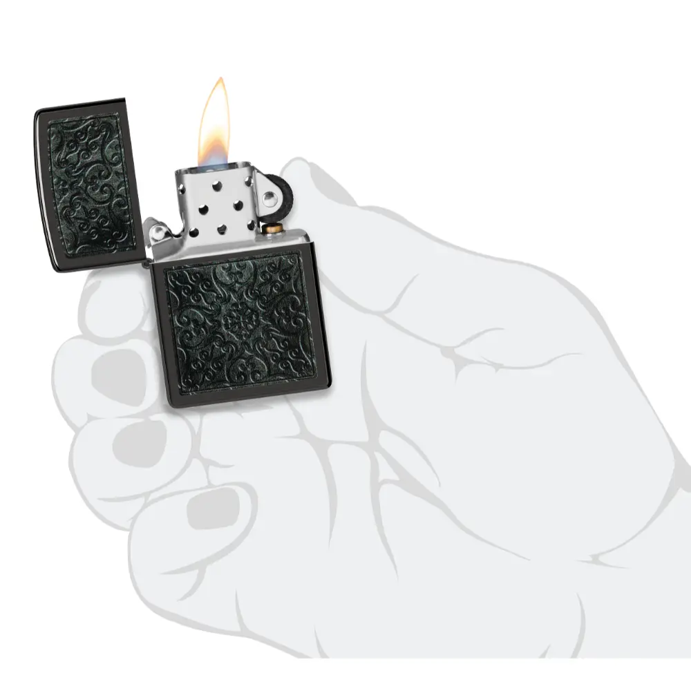 This gleaming High Polish Black lighter features a subtle motif of intricate scrollwork in a Color Image design. Comes packaged in a gift box. For optimal performance fill with Zippo lighter fuel.