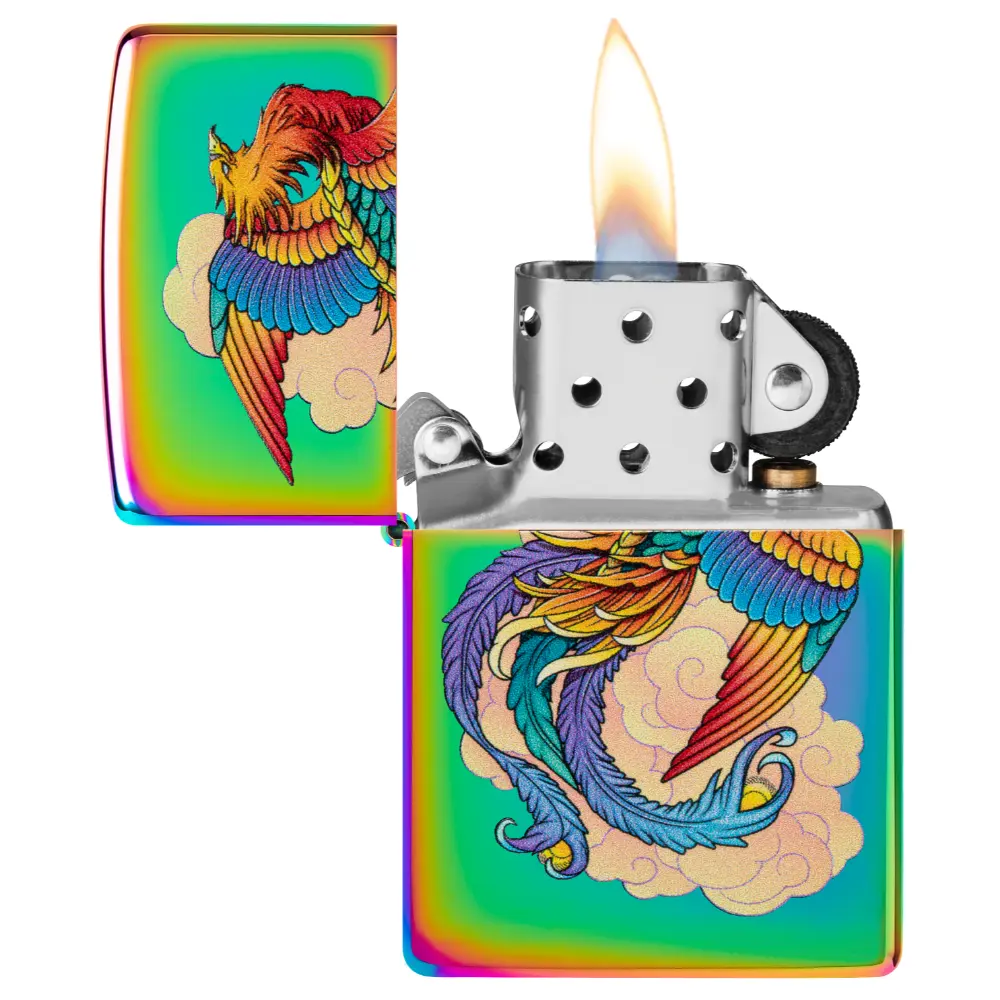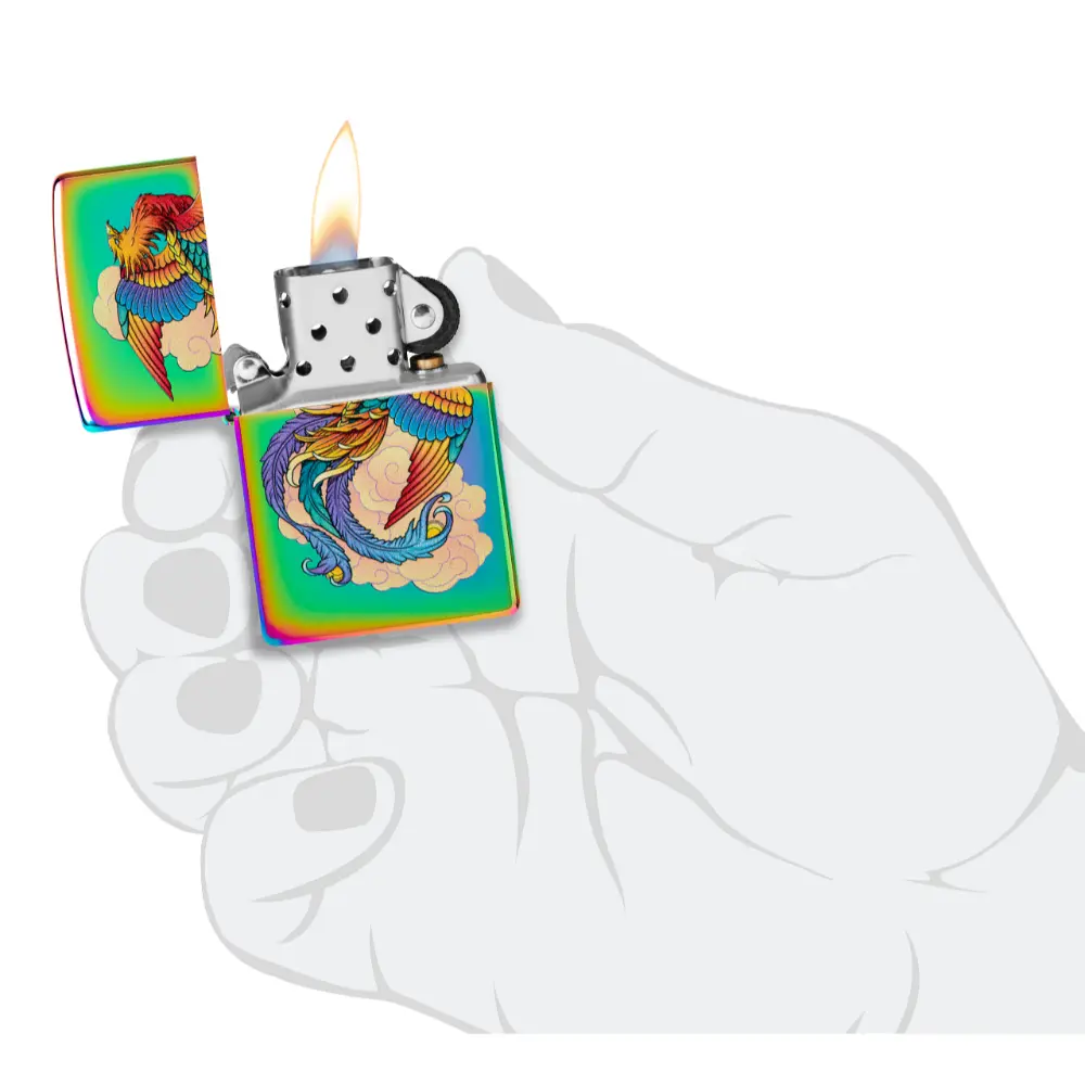 A vibrant and majestic phoenix soars across the surface of this dazzling Multi Color lighter, which mingles gracefully with the mesmerizing Color Image design. Comes packaged in a gift box. For optimal performance, fill with Zippo lighter fuel.