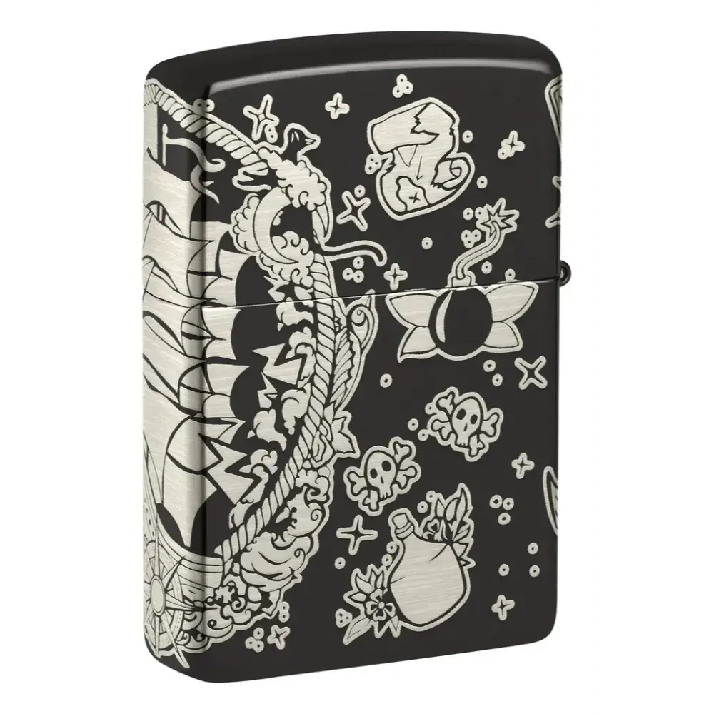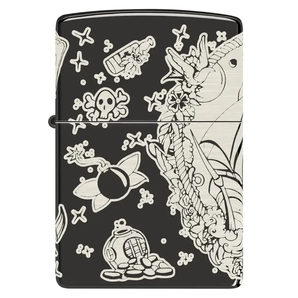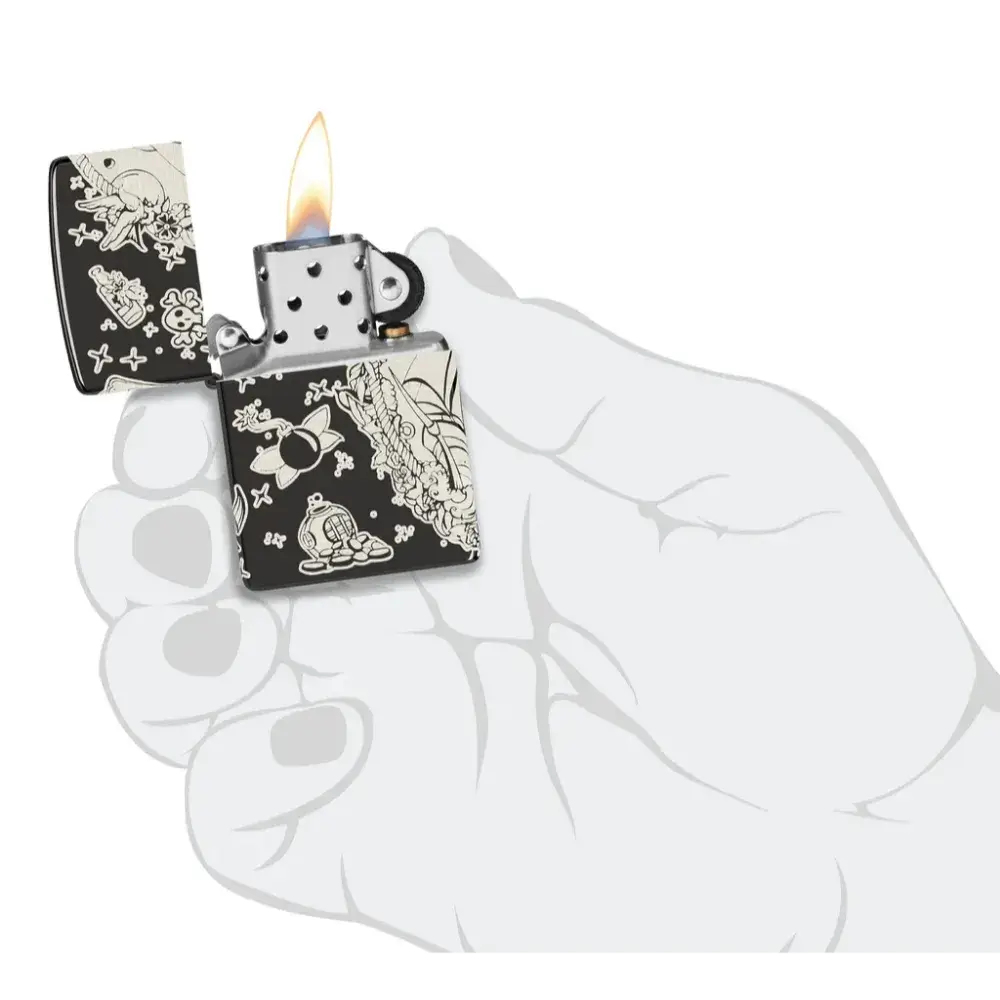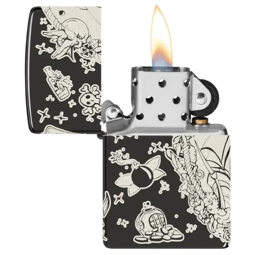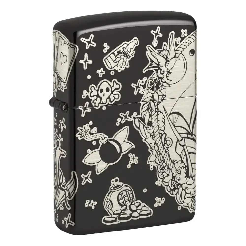 Take to the seas – or to the skies – with this nautical High Polish Black lighter. We used our Laser 360* process to surround this model on all sides with a collage of familiar tattoo-style artwork. Comes packaged in a gift box. For optimal performance fill with Zippo lighter fuel.