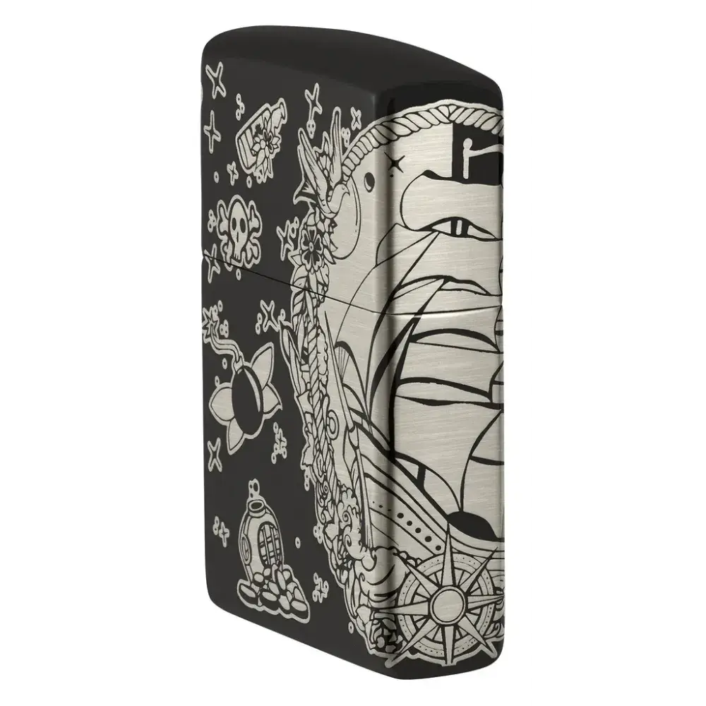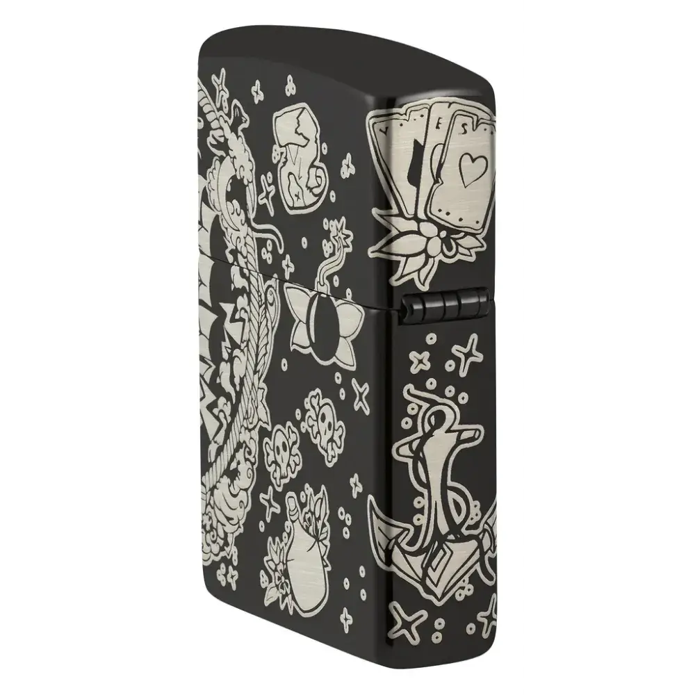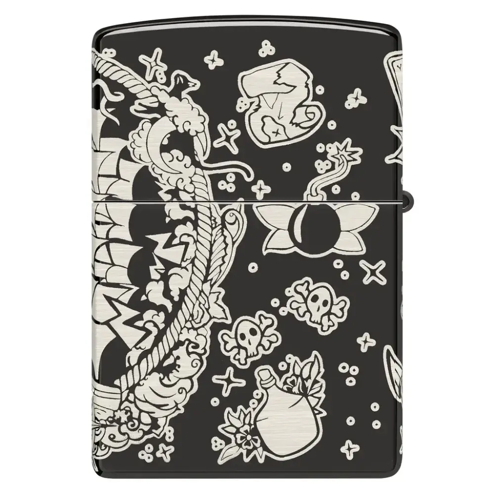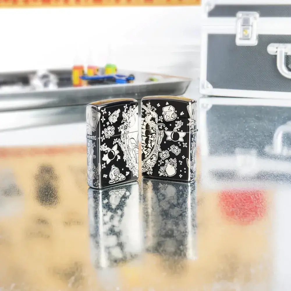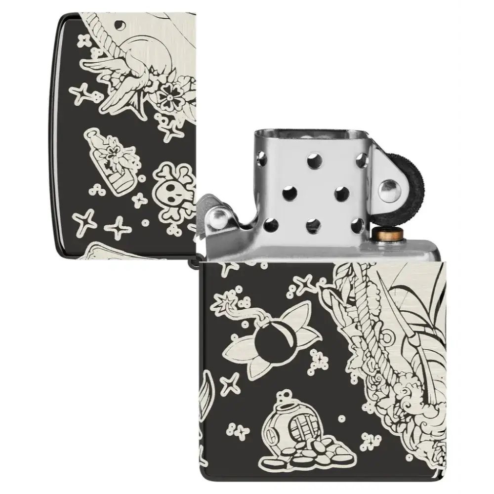 Take to the seas – or to the skies – with this nautical High Polish Black lighter. We used our Laser 360* process to surround this model on all sides with a collage of familiar tattoo-style artwork. Comes packaged in a gift box. For optimal performance fill with Zippo lighter fuel.