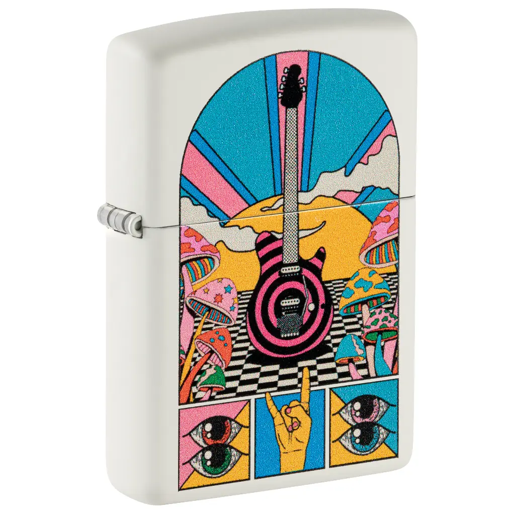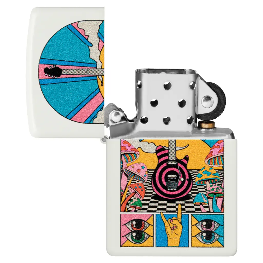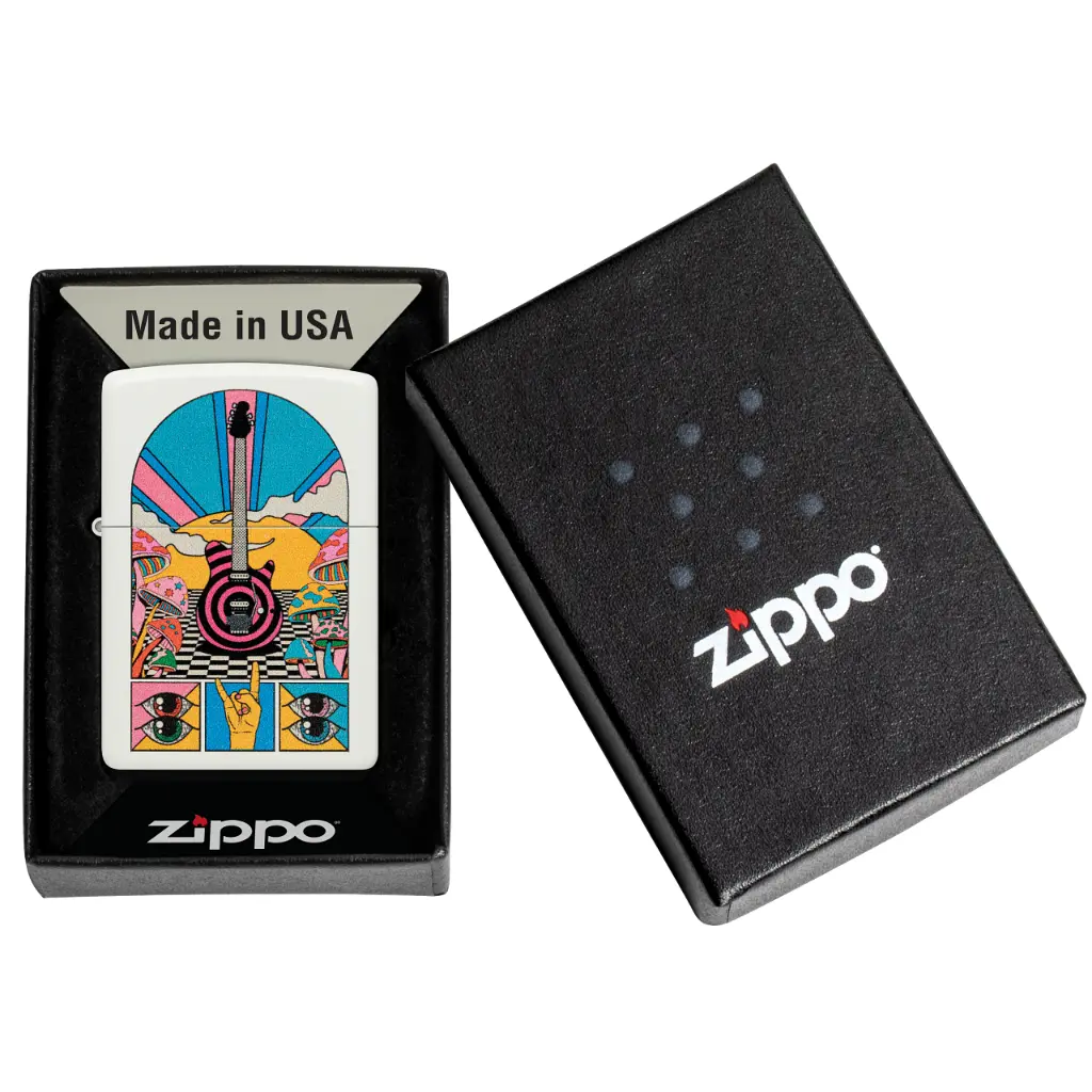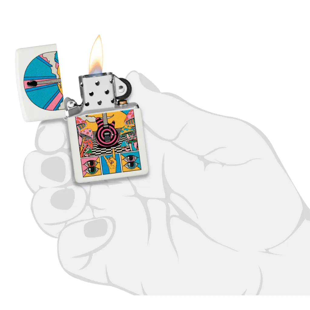 Turn up the tunes and rock on with this White Matte lighter! The fun and funky Color Image design is a music lover’s dream with it’s retro-inspired colors and patterns. Comes packaged in a gift box. For optimal performance fill with Zippo lighter fuel.