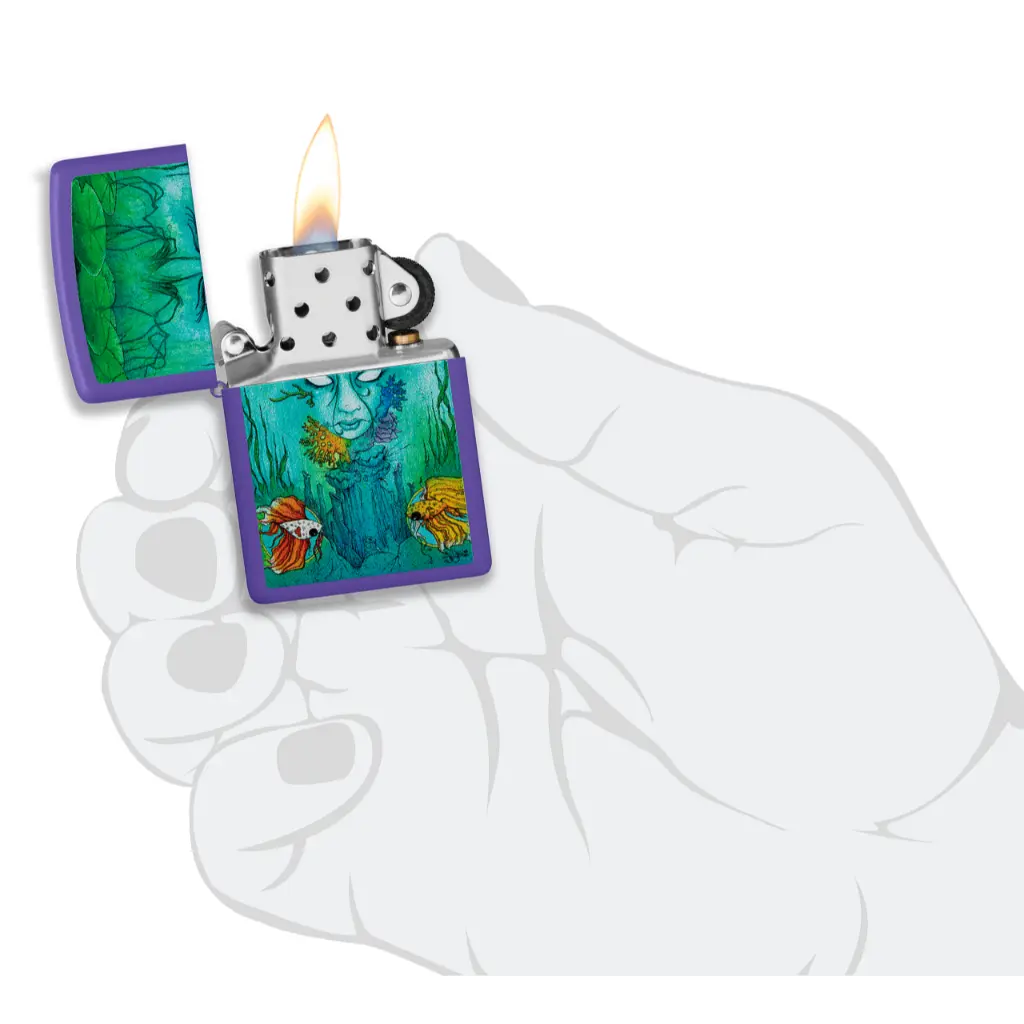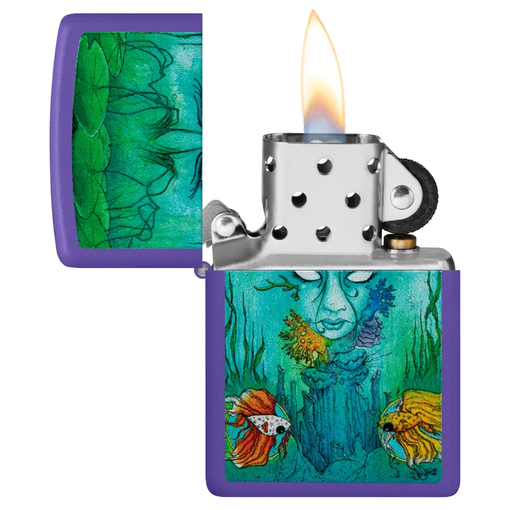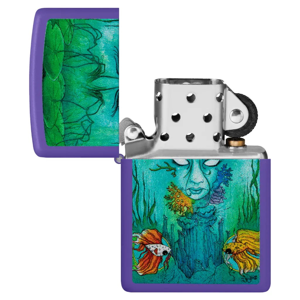 Sean Dietrich has been a prolific artist since he published his first comic at the age of 15. Specializing in fantastical and counter-cultural art, he has published 16 books, painted dozens of murals at bars, restaurants and tech-company headquarters and produced hundreds of commissioned pieces over his colorful career. This sultry Purple Matte lighter depicts his fantastical underwater scene, Brackish, in a dreamy Color Image design. Comes packaged in a gift box. For optimal performance, fill with Zippo lighter fuel.