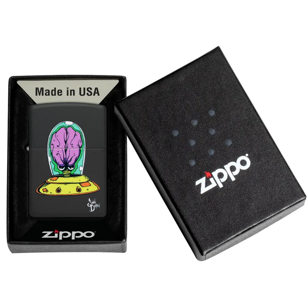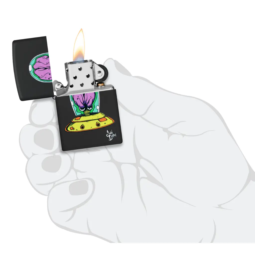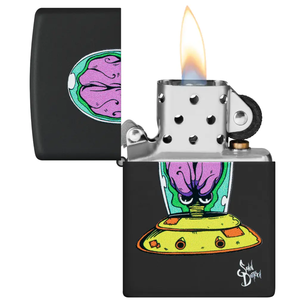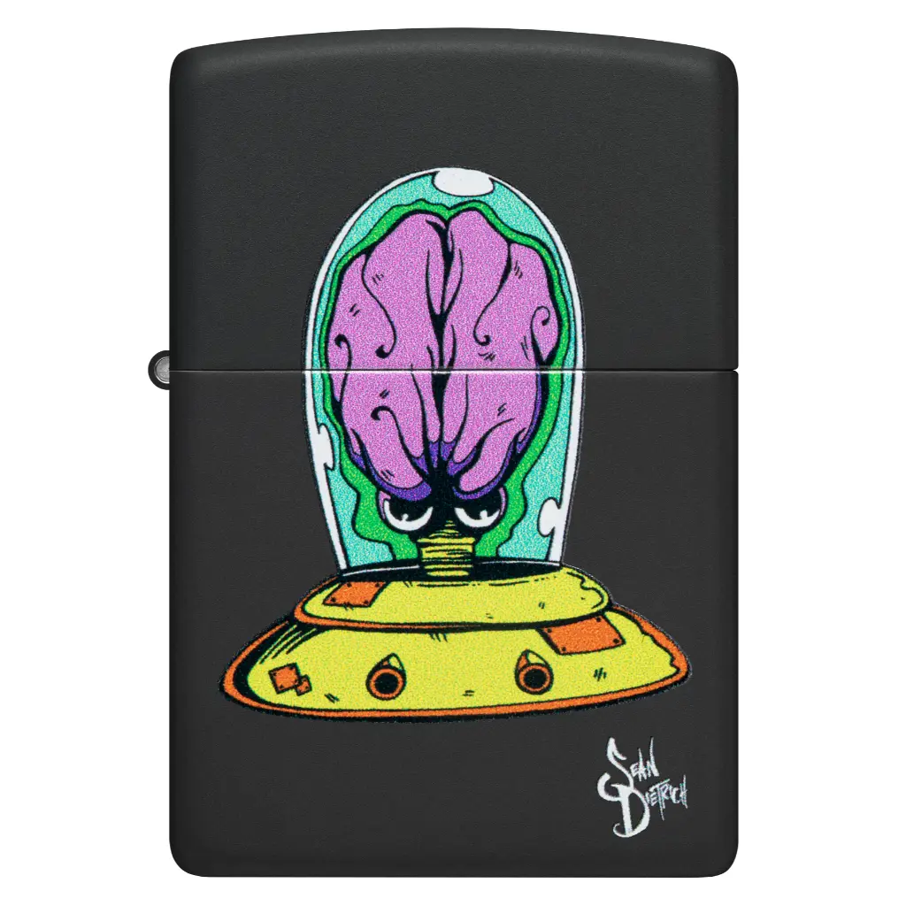 Ray guns at the ready, the space creature Michelobeo zooms through the abyss on this fantastic Black Matte lighter. This quintessential Sean Dietrich original is replicated with our Color Image process. Comes packaged in a gift box. For optimal performance, fill with Zippo lighter fuel.