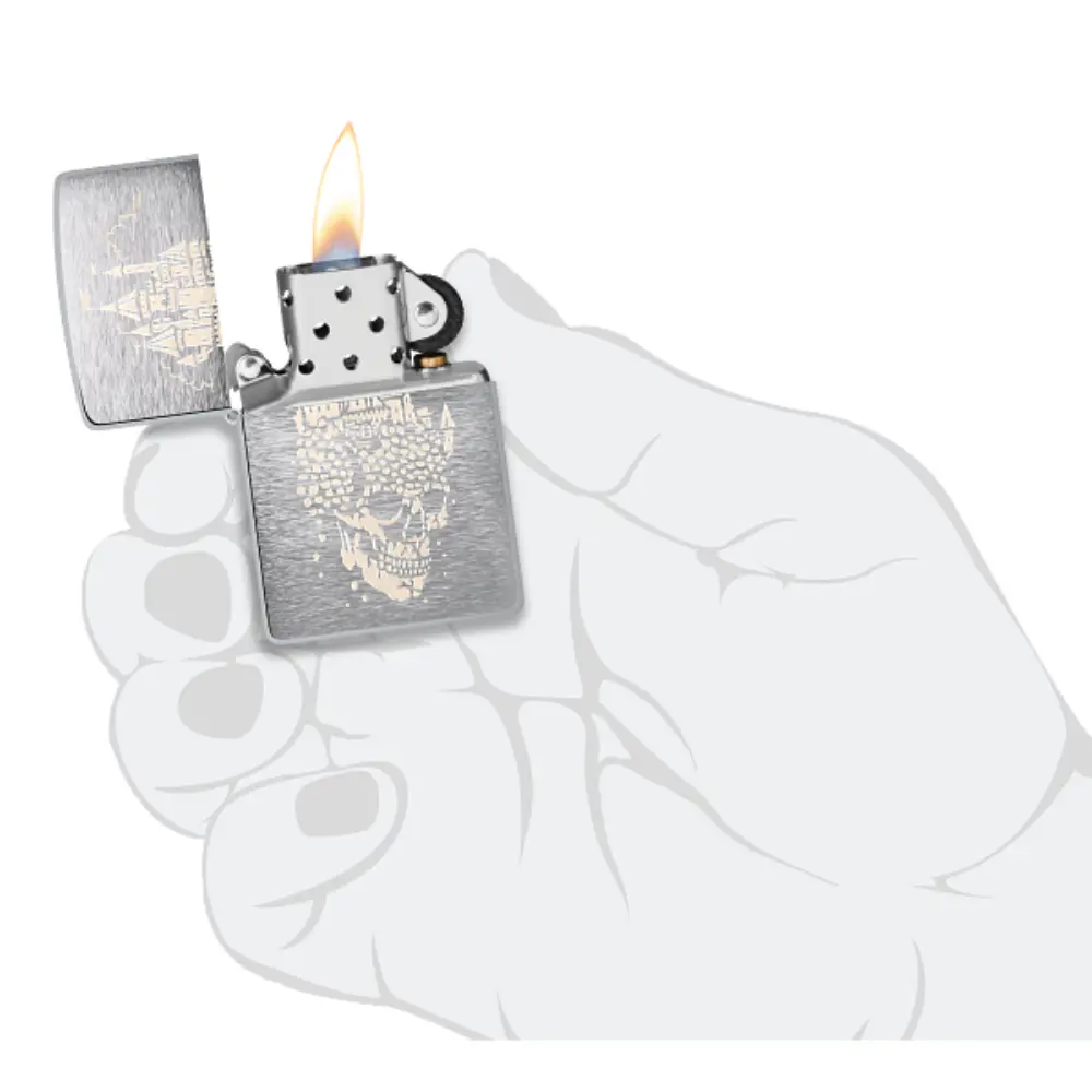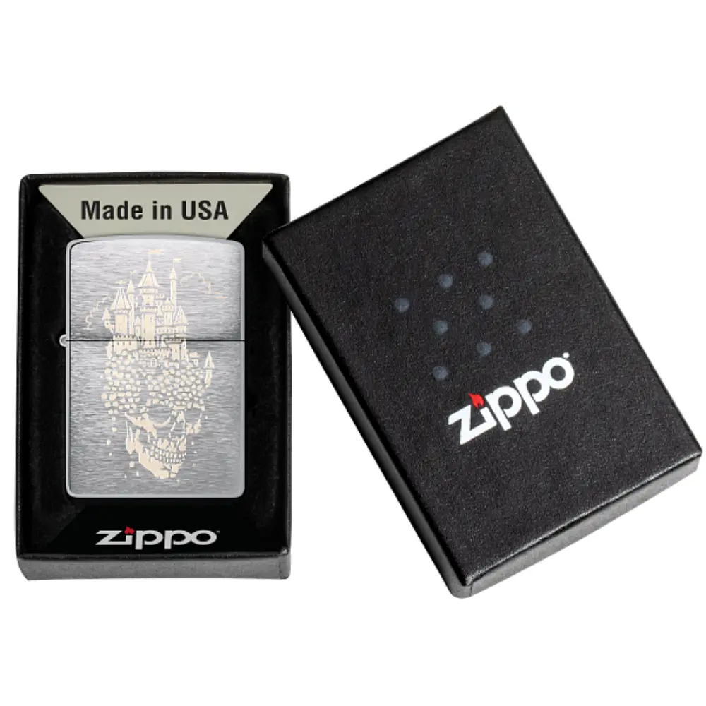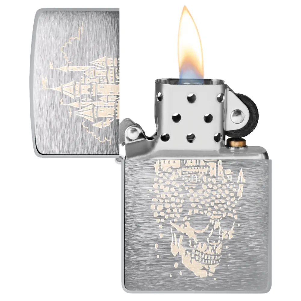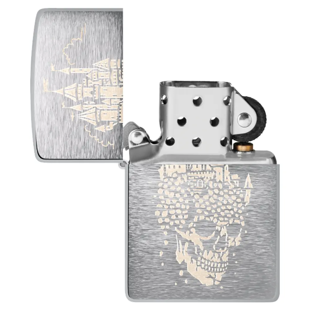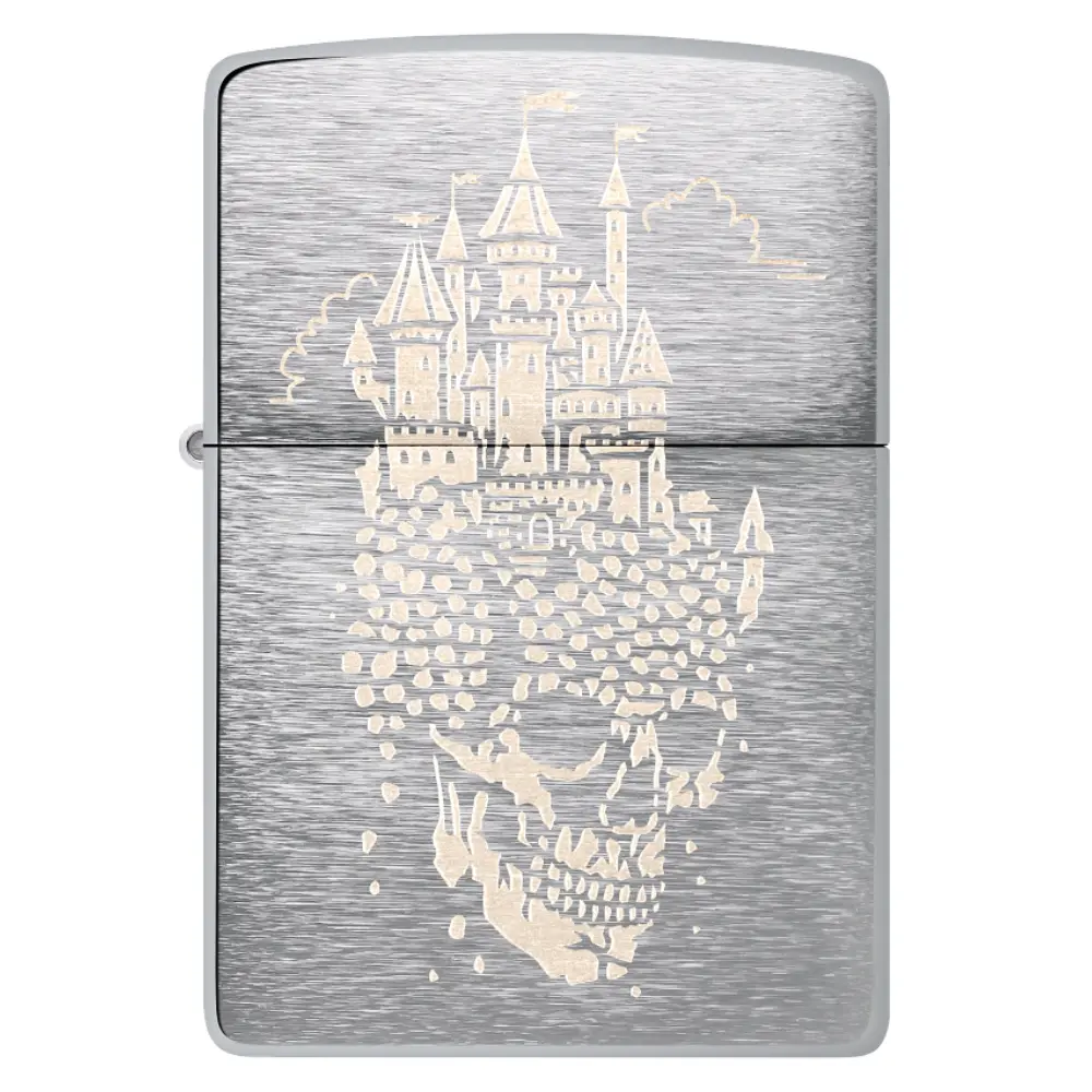 A magnificent castle looms from its perch on this classic Brushed Chrome lighter. The craggy mountaintop gives way to form a grinning skull in the intricate Laser Engrave design. Comes packaged in a gift box. For optimal performance fill with Zippo lighter fuel.