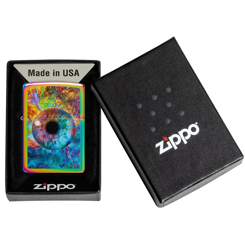 Don’t challenge this classic Multi Color lighter to a staring contest. Surrounded by vibrant colors, a mesmerizing eye gazes from the center of the piece in a Color Image design. Comes packaged in a gift box. For optimal performance fill with Zippo lighter fuel.