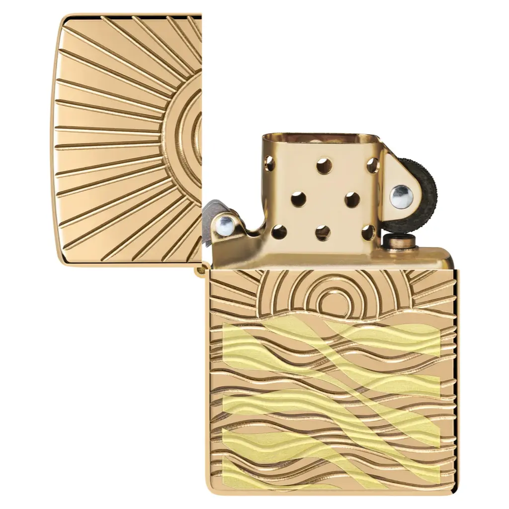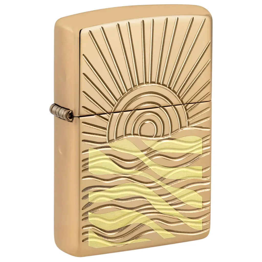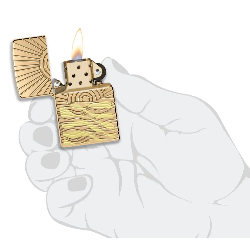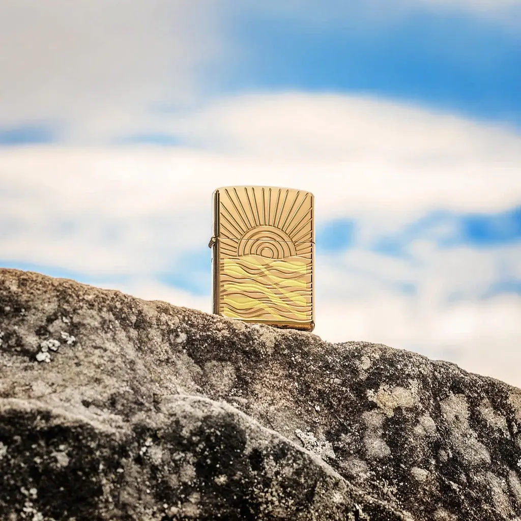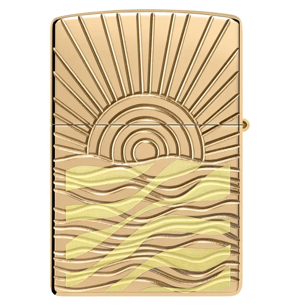 This Armor® High Polish Brass lighter gracefully captures the beauty of the sun peaking over serene waters in a luxurious two-sided Deep Carve design. Comes packaged in a gift box. For optimal performance, fill with Zippo lighter fuel.
