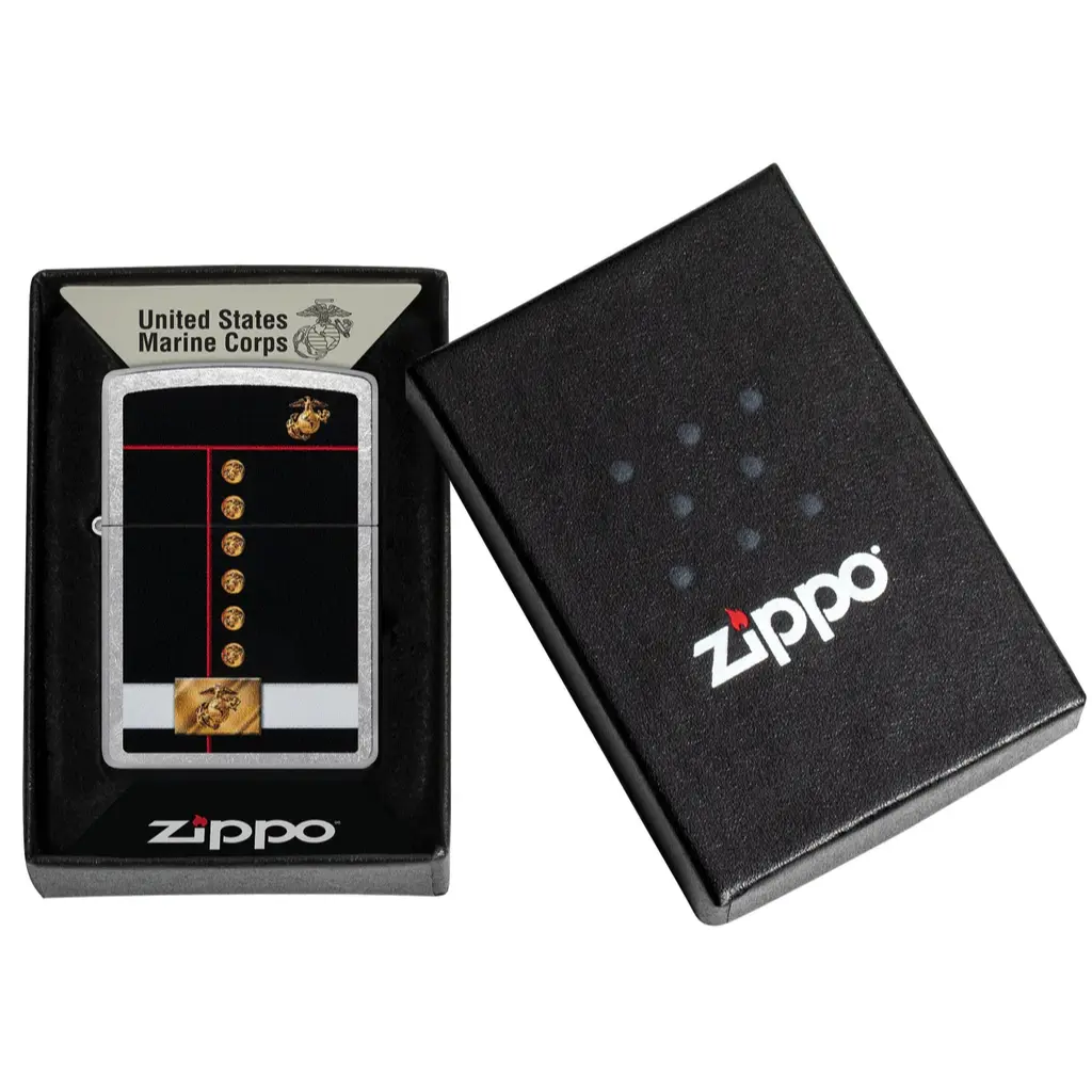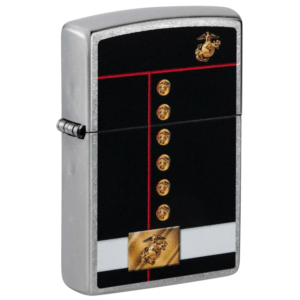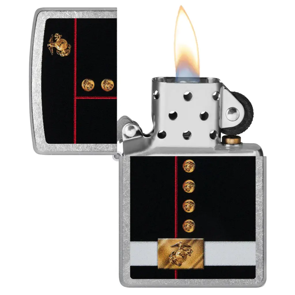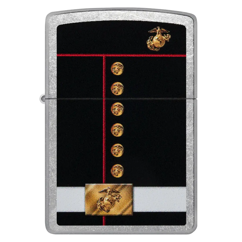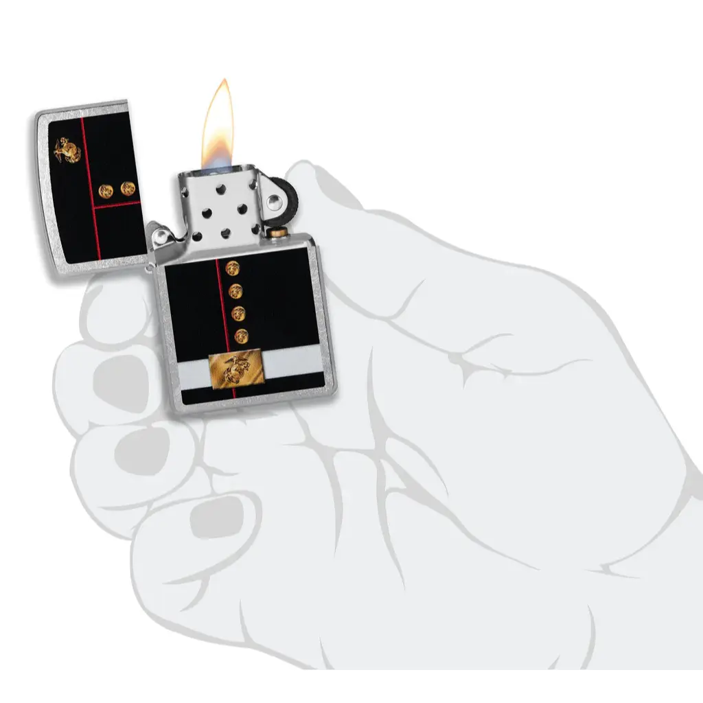 The Eagle, Globe and Anchor is fastened atop the iconic Dress Blues of the United States Marine Corps in this stunning Color Image design, which proudly appears on a classic Street Chrome Lighter. Comes packaged in a gift box. For optimal performance, fill with Zippo lighter fuel.