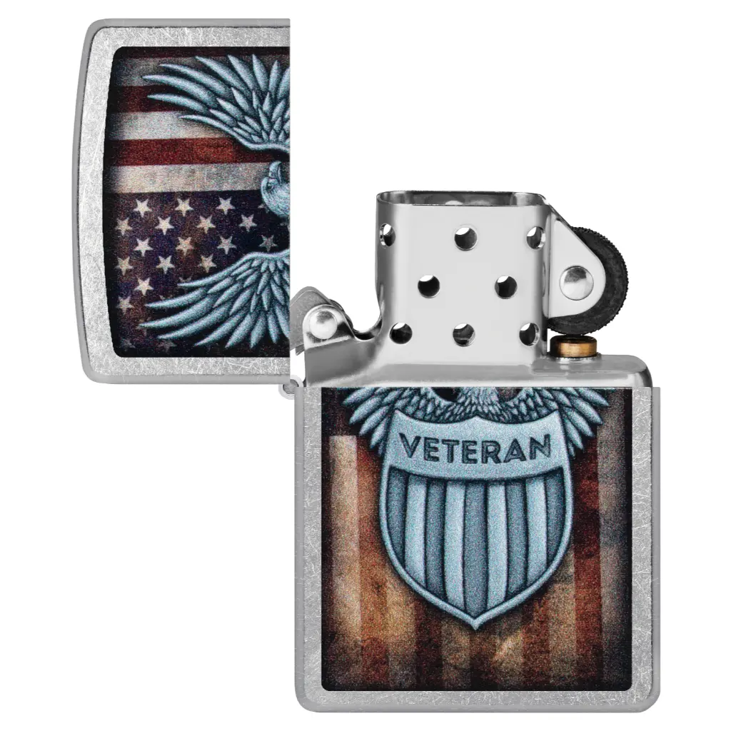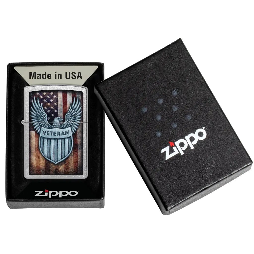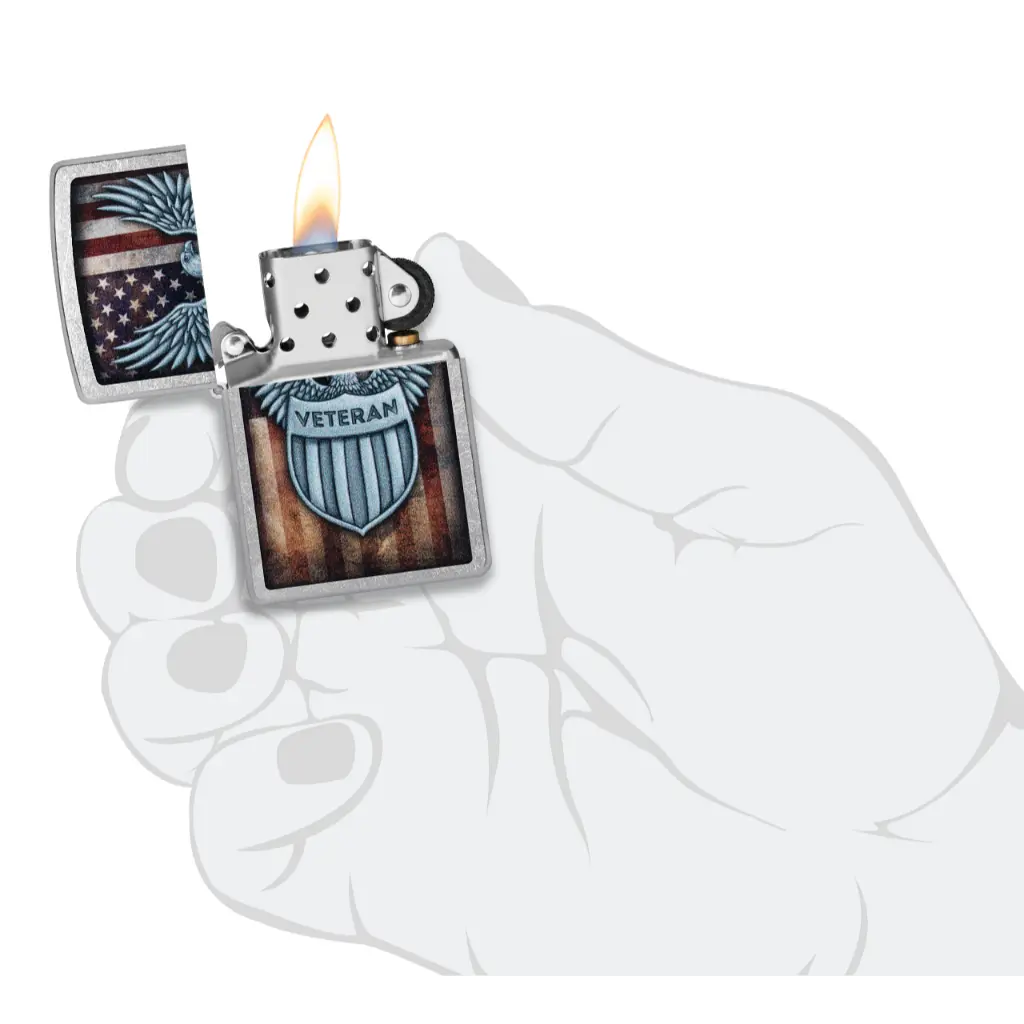This classic Street Chrome lighter pays homage to all who defend our nation with a bold Color Image design featuring a “Veteran” badge over a muted American flag backdrop. Comes packaged in a gift box. For optimal performance fill with Zippo lighter fuel.