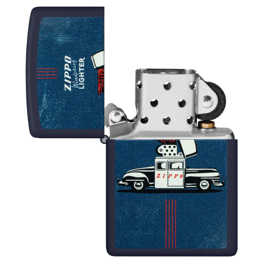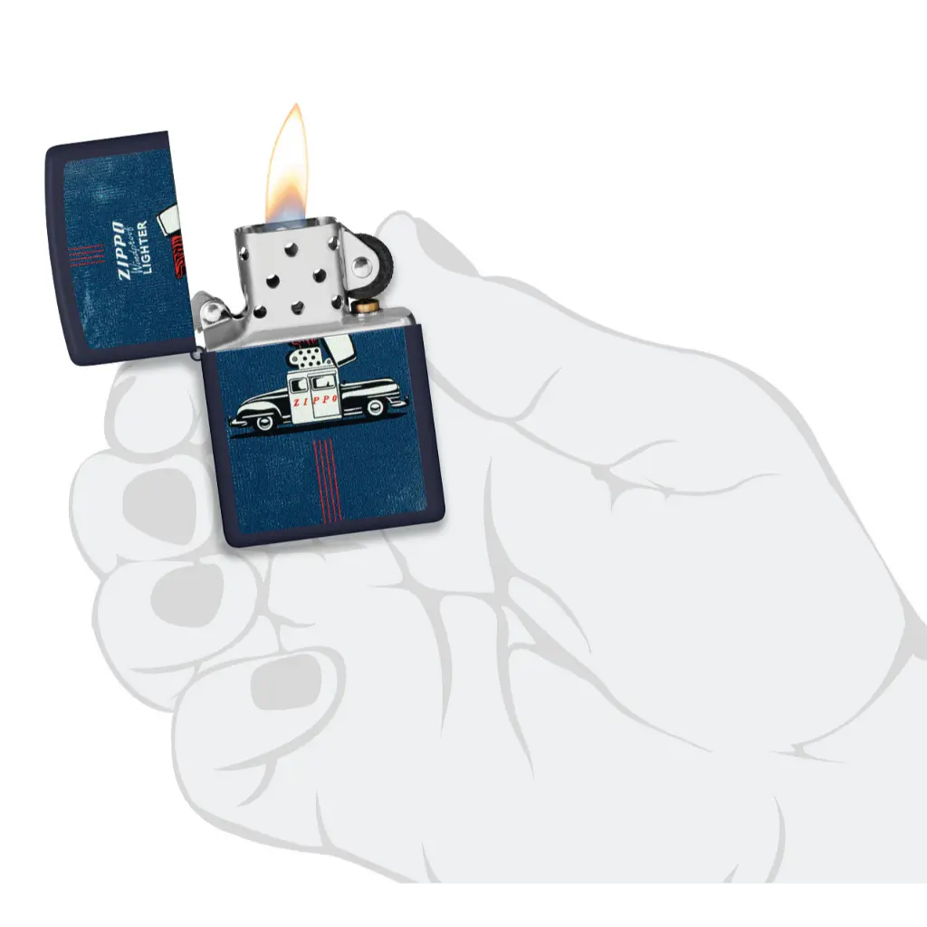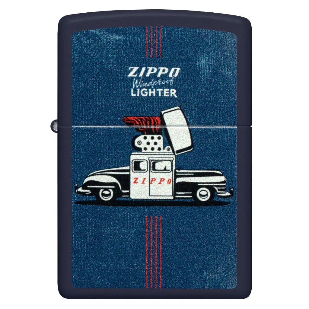The iconic Zippo Car is pictured in all its glory on both front and back surfaces of this classic Navy Matte lighter in dual Color Image designs. Comes packaged in a gift box. For optimal performance fill with Zippo lighter fuel.