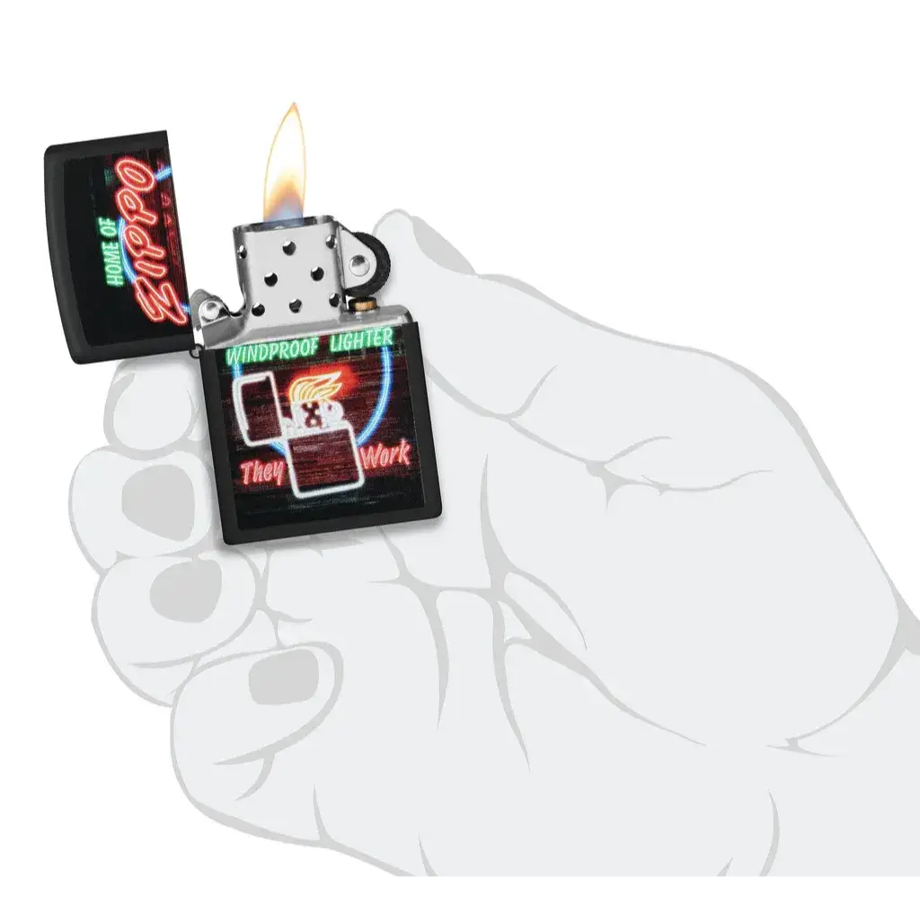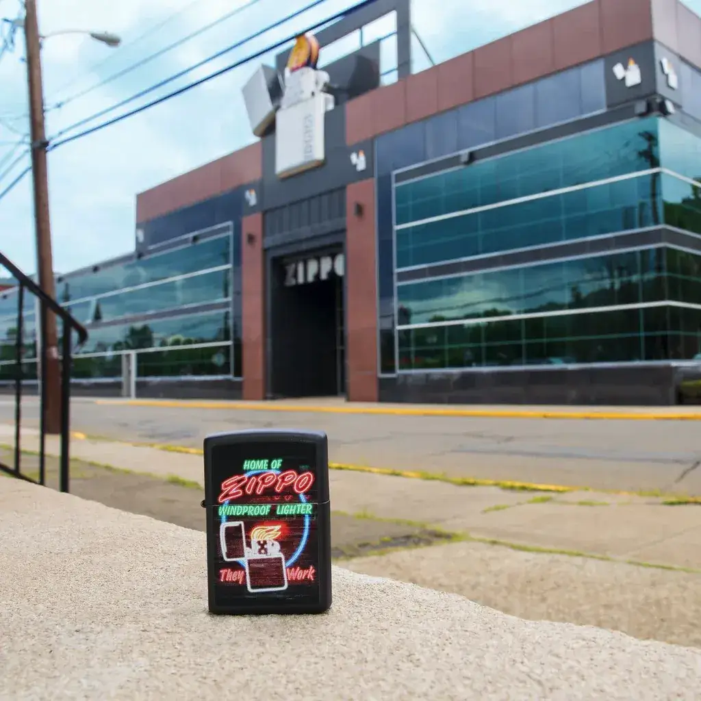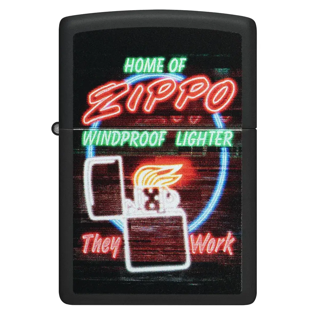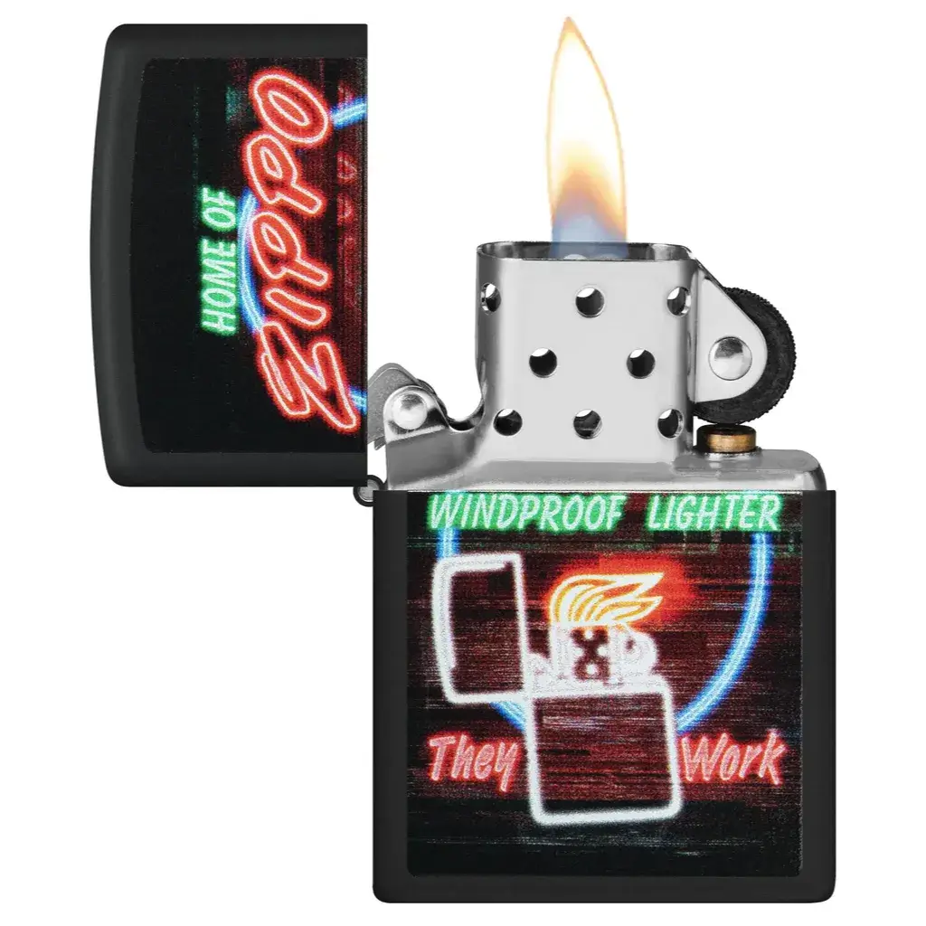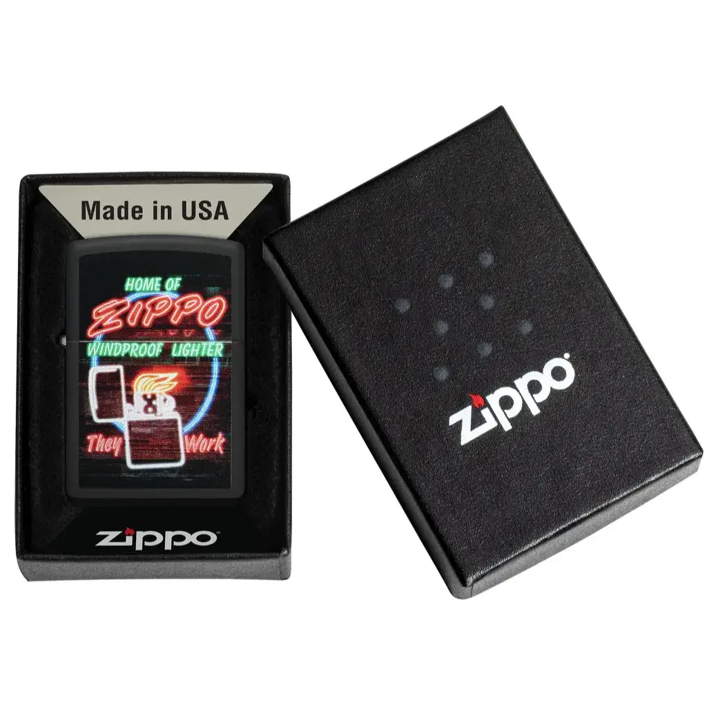 Now you don’t have to travel to Bradford, PA to catch a glimpse of Zippo’s famous neon sign! This Black Matte lighter features a slightly scaled-down version of the iconic glowing beauty represented in dazzling Color Image. Comes packaged in a gift box. For optimal performance fill with Zippo lighter fuel.