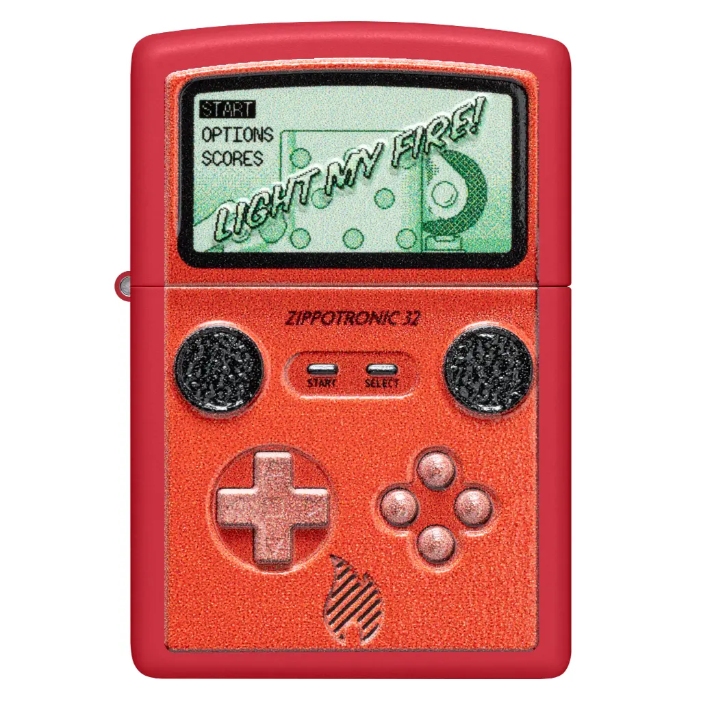 Relive your favorite retro video game with this classic Red Matte lighter. A handheld gaming device is rendered in our Texture Print process for a realistic and nostalgic feel. Comes packaged in a gift box. For optimal performance fill with Zippo lighter fuel.