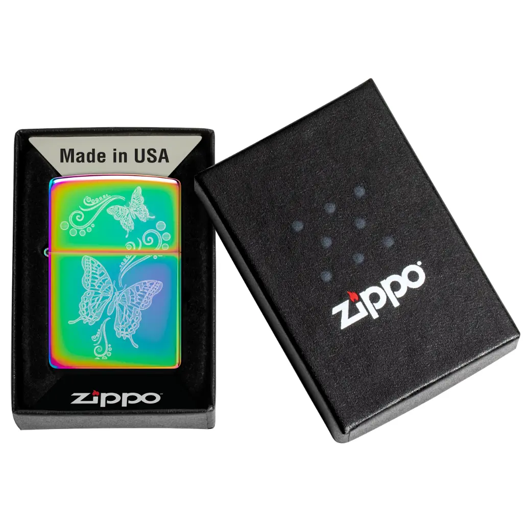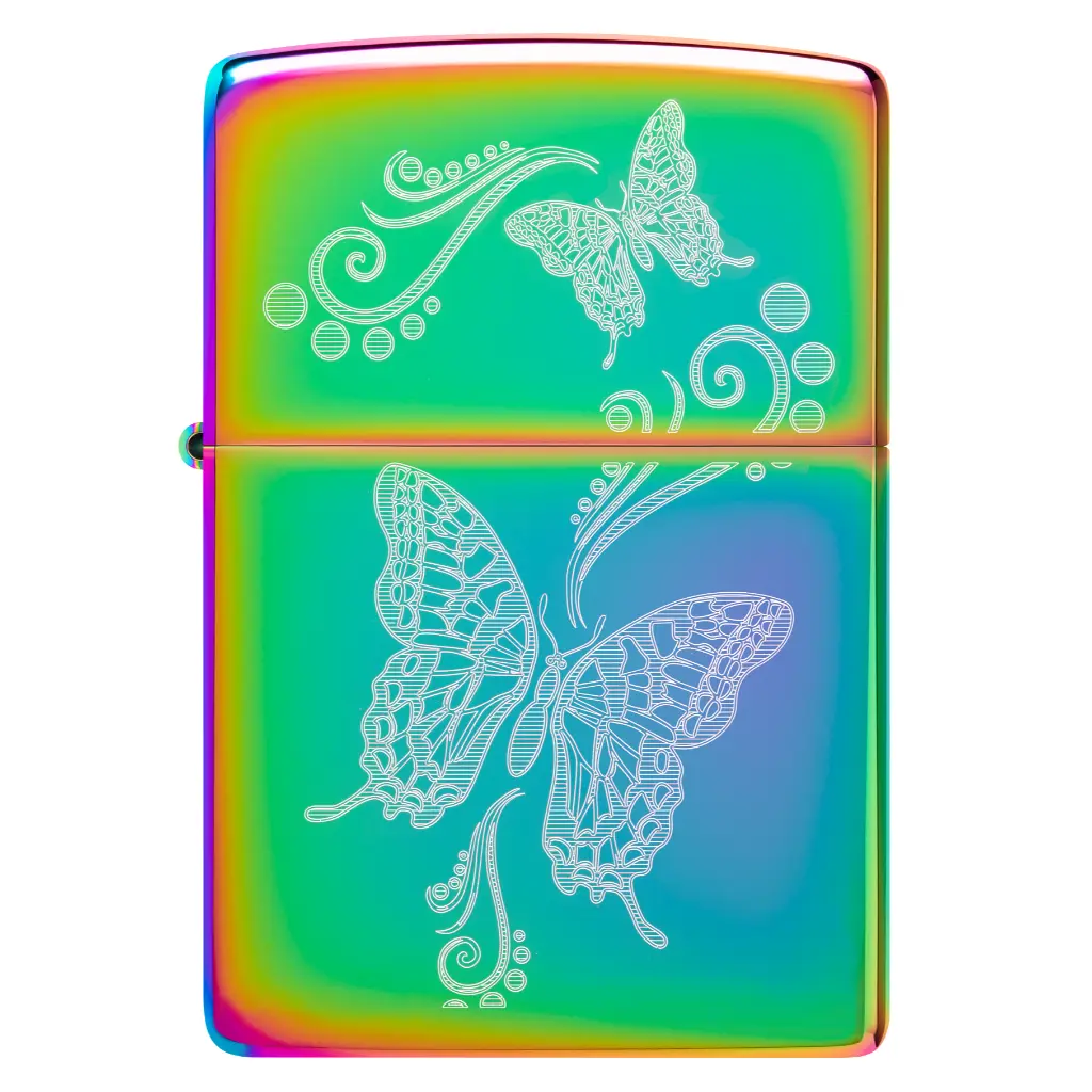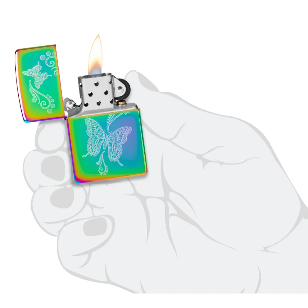 Okružen lepršavim filigranom, dvojac nježnih leptira leprša i leprša po površini ovog prekrasnog višebojnog upaljača u zamršenom dizajnu Laser Fancy Fill. Dolazi pakiran u poklon kutiji.