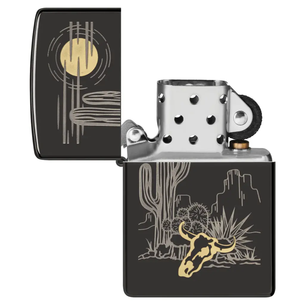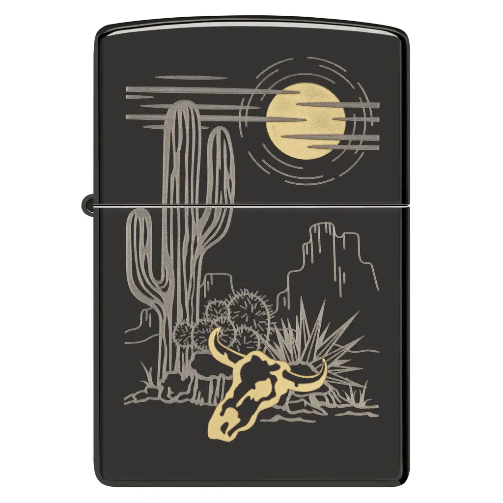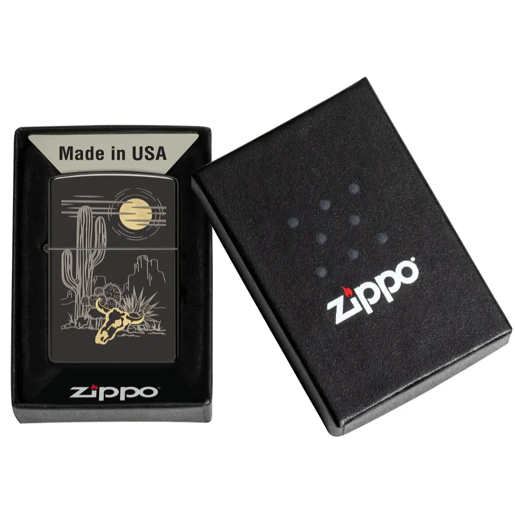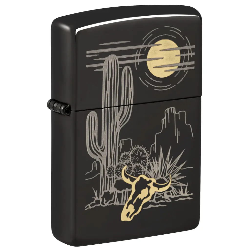 Pustinjski krajolik vješto je ugraviran na ovaj klasični High Polish Black upaljač u minimalističkom laserskom dvobojnom dizajnu. Suptilni mjedeni akcenti upotpunjuju sliku.