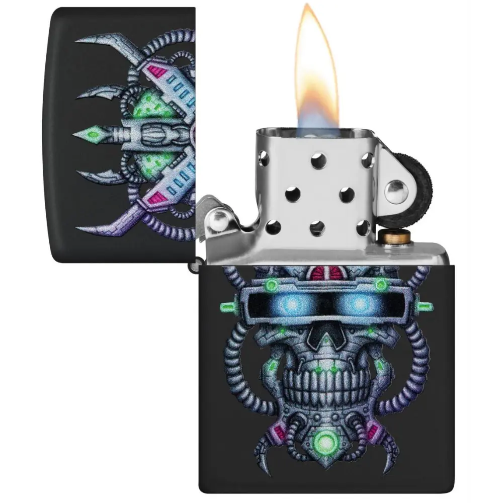 Ovaj dizajn kibernetičke lubanje je materijal za futurističke noćne more. Bionički komandni centar zuji živopisnim strujnim krugovima u ovom dizajnu Color Image, koji kao da svjetluca naspram crnog mat upaljača.