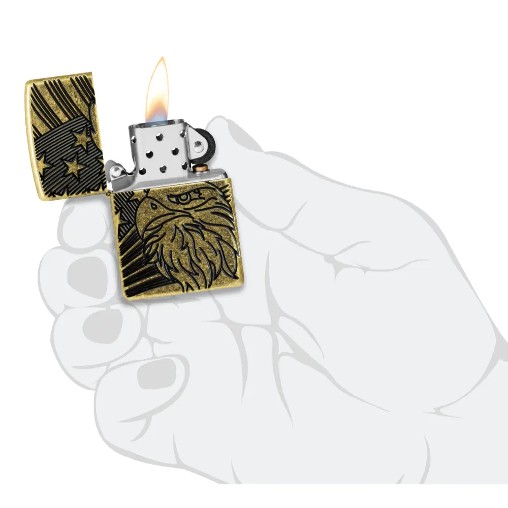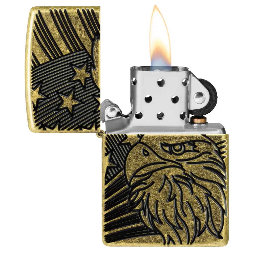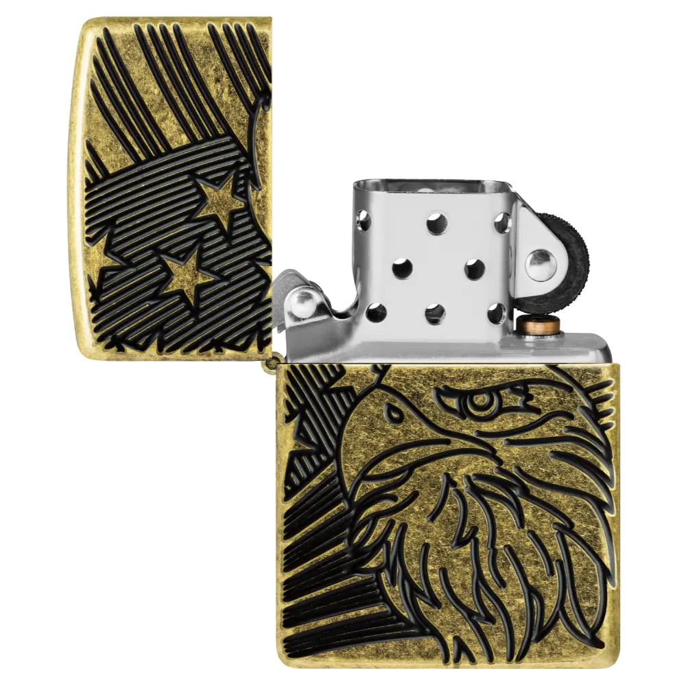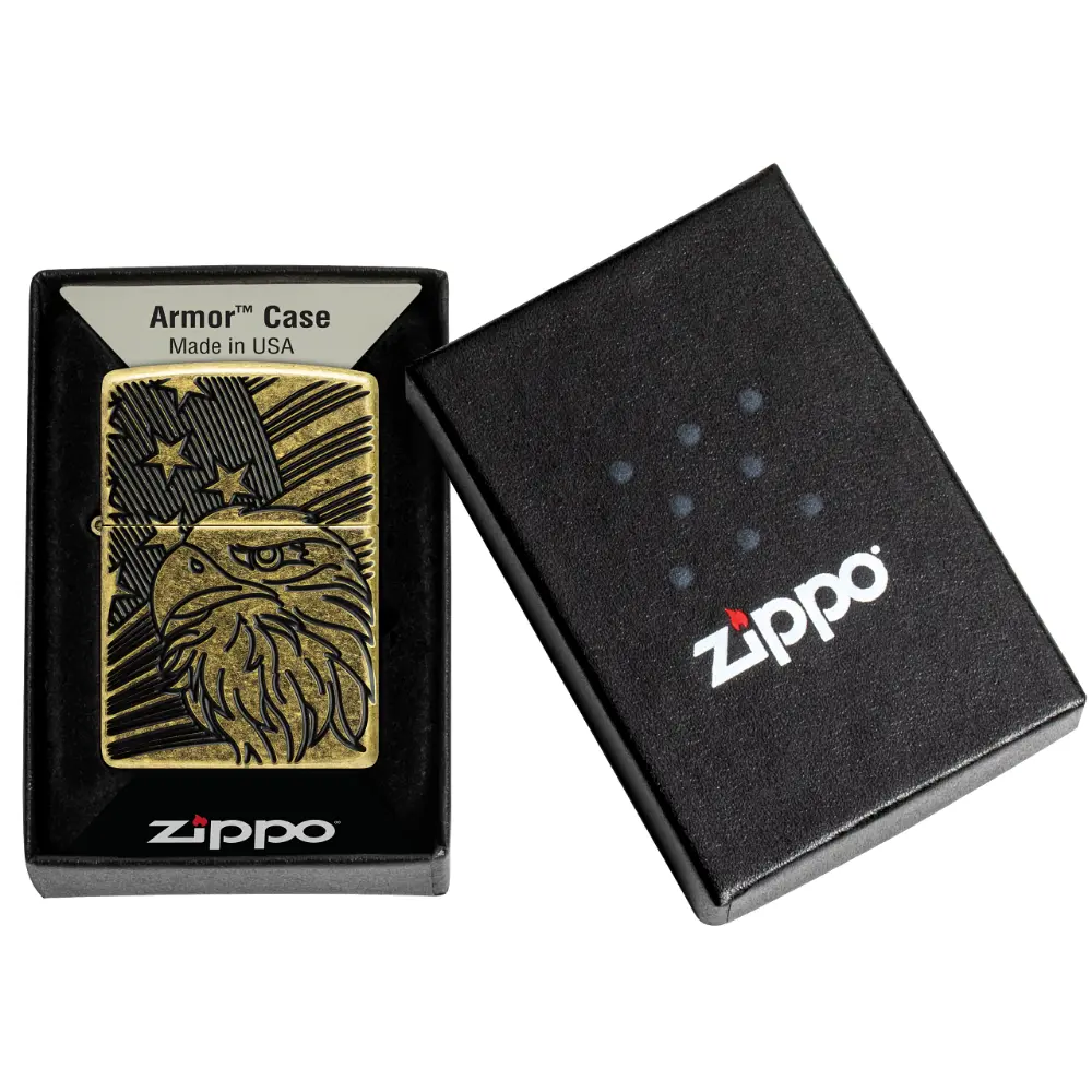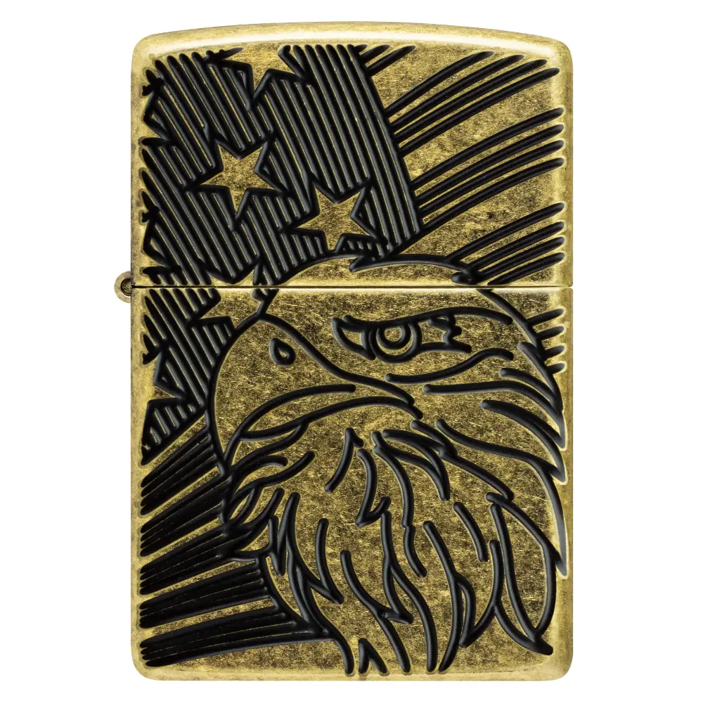 Američki ponos je vidljiv s ovim bezvremenskim upaljačem Armor® Antique Brass. Zamršeni ćelavi orao ponosno stoji ispred američke zastave u bogato teksturiranom dizajnu Deep Carve. Dolazi pakiran u poklon kutiji.