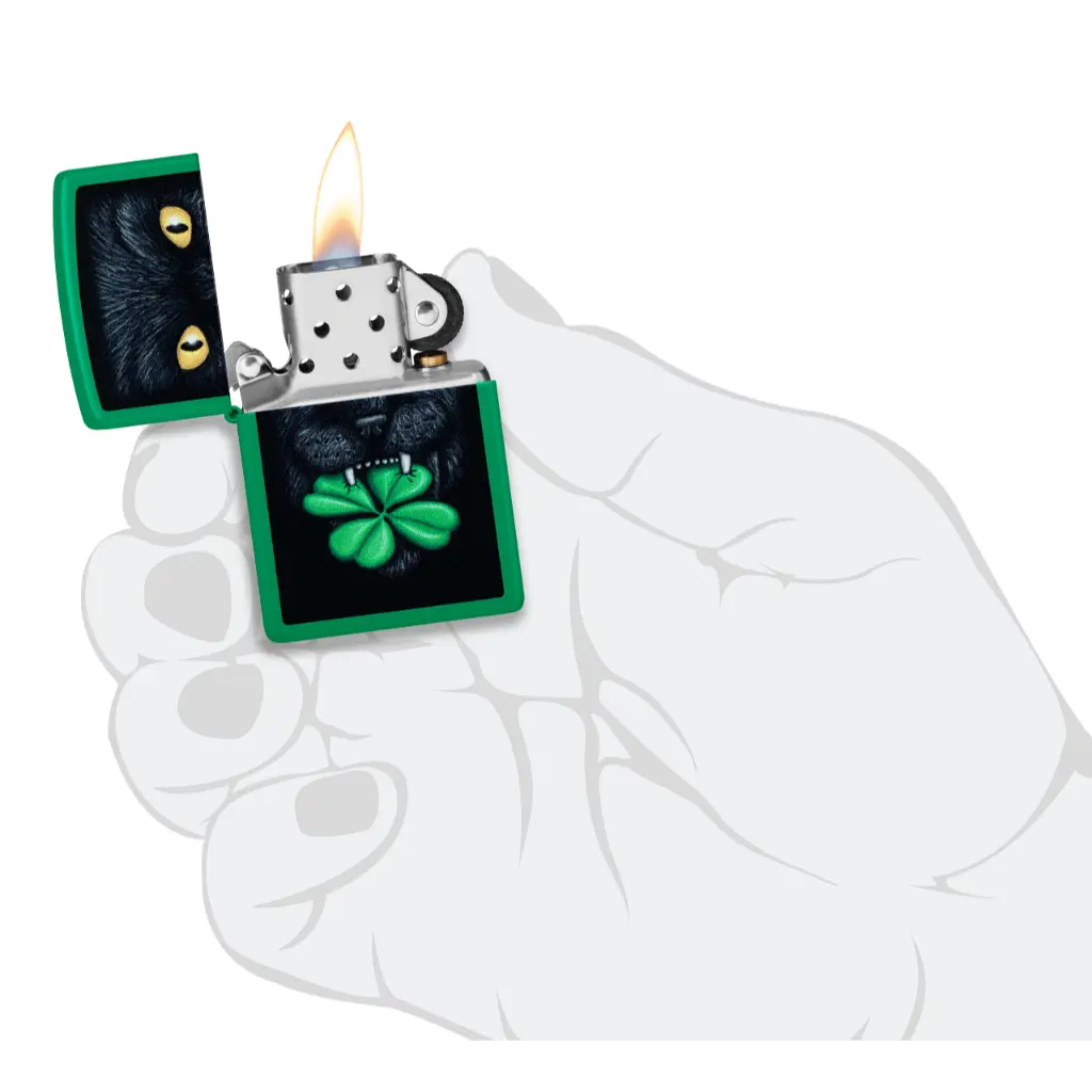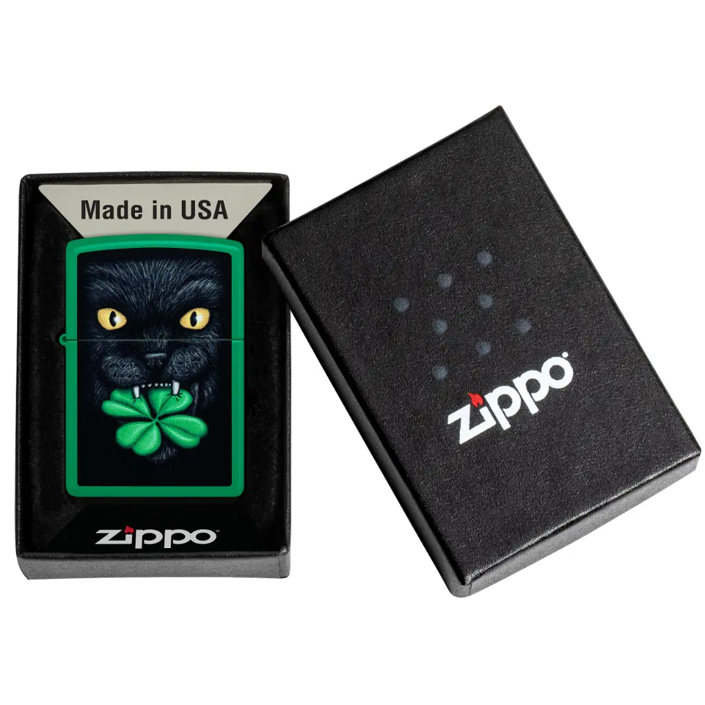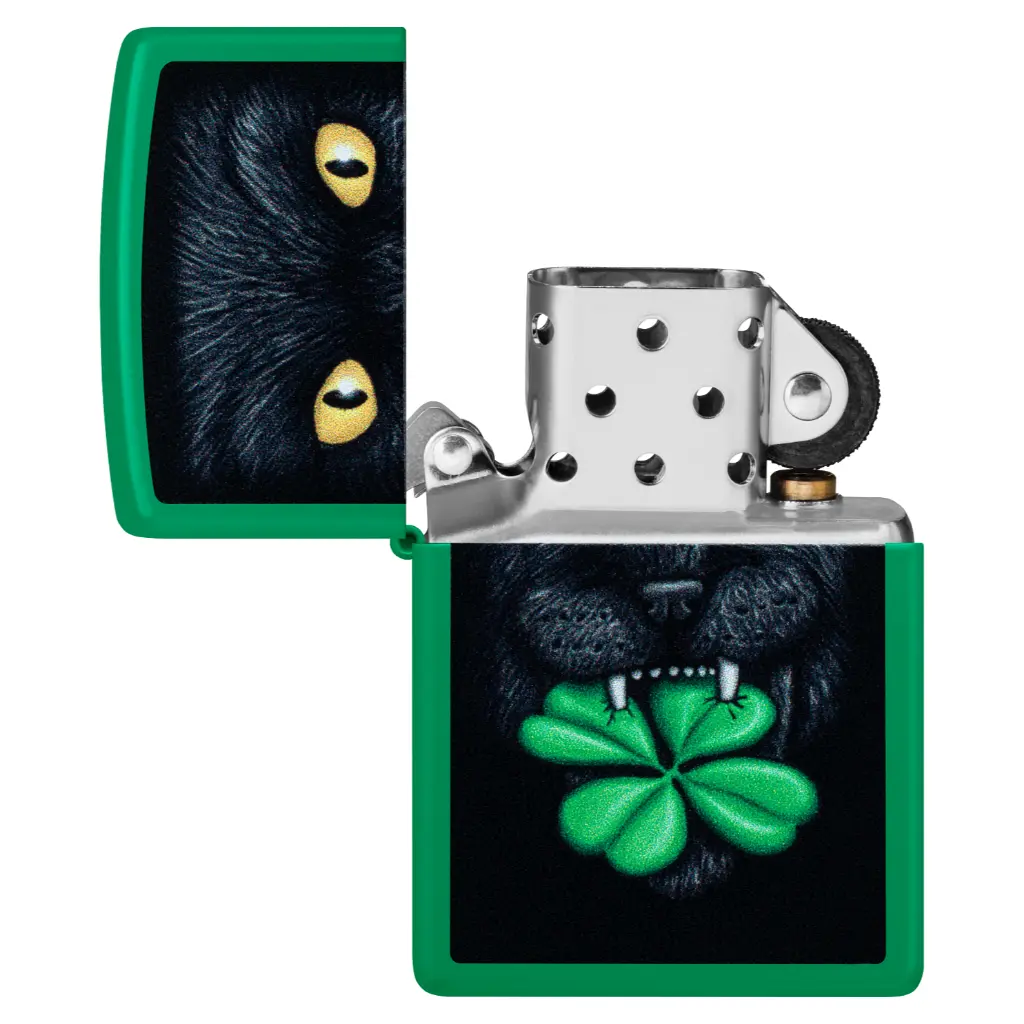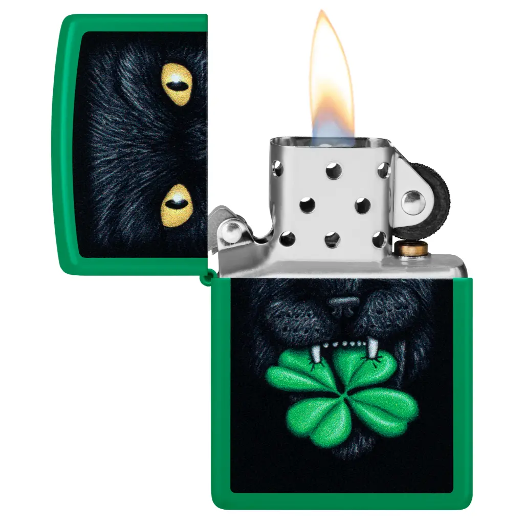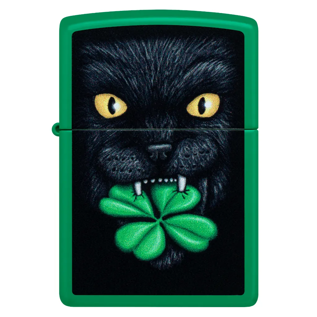 Otjerajte loše nostalgije ovim klasičnim mat upaljačem u boji travnato zelene. Sretna crna mačka hvata djetelinu s četiri lista u zubima u živopisnom dizajnu Color Image.