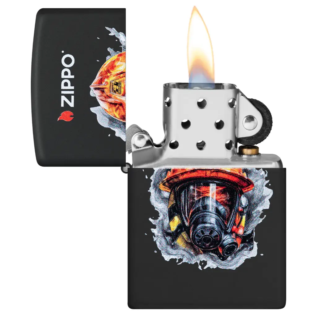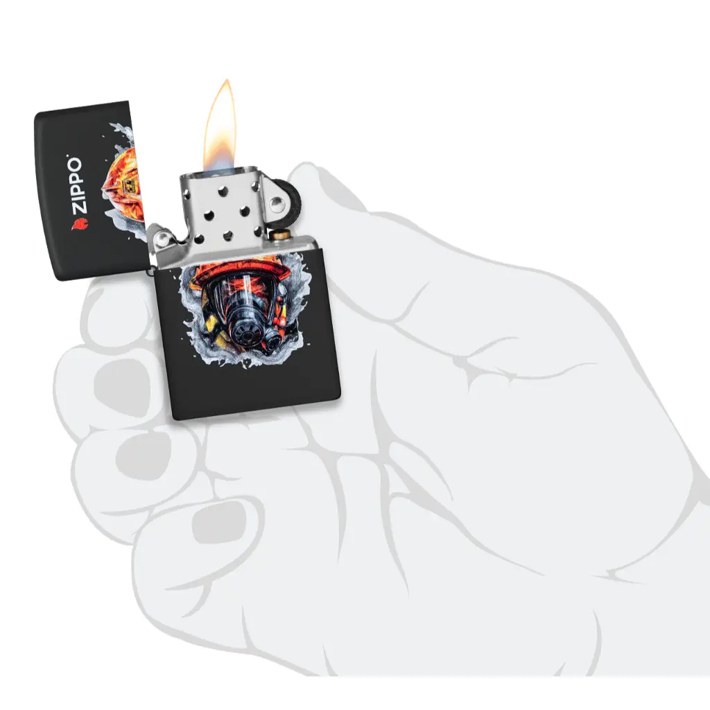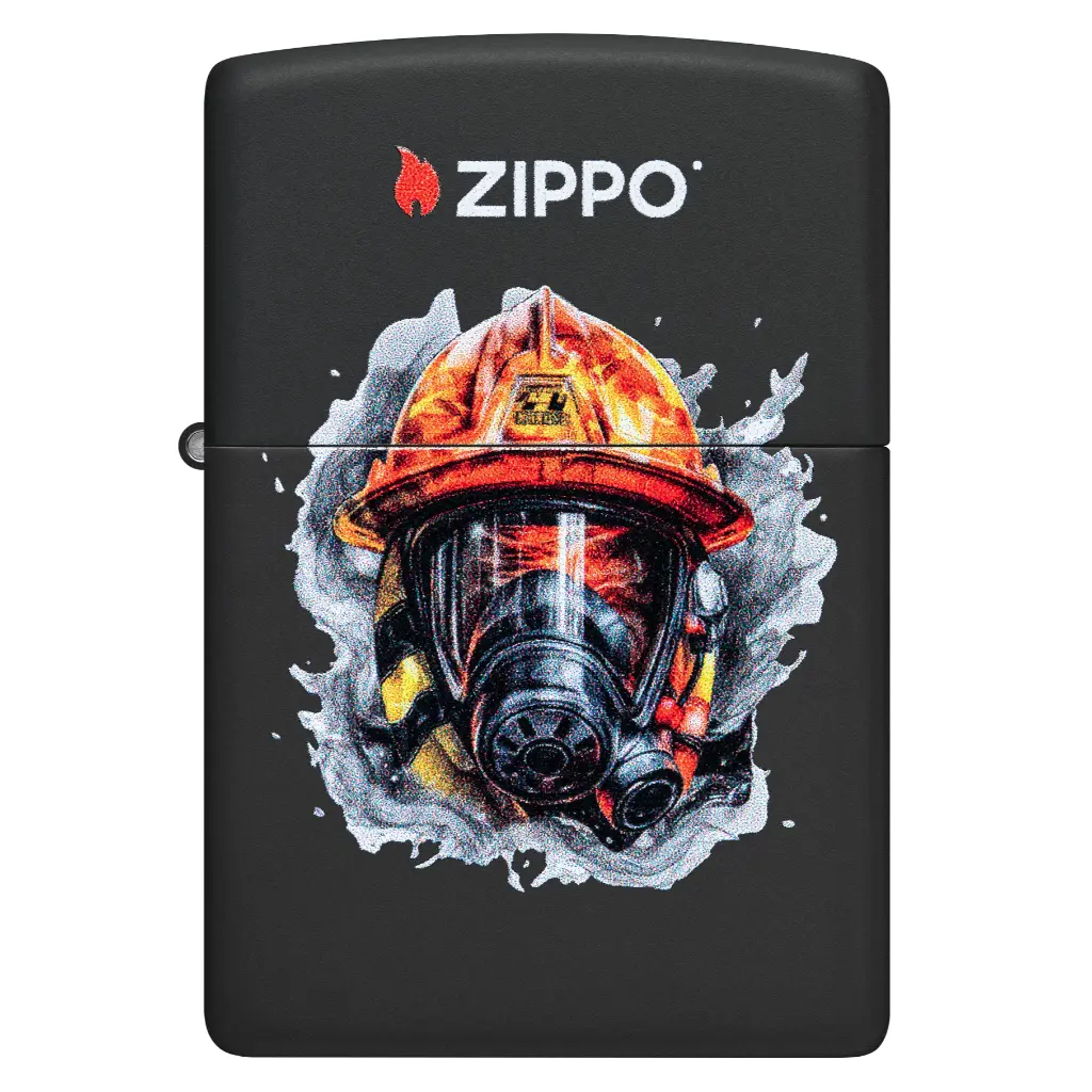 Čini se da vatrogasna kaciga probija površinu ovog klasičnog Black Matte upaljača ispod Zippo logotipa u realističnom dizajnu Color Image.