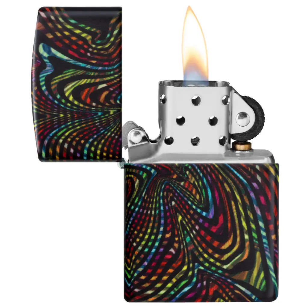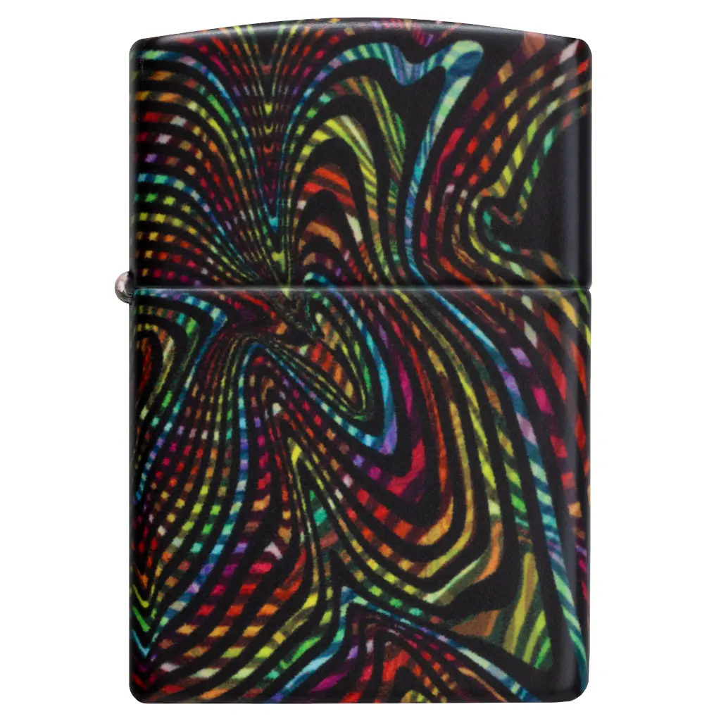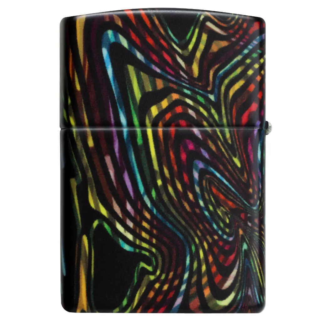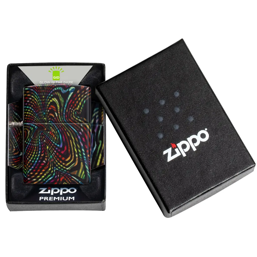 Izgubite se u beskrajnim stazama i uzorcima ovog klasičnog upaljača s 540 boja. Višebojni vrtlozi obavijaju cijeli upaljač, koji svijetli u mraku zahvaljujući našoj posebnoj završnoj obradi. Dolazi pakiran u poklon kutiji.