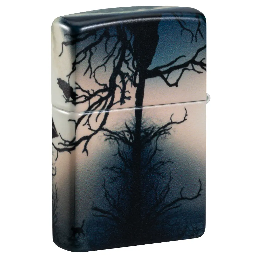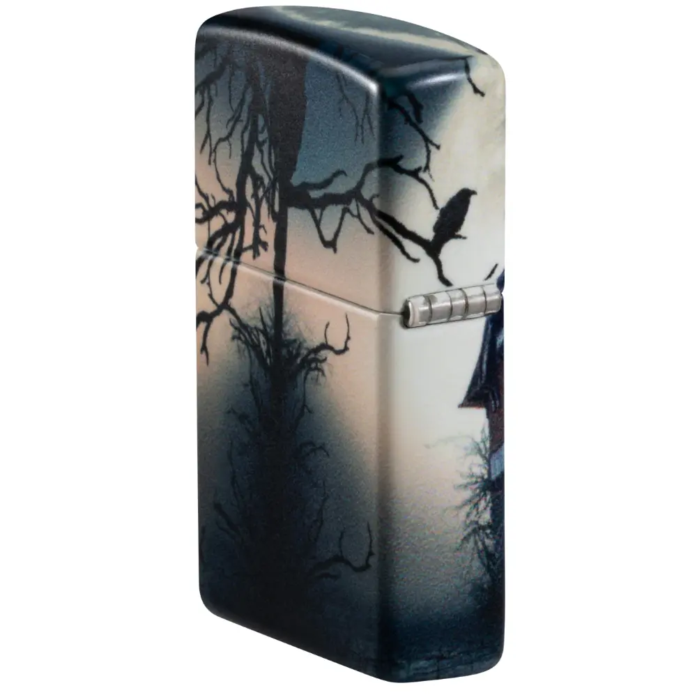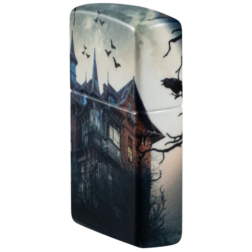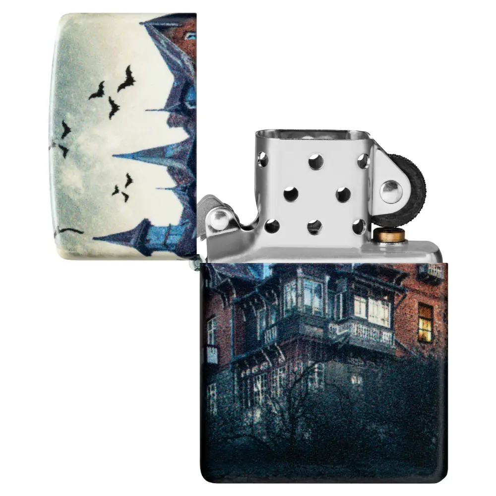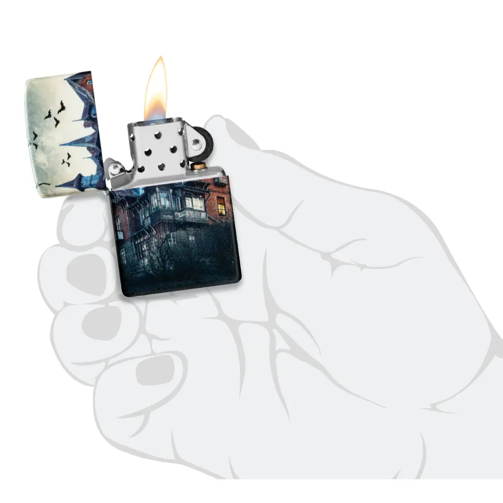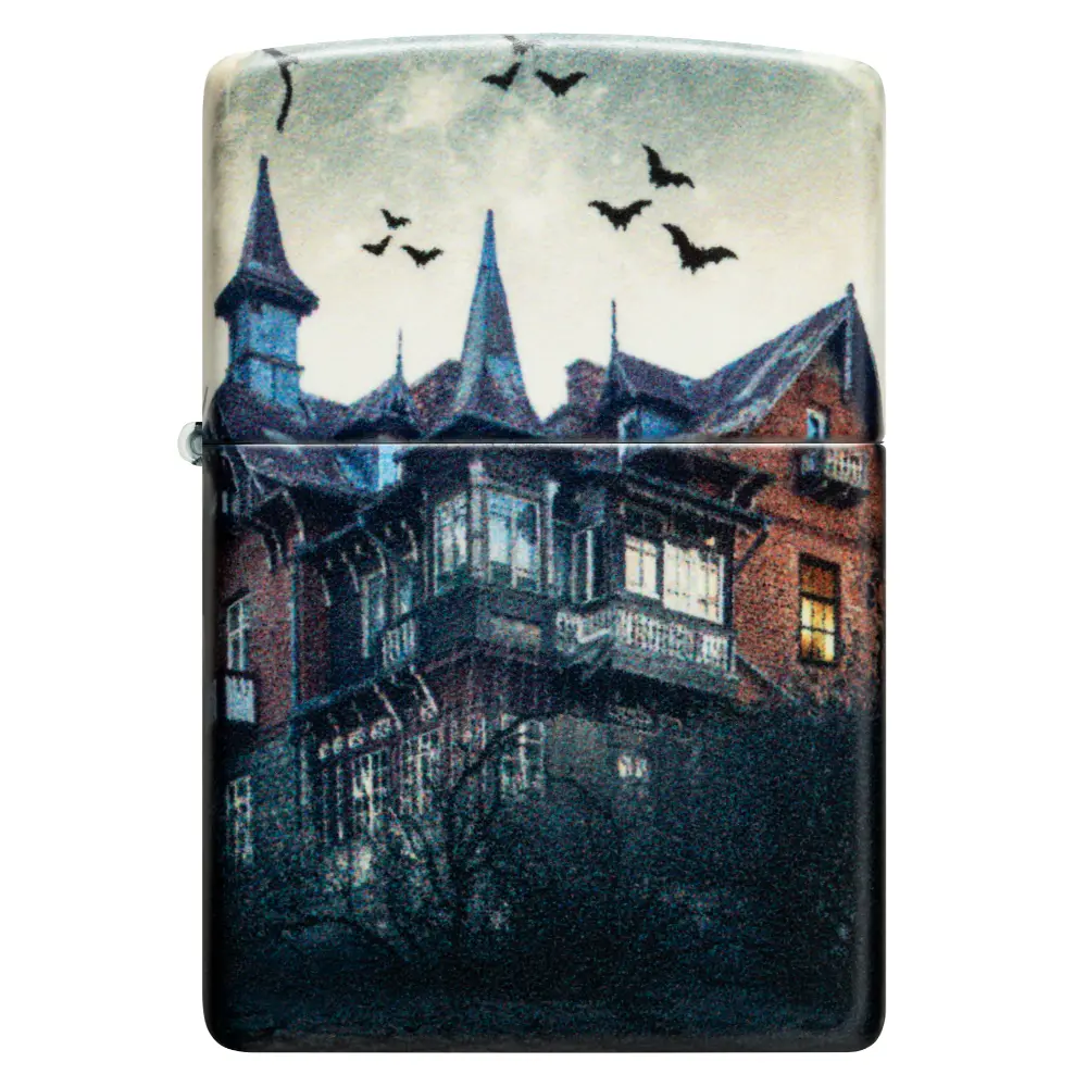 Tamni oblaci i kovitlajući šišmiši okružuju zastrašujuću ukletu kuću na ovom upaljaču od 540 boja. Sablasna scena proteže se oko svih strana upaljača i tretirana je našom specijalnom završnom obradom koja svijetli u tami za dodatni užas.