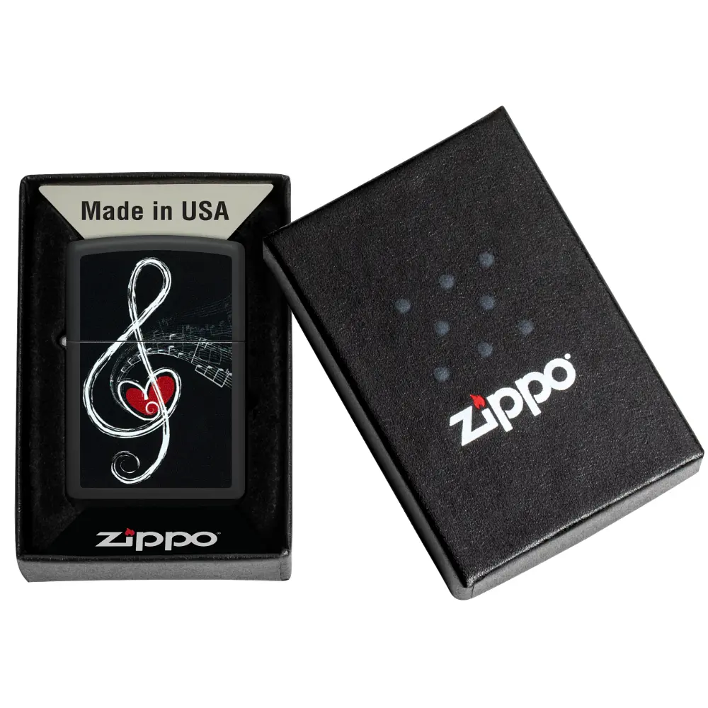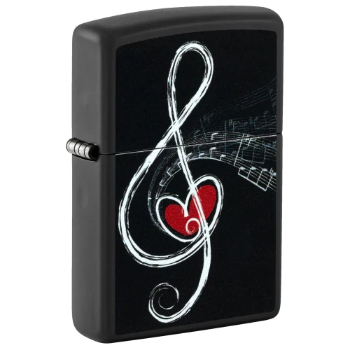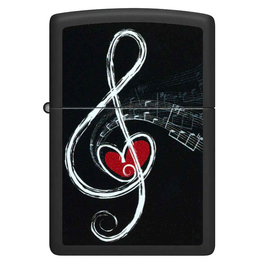 Pokažite svoju ljubav prema glazbi ovim klasičnim crnim mat upaljačem. Glazbene note zrače iz nježnog G ključa, koji se usredotočuje na živo crveno srce u otkačenom dizajnu Color Image. Dolazi pakiran u poklon kutiji.
